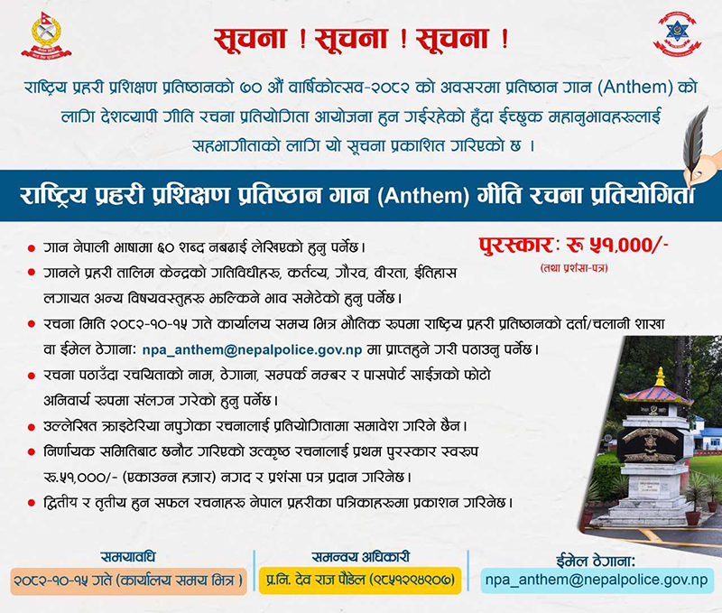 - प्रहरी सहायक निरीक्षक (जनपद) पदमा ORMS प्रणाली मार्फत तोकिएको समयमा आवेदन दिएका उम्मेदवारहरूले अपुग कागजात एवं विवरणहरू अद्यावधिक गर्ने सम्बन्धी सूचना (२०८२-१०-०९)