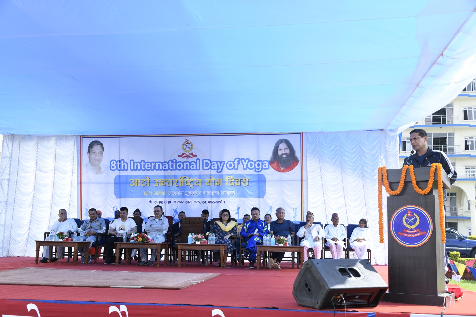 ‘मानवताको लागि योग’ भन्ने नाराका साथ जुन २१ मा विश्वभर आठौं अन्तर्राष्ट्रिय योग दिवस मनाउने क्रममा योगको बारेमा चेतना अभिवृद्धि गर्न कार्यक्रमको आयोजना गरिएको उल्लेख गर्दै प्रहरी महानिरीक्षक सिंहले प्रहरी पेशामा योगको महत्वलाई मध्यनजर गरी नेपाल प्रहरीका विभिन्न तालिम पाठ्यक्रममा योगलाई समेत समावेश गरिएको बताउनुभयो ।