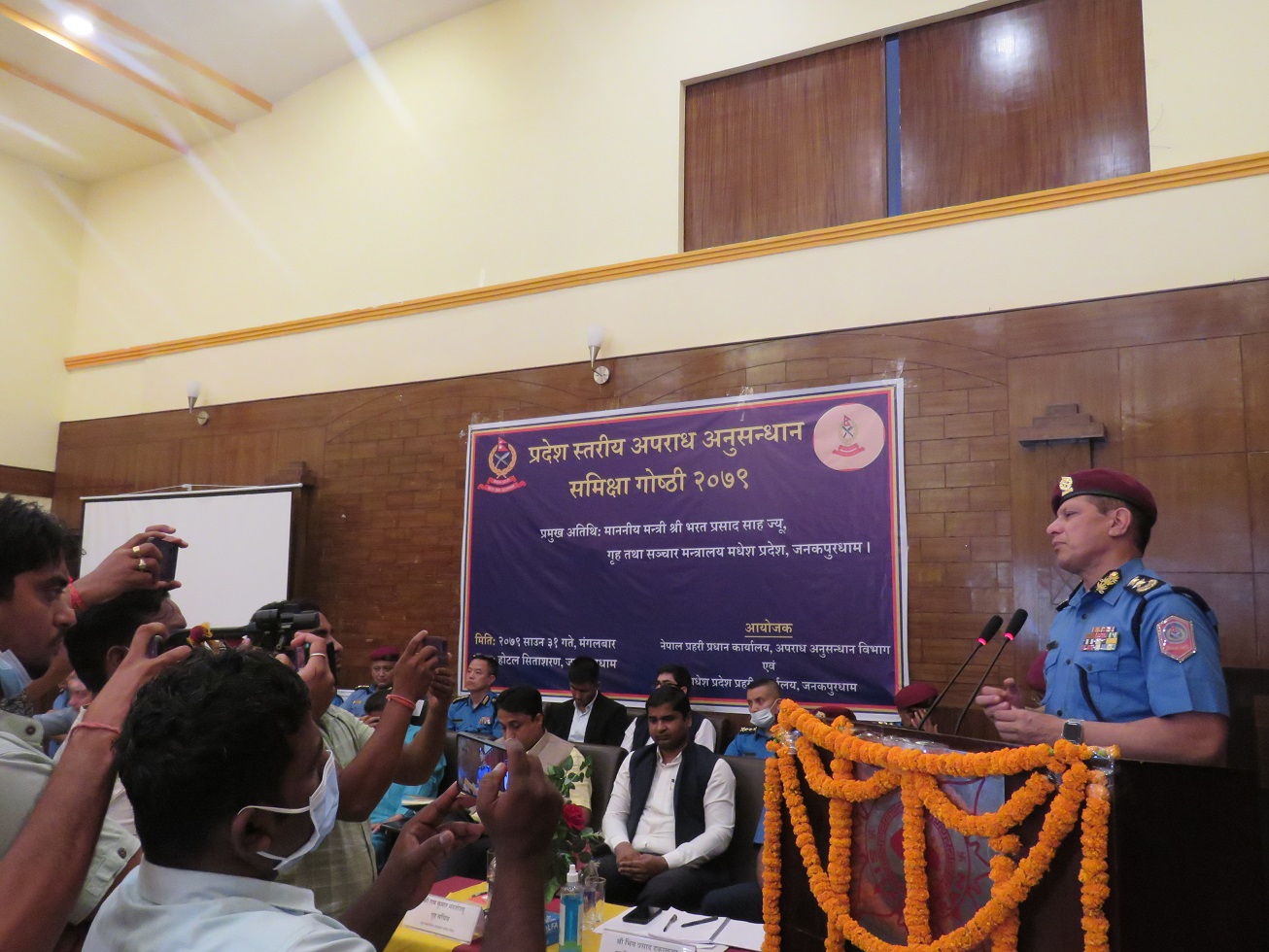 धनुषा, मधेश प्रदेशका गृह तथा सञ्चारमन्त्री भरत प्रसाद साहको प्रमुख आतिथ्यमा नेपाल प्रहरी प्रधान कार्यालय अपराध अनुसन्धान विभाग एवं मधेश प्रदेश प्रहरी कार्यालय जनकपुरधामद्वारा संयुक्त रूपमा आयोजित प्रदेश स्तरीय अपराध अनुसन्धान समीक्षा गोष्ठी २०७९ धनुषाको जनकपुरधाममा मंगलबार सम्पन्न भएको छ ।