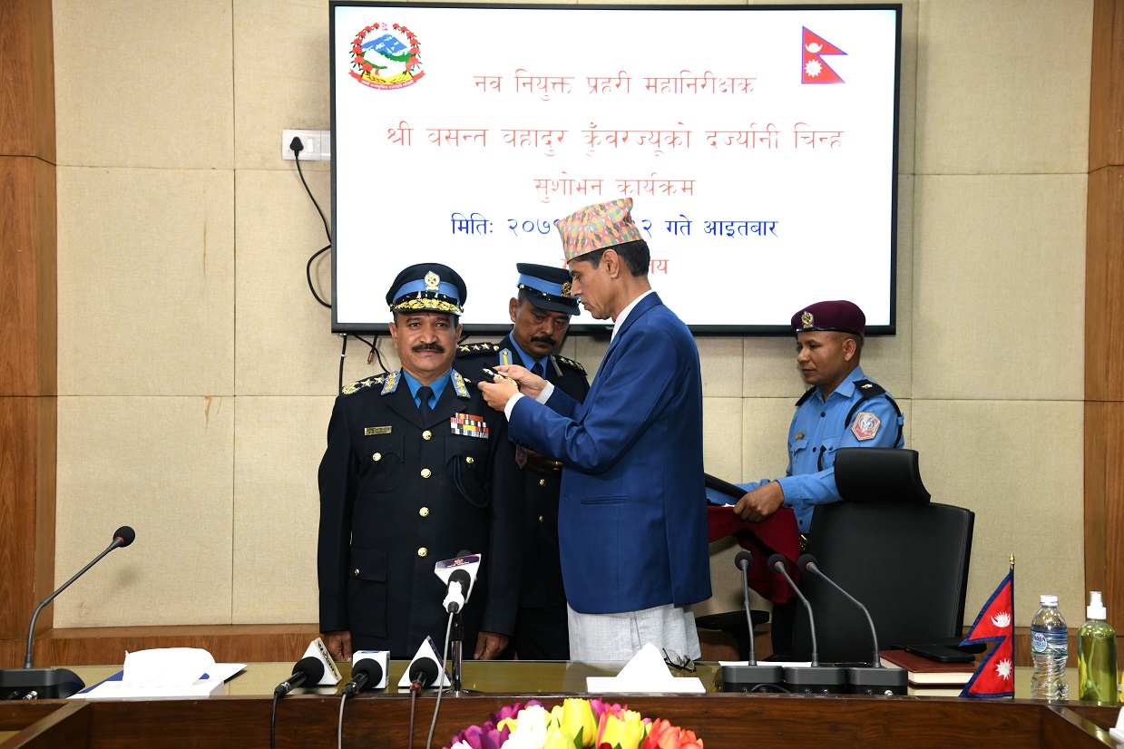 काठमाडौं, नेपाल सरकार मन्त्रिपरिषद्को २०७९ चैत १० गतेको निर्णयअनुसार प्रहरी महानिरीक्षक पदमा पदोन्नति हुनुभएका बसन्त बहादुर कुँवर दर्ज्यानी चिन्हबाट सुशोभित हुनुभएको छ । नेपाल सरकार, गृहमन्त्रालय सिंहदरबारमा आइतबार आयोजित विशेष समारोहबीच गृहसचिव विनोद प्रकाश सिंहले प्रहरी महानिरीक्षक बसन्त बहादुर कुँवरलाई दर्ज्यानी चिन्हबाट सुशोभन गर्नुभएको हो ।