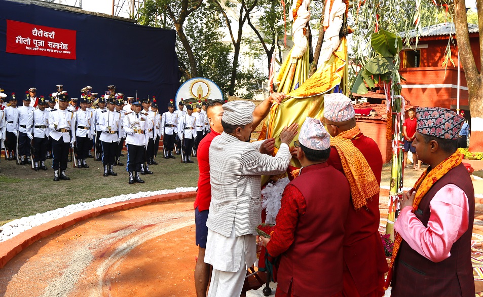 काठमाडौं, प्रहरी महानिरीक्षक बसन्त बहादुर कुँवरले चैते दशैंका अवसरमा बुधबार नेपाल प्रहरी सशस्त्र प्रहरी गण नम्बर १ नक्सालस्थित मौलोमा पूजाअर्चना तथा सङ्कल्प पूजा गर्नुभयो ।