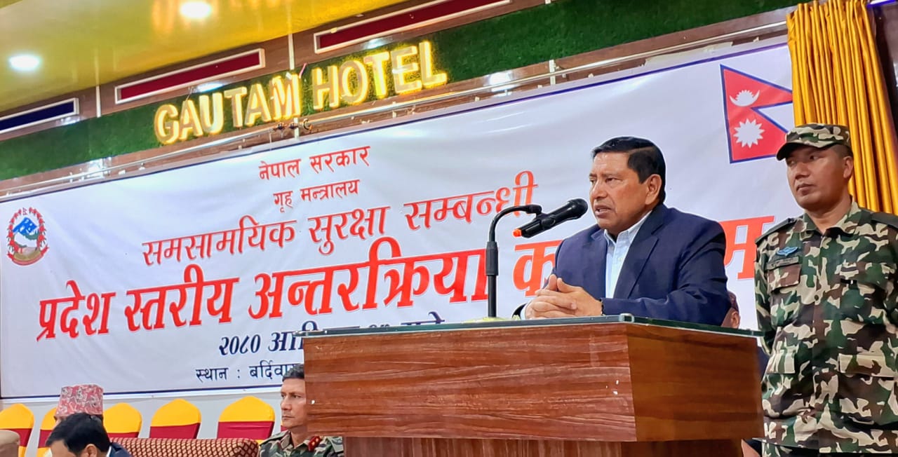 महोत्तरीको बर्दिवासस्थित गौतम होटलमा बुधबार आयोजित समसामयिक सुरक्षा सम्बन्धी प्रदेश स्तरीय अन्तरक्रिया कार्यक्रमलाई सम्बोधन गर्दै उपप्रधानमन्त्री एवम् गृहमन्त्री श्रेष्ठले उक्त कुरा बताउनुभएको हो । साथै उहाँले सबै सुरक्षा निकायहरू एकातावद्ध भएर निर्दिष्ट जिम्मेवारी पूरा गर्न यस अन्तरक्रियाले स्पष्टता र उर्जा प्रदान गरेकोले सोही अनुरूप सुरक्षा निकाय क्रियाशील हुने विश्वास व्यक्त गर्नुभयो । चाडपर्वलाई लक्षित गरेर शान्ति सुरक्षाको अवस्था मजबुद, यातायात तथा दैनिक उपभोग्य वस्तुहरूको उपलब्धतामा सहज पहुँच गराउन ध्यान दिनुपर्नेमा उहाँले जोड दिनुभयो ।