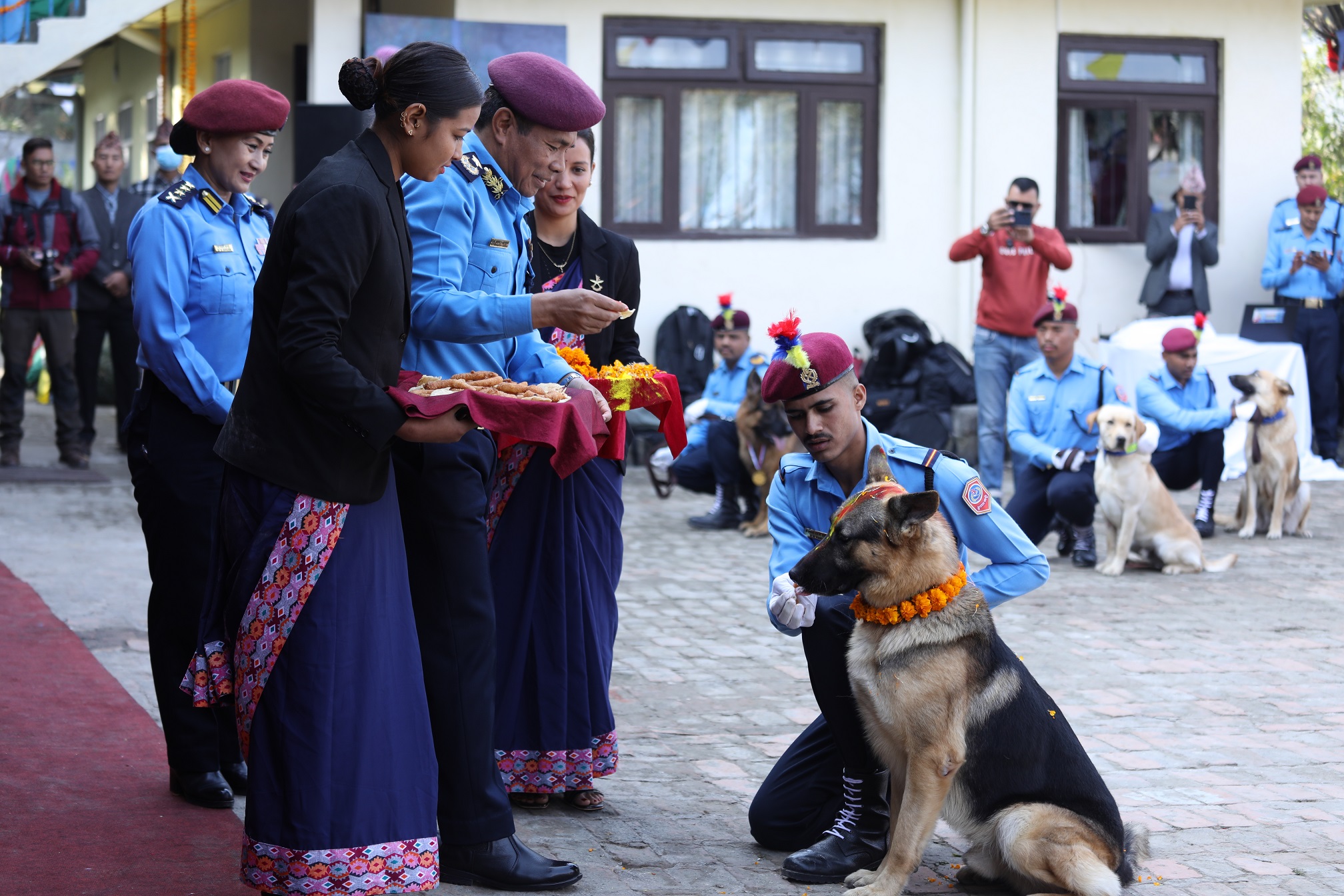 काठमाडौं, यमपञ्चकको दोस्रो दिन अर्थात कुकुर तिहारका अवसरमा नेपाल प्रहरी केनाईन कार्यालय महाराजगंजमा आइतबार आयोजित कार्यक्रमबीच कुकुर पूजा सम्पन्न भएको छ ।