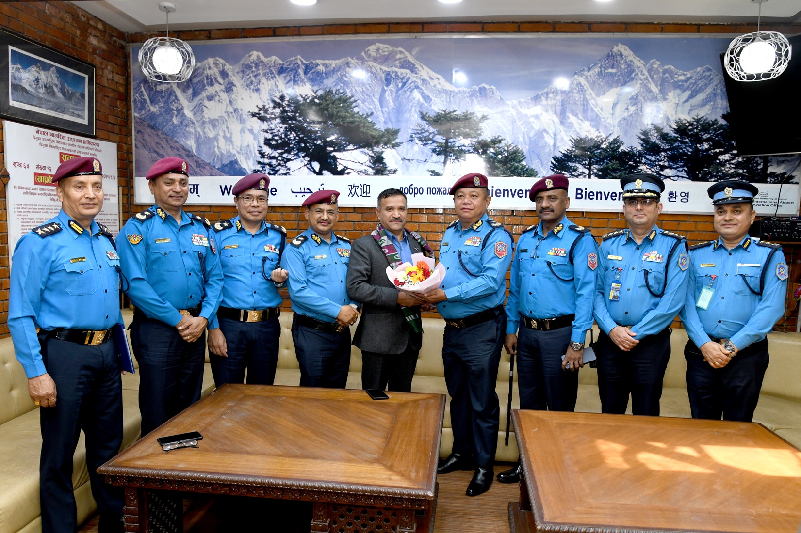 प्रहरी महानिरीक्षक कुँवरलाई त्रिभुवन अन्तर्राष्ट्रिय विमानस्थल गौचरमा प्रहरी अतिरिक्त महानिरीक्षकहरू, प्रहरी नायव महानिरीक्षकहरु लगायत वरिष्ठ प्रहरी अधिकृतहरुले हार्दिक स्वागत गर्नुभयो ।