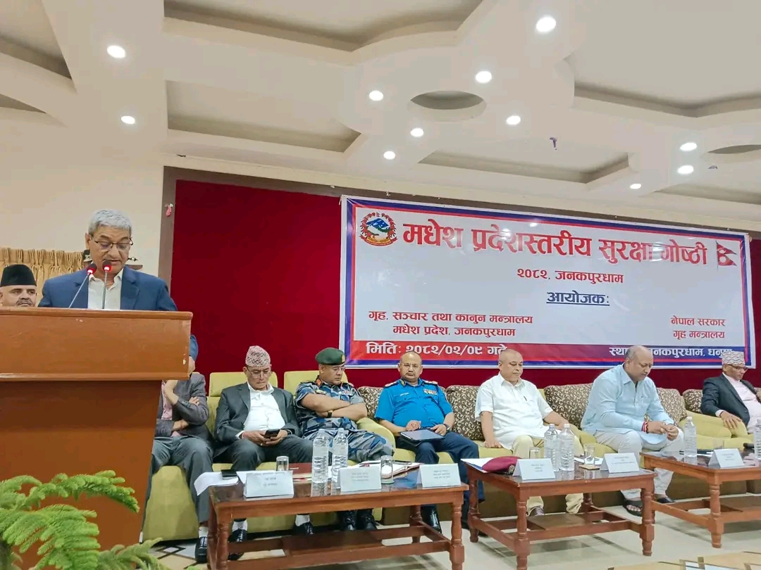 धनुषा, गृहमन्त्री रमेश लेखकको प्रमुख आतिथ्यतामा शुक्रबार आयोजित कार्यक्रमबीच मधेश प्रदेश स्तरीय सुरक्षा गोष्ठी, २०८२ धनुषामा सम्पन्न भएको छ । नेपाल सरकार गृहमन्त्रालय र गृह, संचार तथा कानून मन्त्रालय मधेश प्रदेशद्वारा संयुक्त रूपमा उक्त गोष्ठी आयोजना गरिएको हो ।