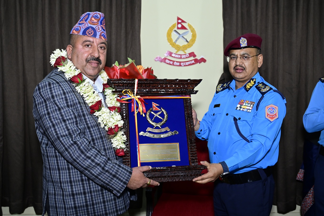 सो अवसरमा प्रहरी महानिरीक्षक दिपक थापाले सेवानिवृत्त हुनु भएका प्रहरी अतिरिक्त महानिरीक्षक लालमणी आचार्यलाई मायाको चिनो प्रदान गर्नुभयो ।