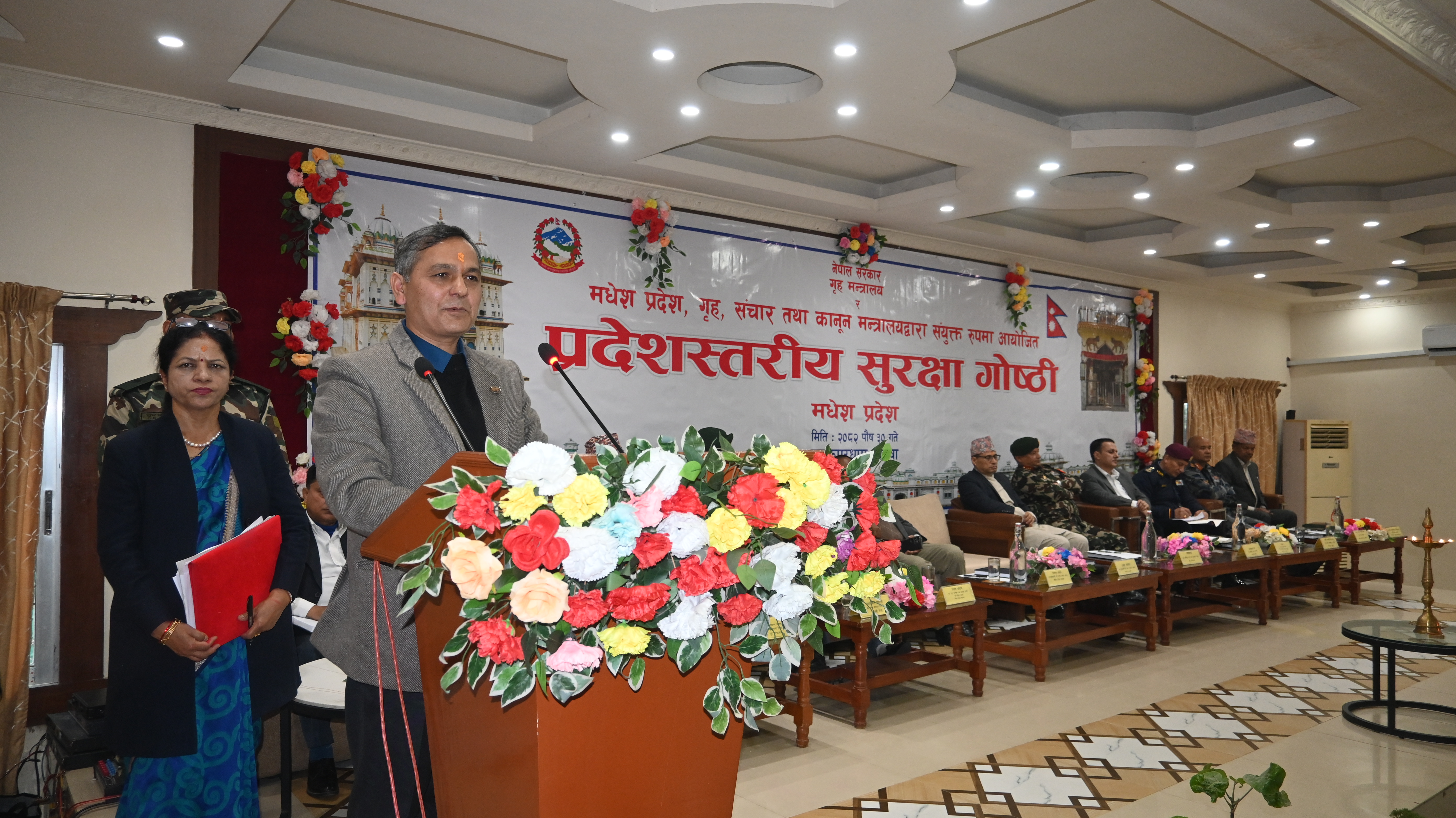 धनुषा, गृहमन्त्री ओमप्रकाश अर्यालको प्रमुख आतिथ्यतामा बुधबार आयोजित कार्यक्रमबीच एकदिवसीय मधेश प्रदेशस्तरीय सुरक्षा गोष्ठी, २०८२ जनकपुरमा सम्पन्न भएको छ । नेपाल सरकार गृह मन्त्रालय र गृह सञ्चार तथा कानुन मन्त्रालय मधेश प्रदेशद्वारा संयुक्त रूपमा उक्त गोष्ठी आयोजना गरिएको हो ।