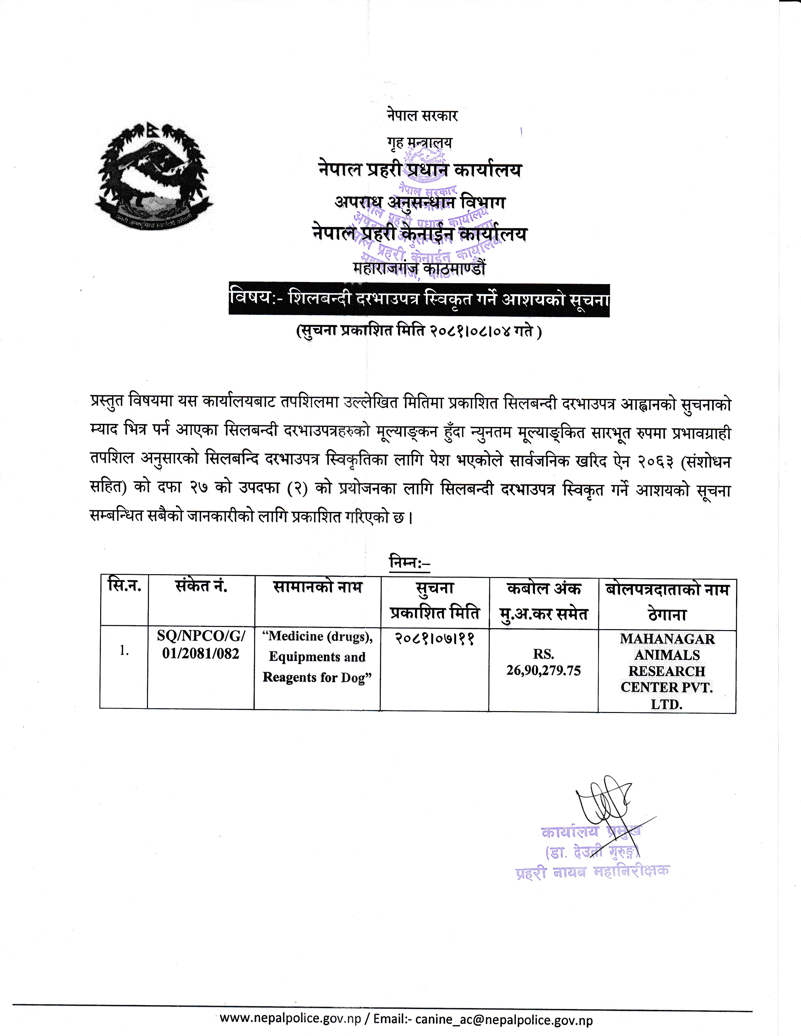 शिलबन्दी दरभाउपत्र स्विकृत गर्ने आशयको सुचना।