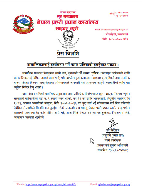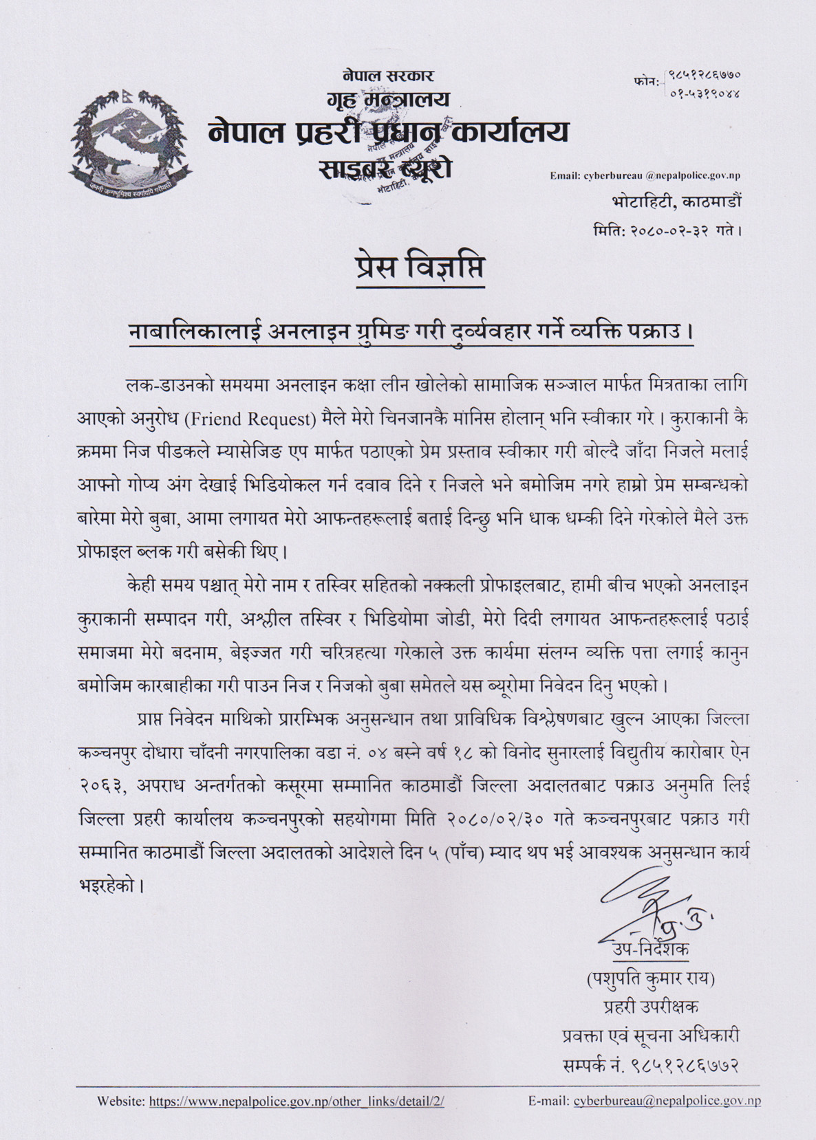 - नाबालिकालाई अनलाइन दुर्व्यवहार गर्ने व्यक्ति पक्राउ । (२०८०-०२-१२)