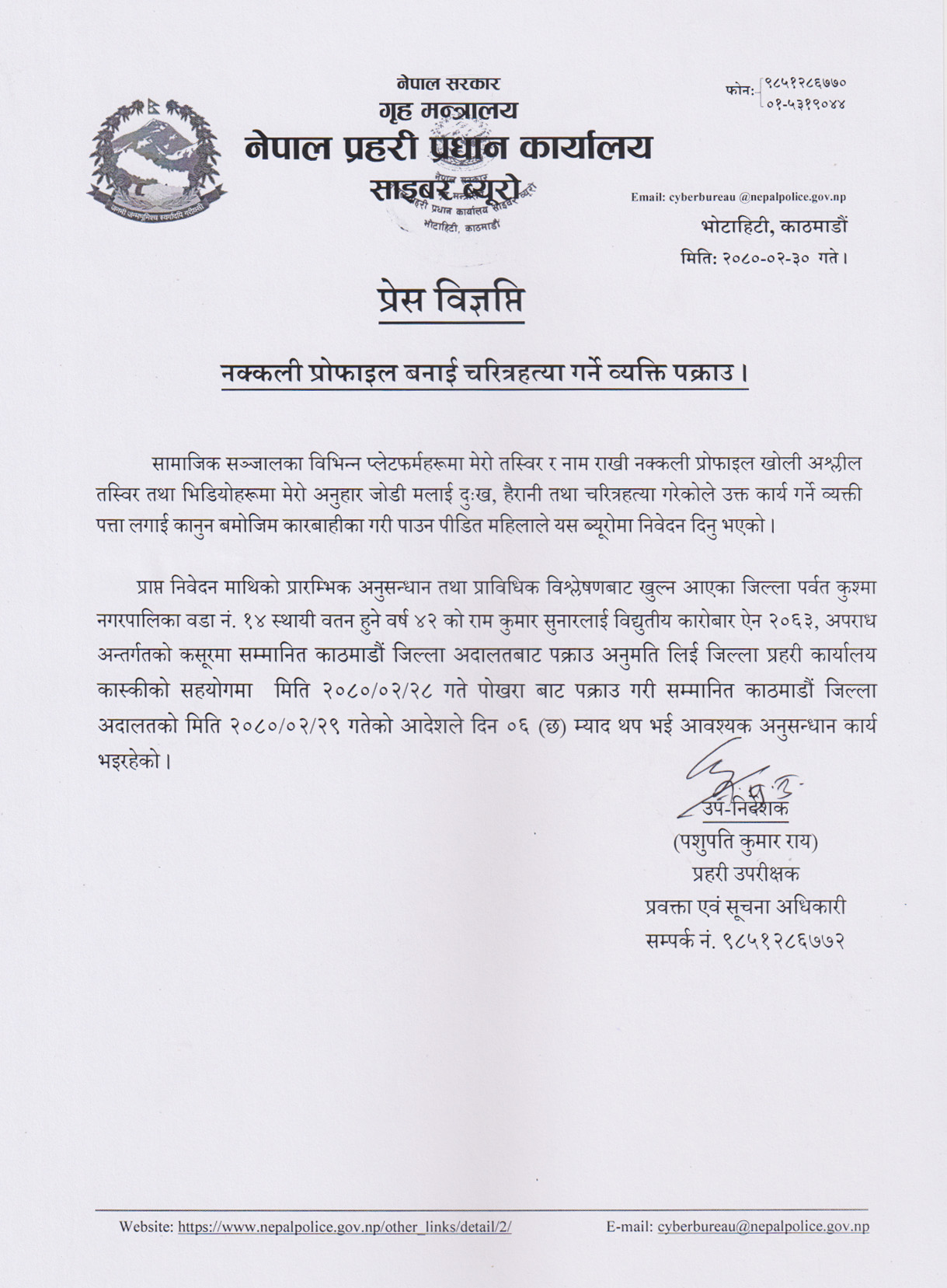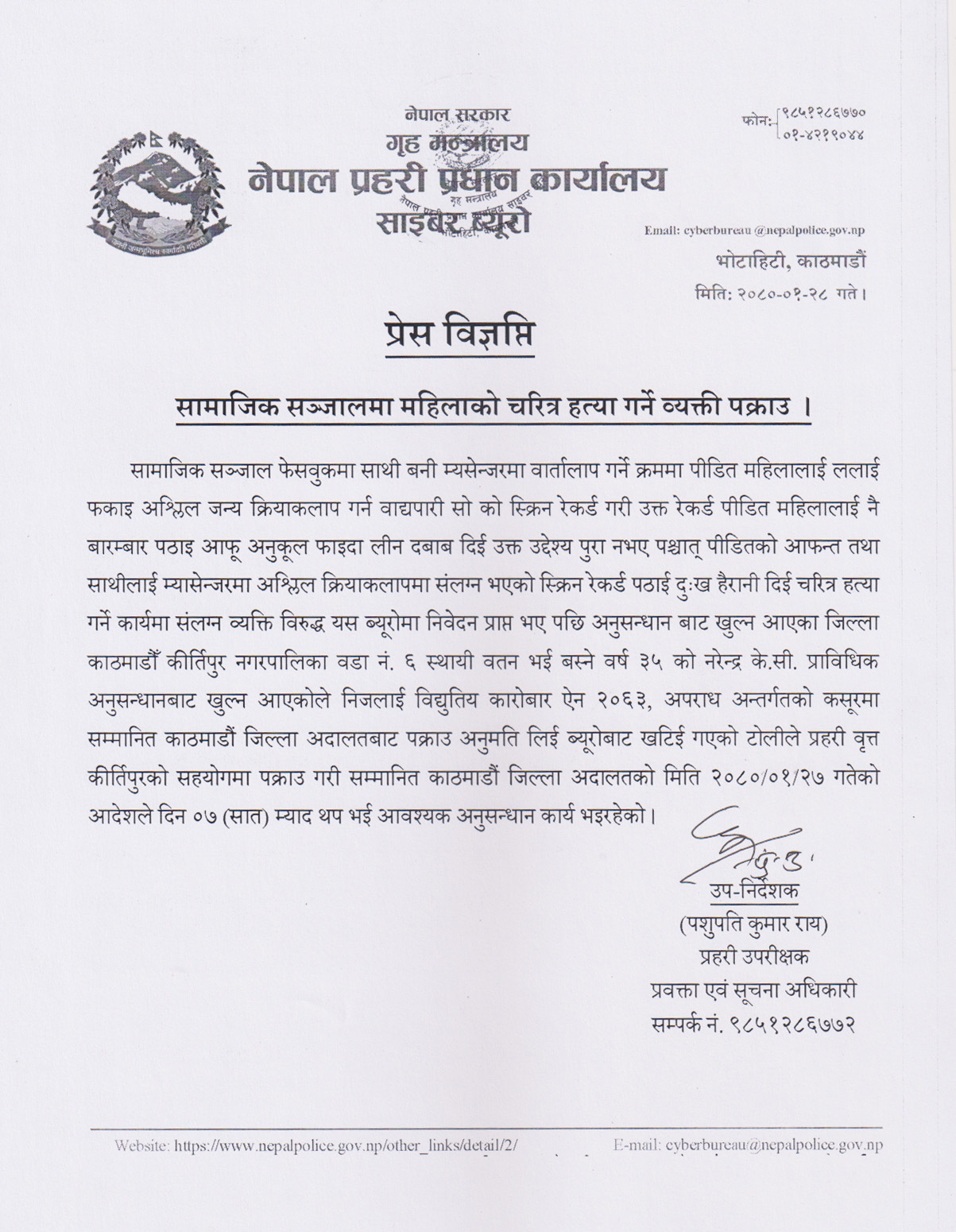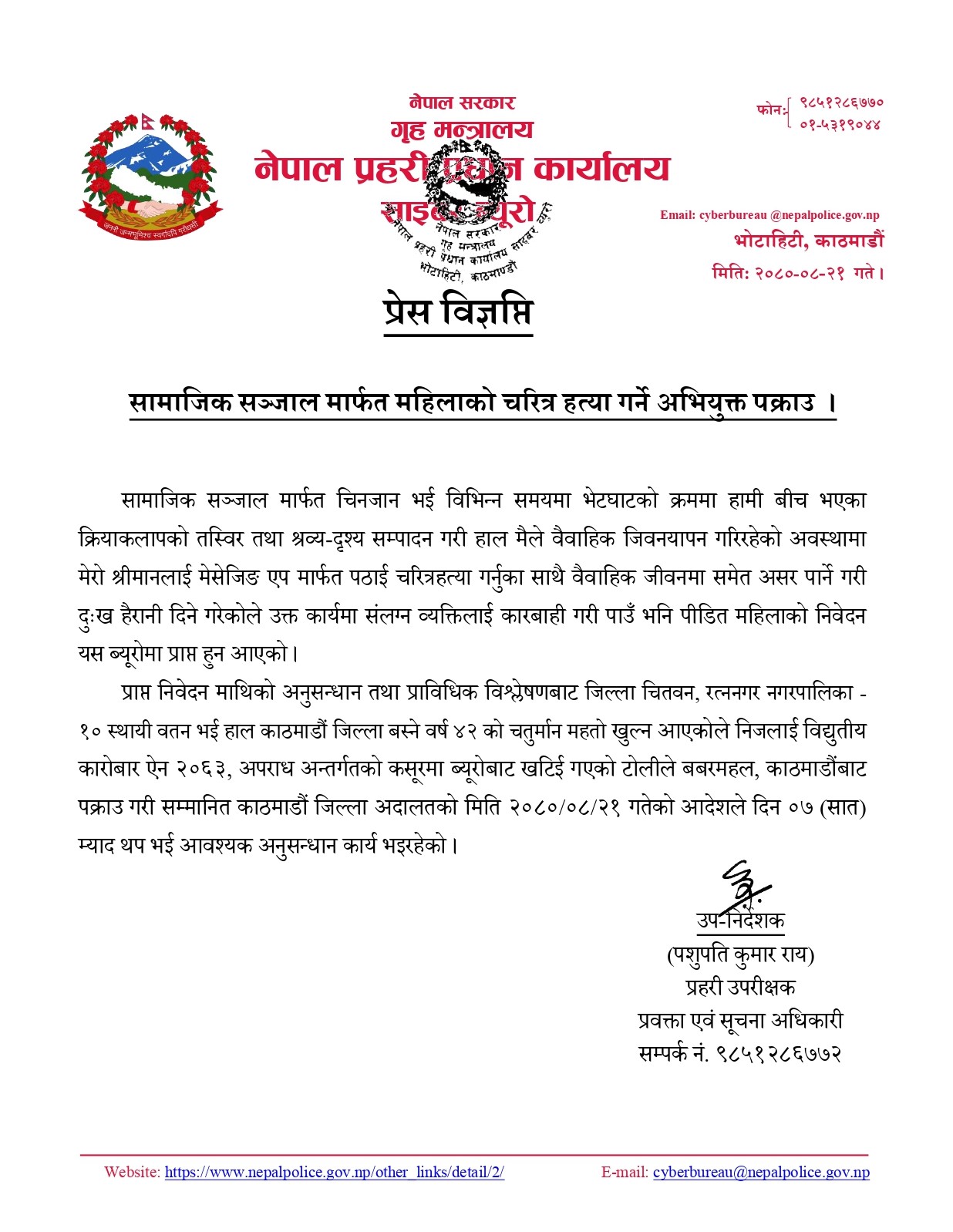 - सामाजिक सञ्जालको दुरुपयोग गरी महिलाको चरित्र हत्या गर्ने व्यक्ती पक्राउ । (२०७९-०७-२०)