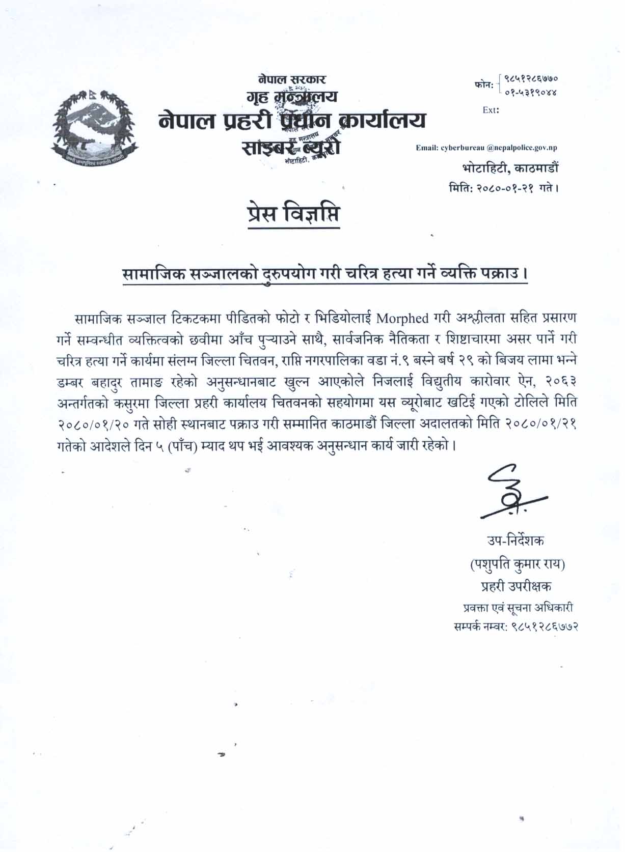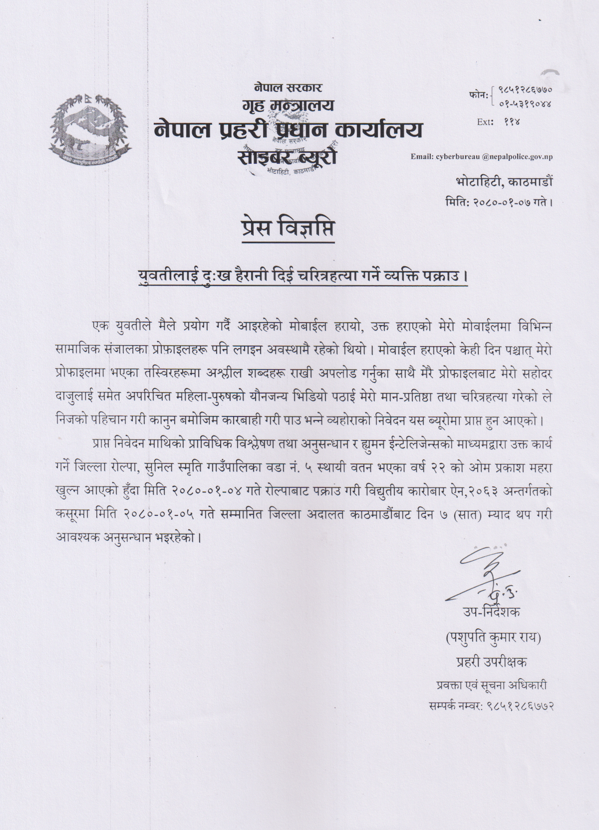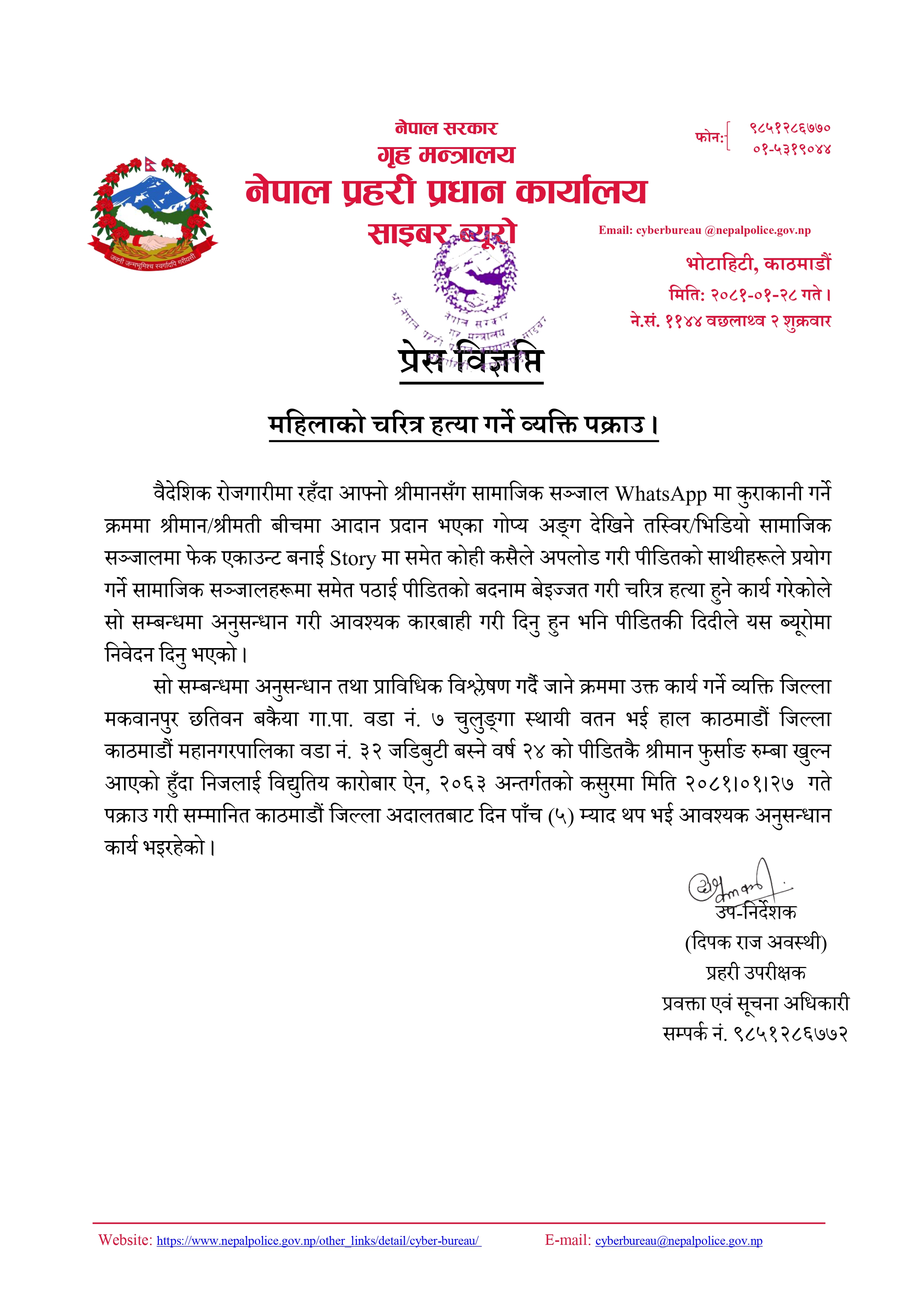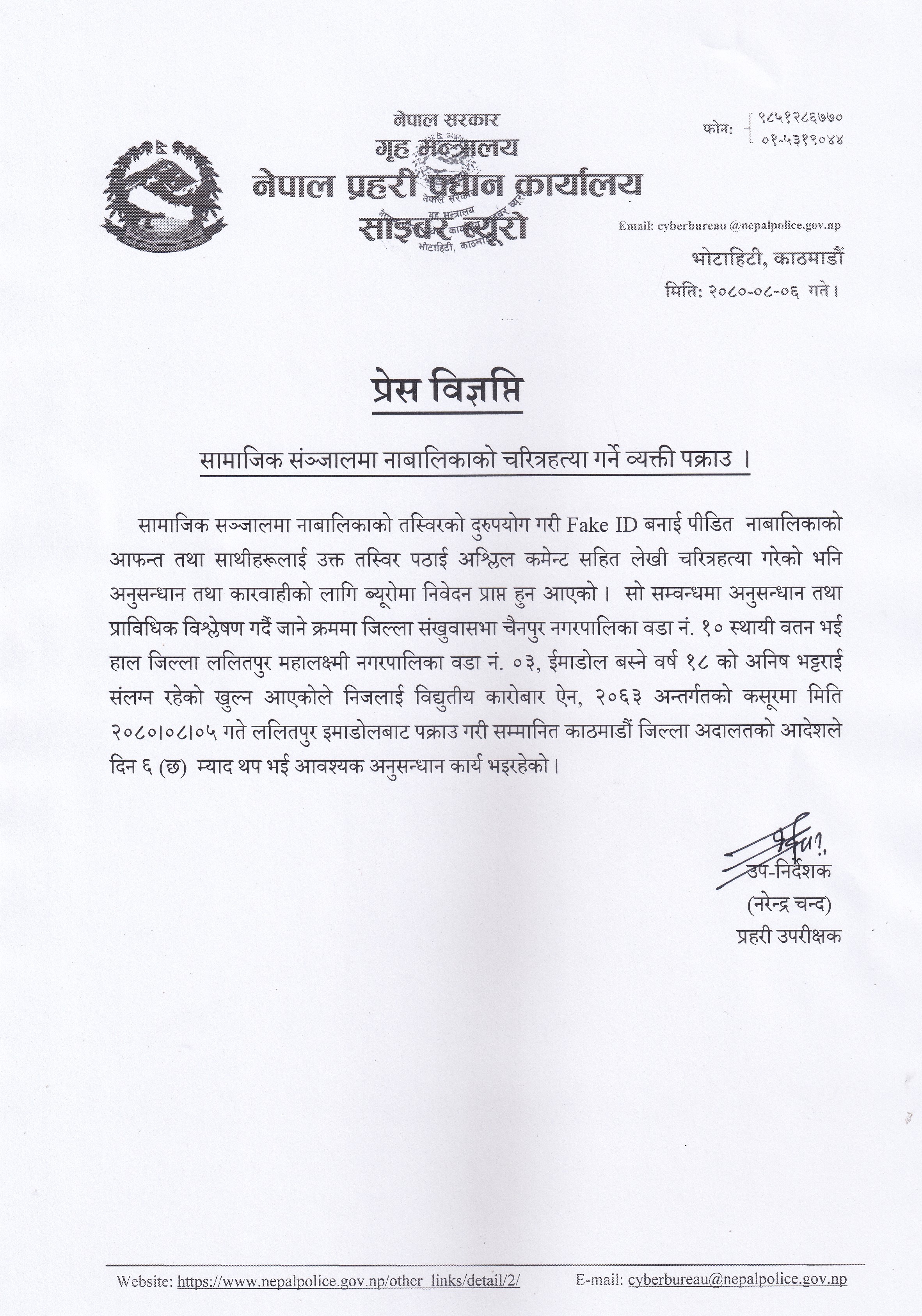 - सामाजिक सञ्जालको दुरुपयोग गरी महिलाको चरित्र हत्या गर्ने व्यक्ती पक्राउ । (२०७९-०७-२०)