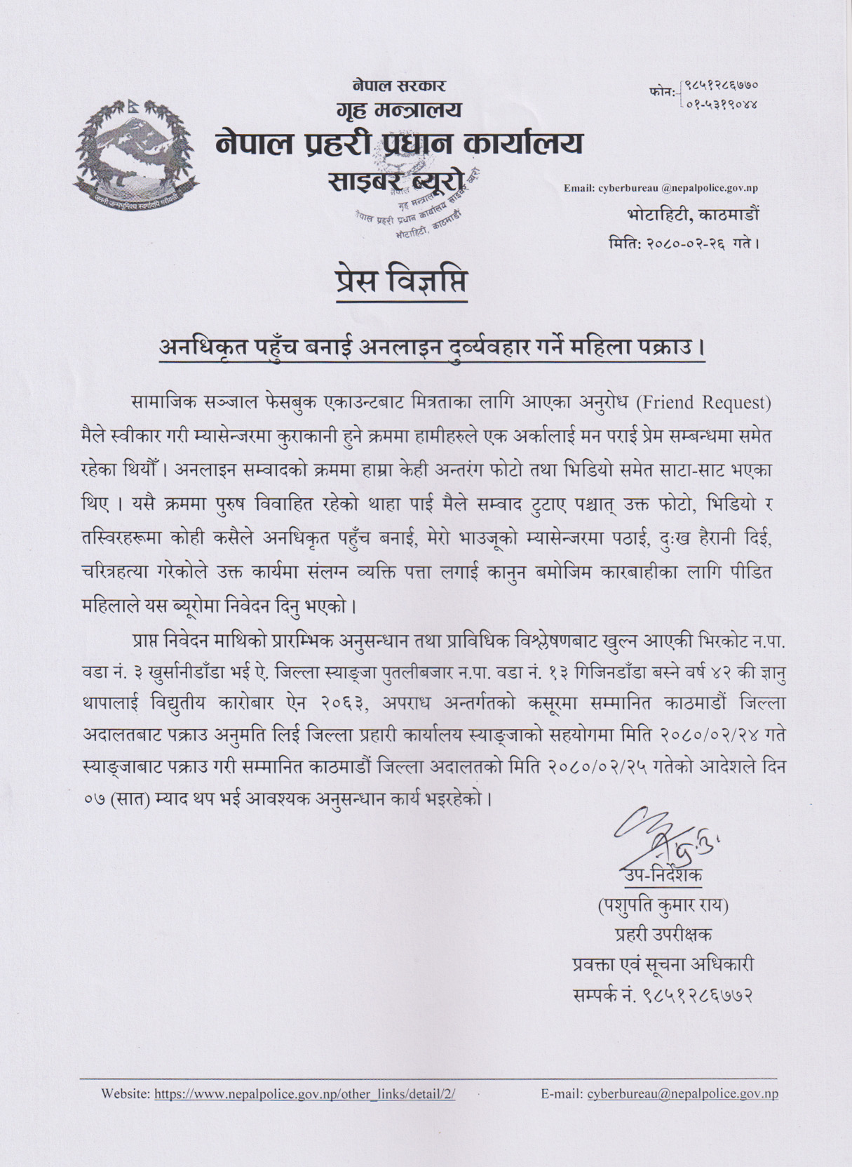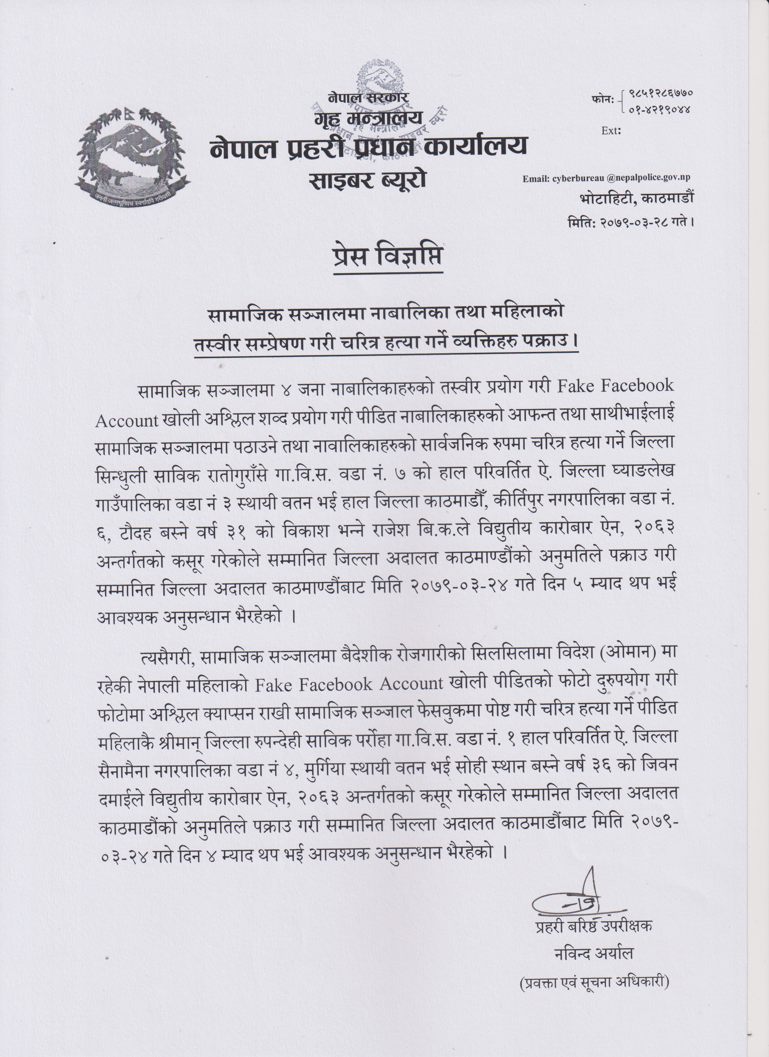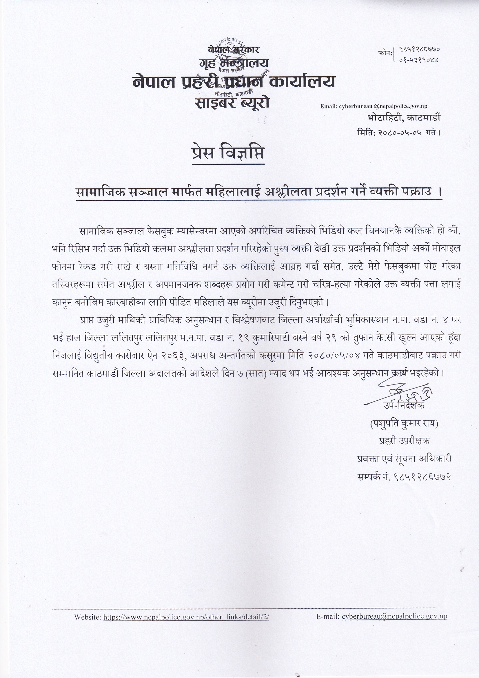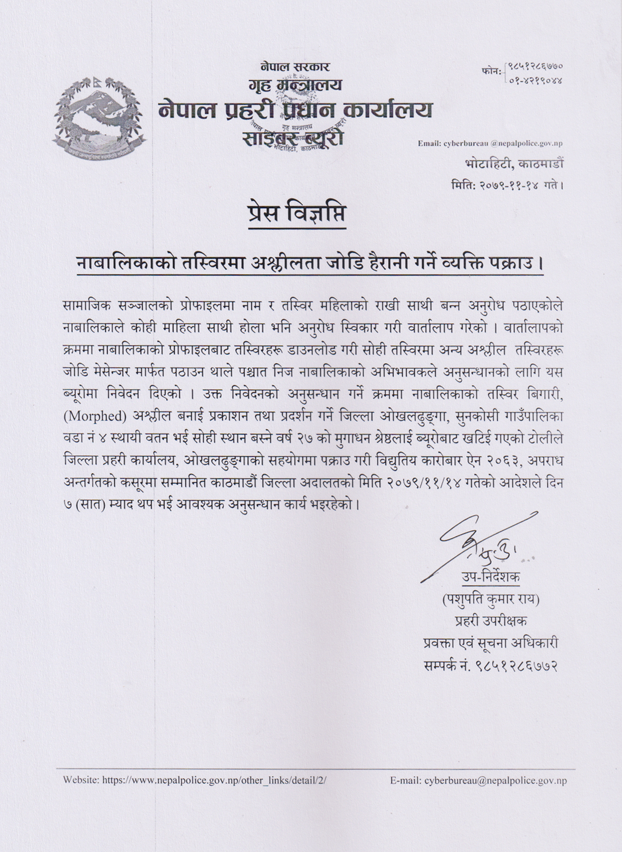 - सामाजिक सञ्जाल मार्फत नाबालिका र महिलालाई दु:ख, हैरानी तथा अपमान गर्ने व्यक्तीहरु पक्राउ । (२०७९-०५-१५)