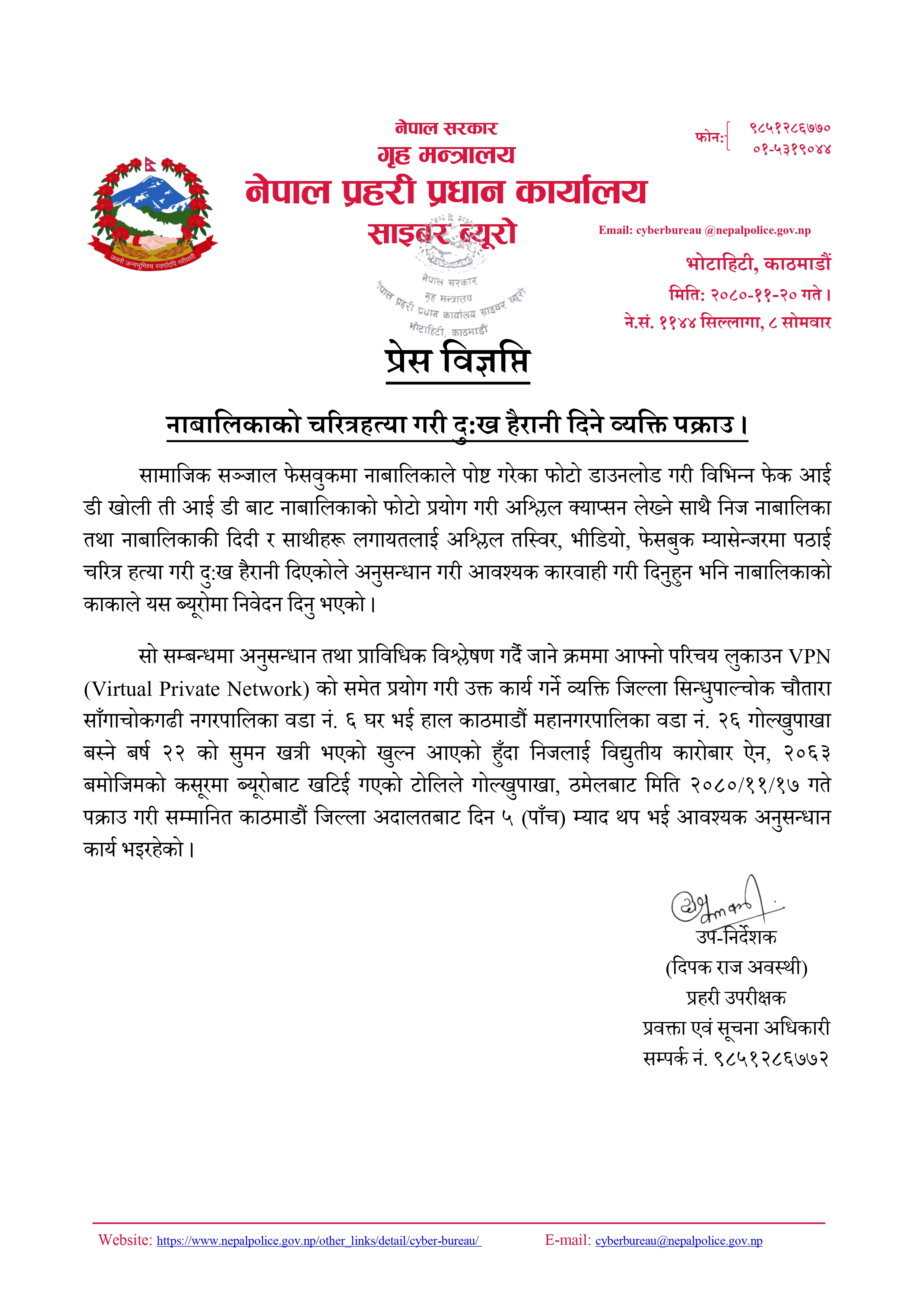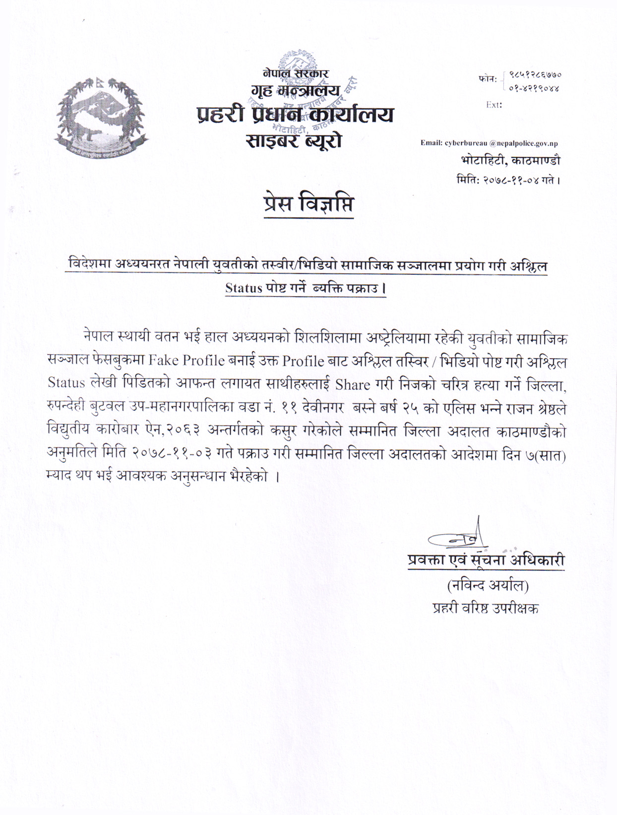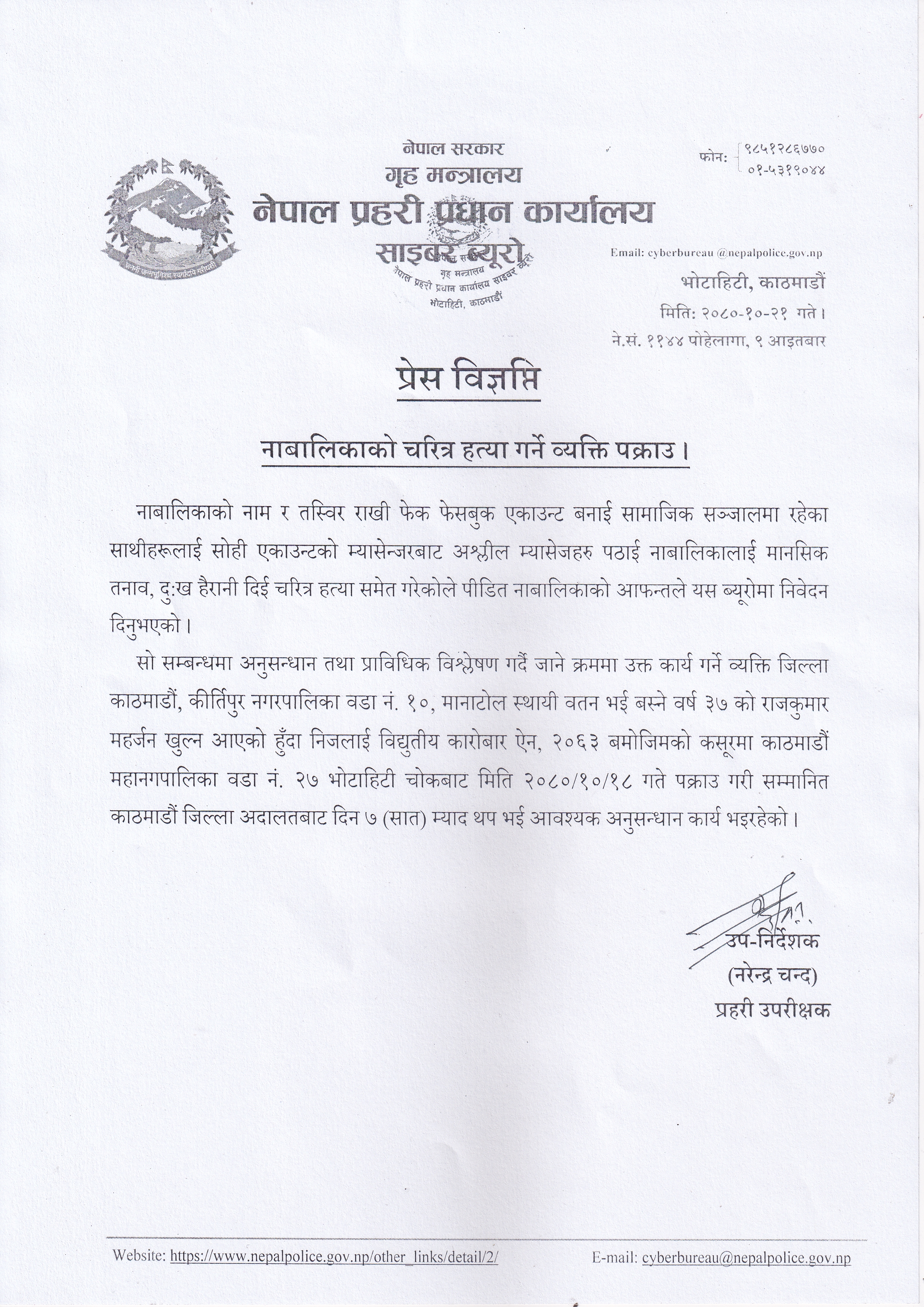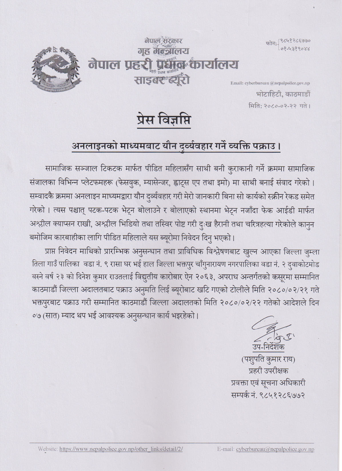 - सामाजिक सञ्जाल मार्फत नाबालिका र महिलालाई दु:ख, हैरानी तथा अपमान गर्ने व्यक्तीहरु पक्राउ । (२०७९-०५-१५)