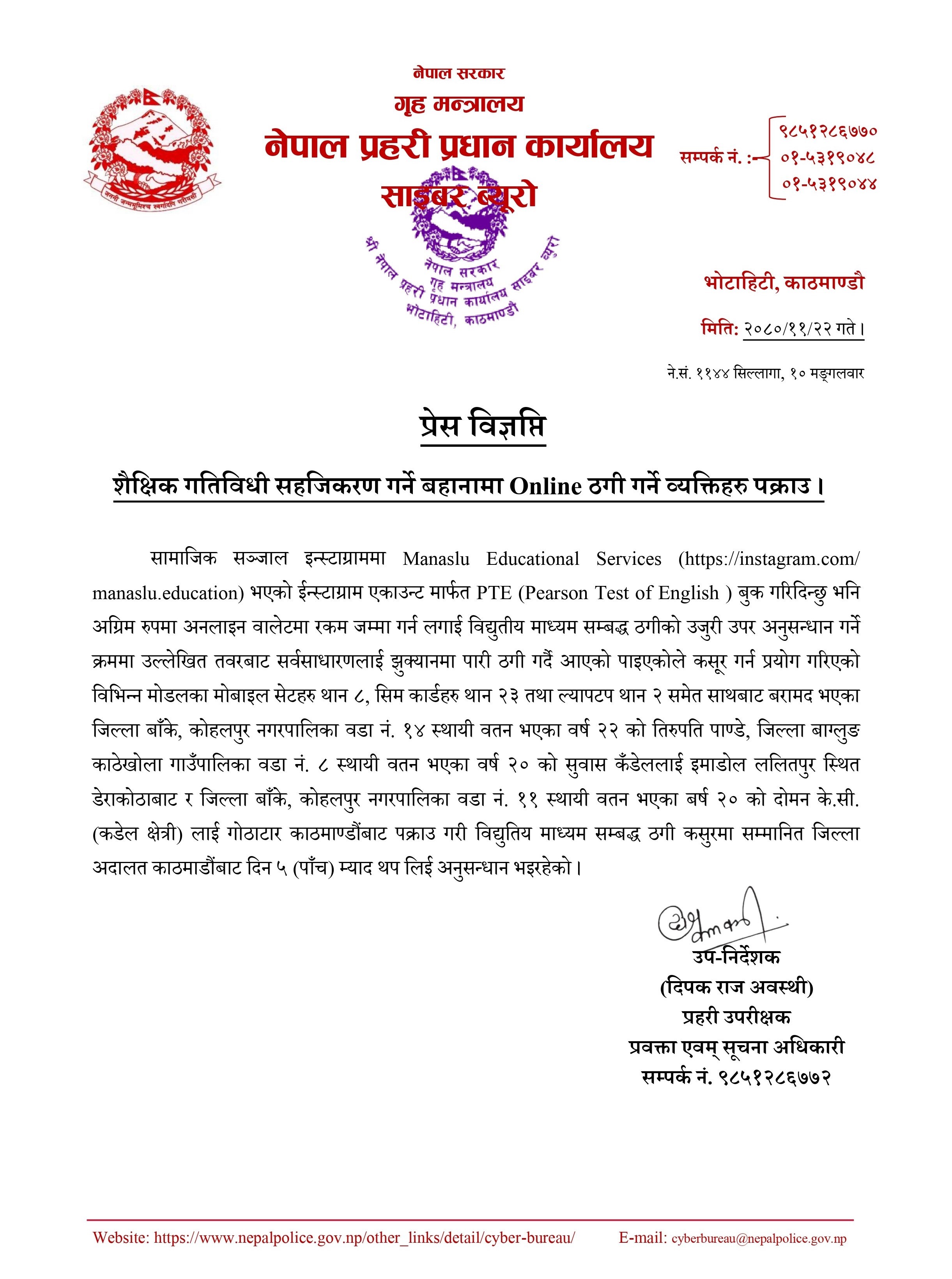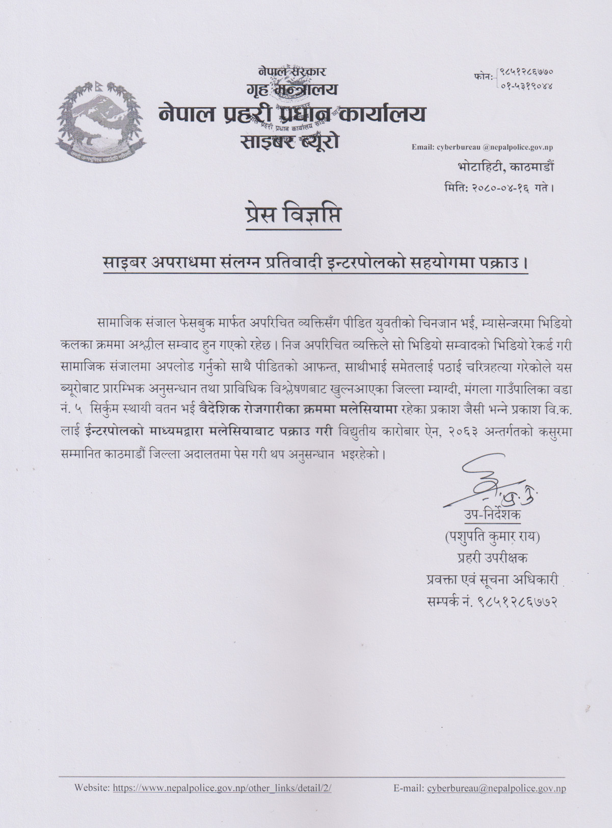 - नेपाल प्रहरी प्रधान कार्यालय साइबर ब्यूरो, भोटाहिटी काठमाडौंको अनुरोध । (२०७९/०८/१२)