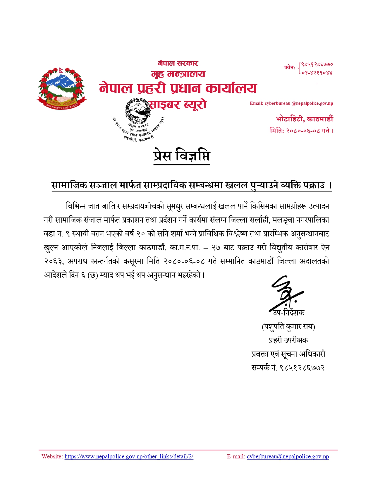 - सामाजिक सञ्जाल मार्फत साम्प्रदायिक सम्बन्धमा खलल पुर्याउँने व्यक्ति पक्राउ (२०८०-०६-०८)