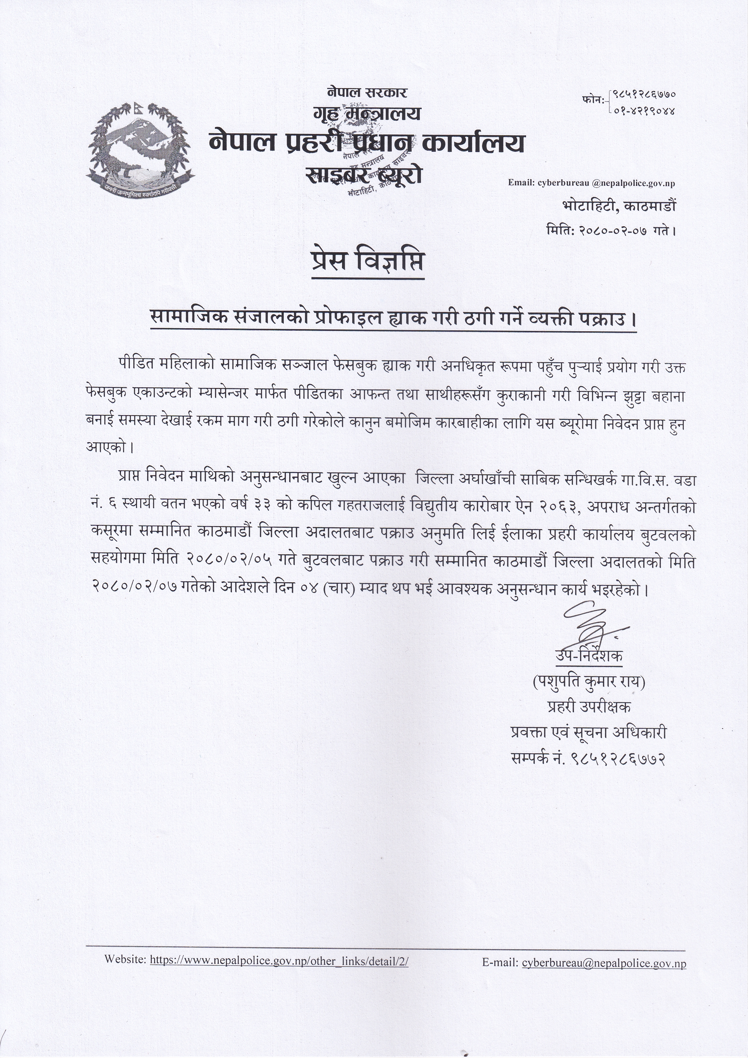- नेपाल प्रहरी प्रधान कार्यालय साइबर ब्यूरो, भोटाहिटीको अनुरोध ।(२०८०-०१-०६)