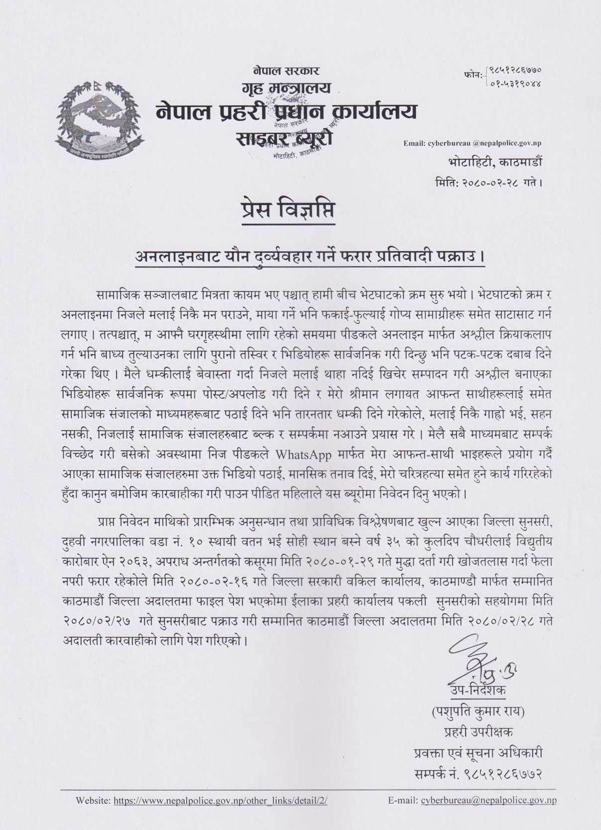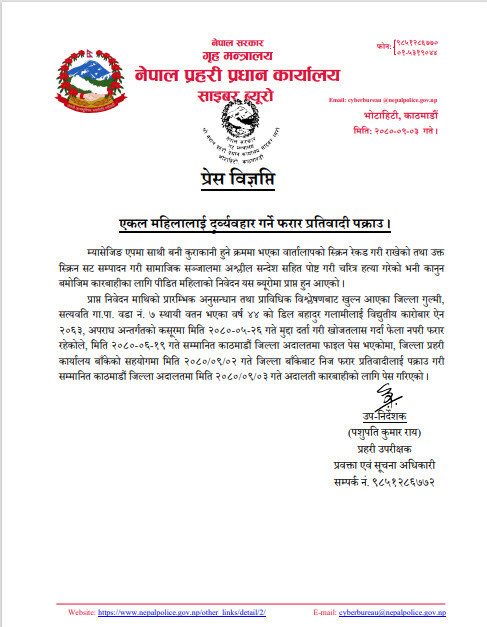 - अनलाइनबाट यौन दुर्व्यवहार गर्ने फरार प्रतिवादी पक्राउ । (२०८०-०२-२८)