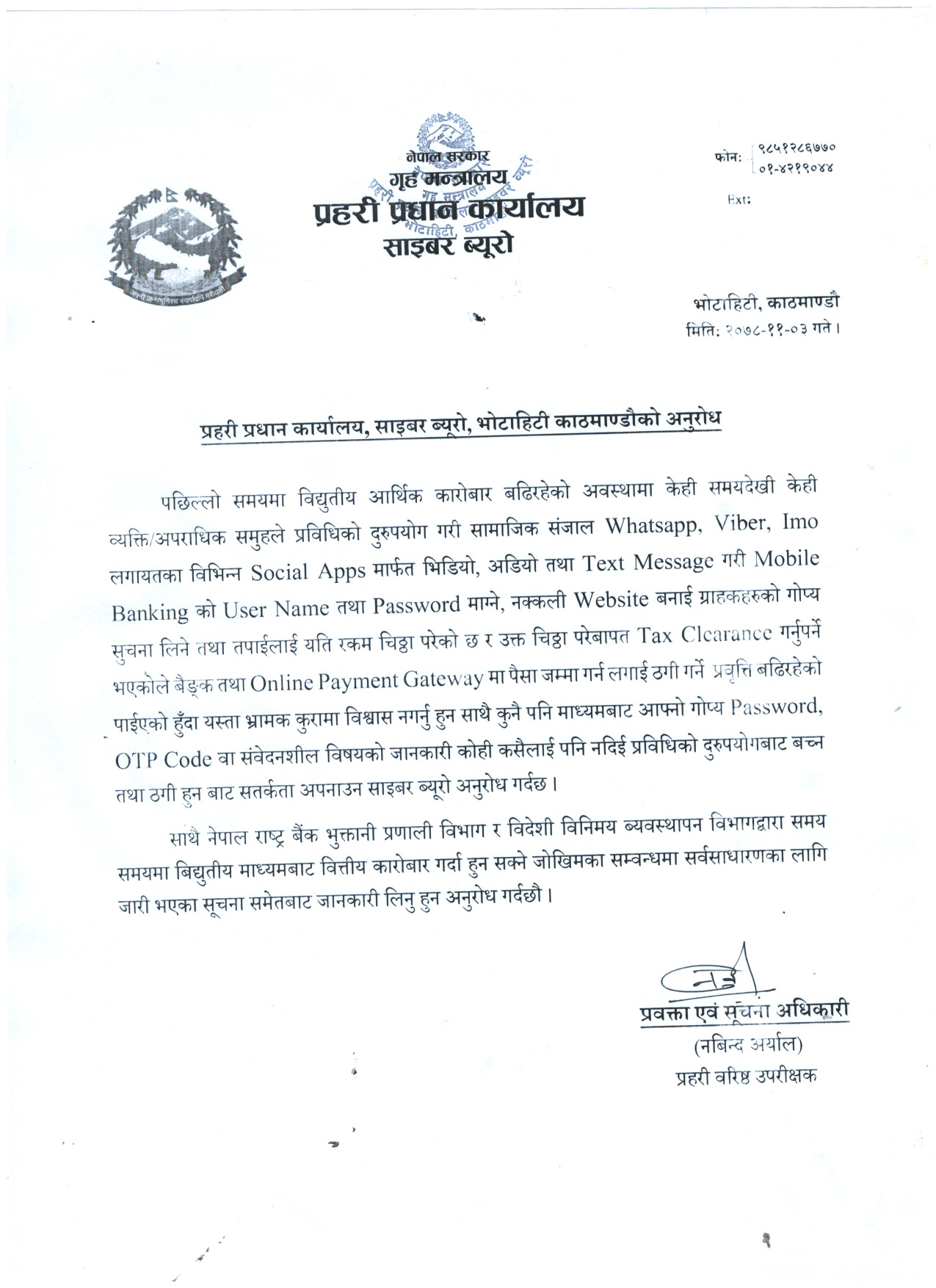 - प्रहरी प्रधान कार्यालय, साइवर ब्यूरो, भोटाहिटी काठमाण्डौको अनुरोध
