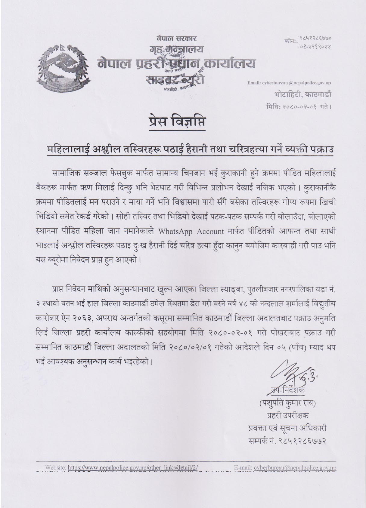 - सामाजिक सञ्जालमा नाबालिका तथा महिलाको भिडियो / तस्वीर सम्प्रेषण गरी चरित्र हत्या गर्ने व्यक्तिहरु पक्राउ । (२०७९-०२-२७)