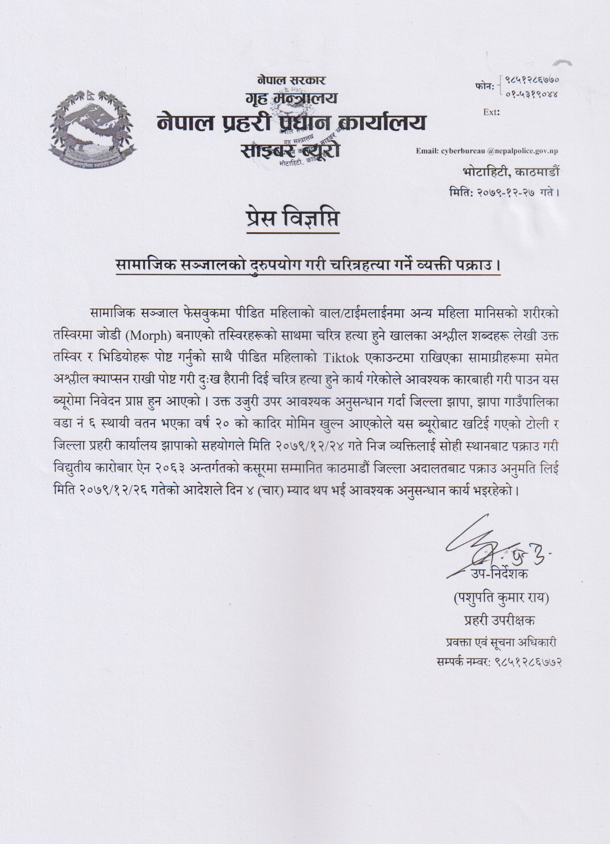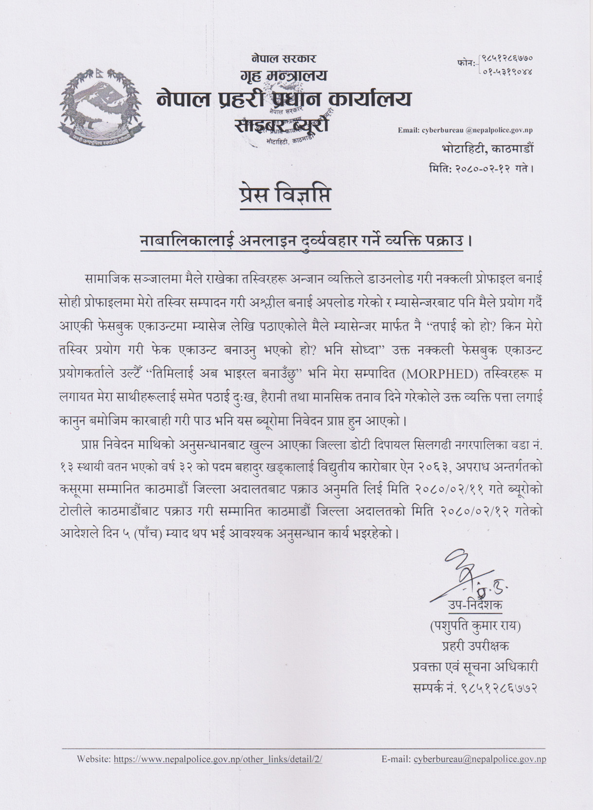 - सामाजिक सञ्जालमा नाबालिका तथा महिलाको तस्वीर सम्प्रेषण गरी चरित्र हत्या गर्ने व्यक्तिहरु पक्राउ । (२०७९-०३-२८)
