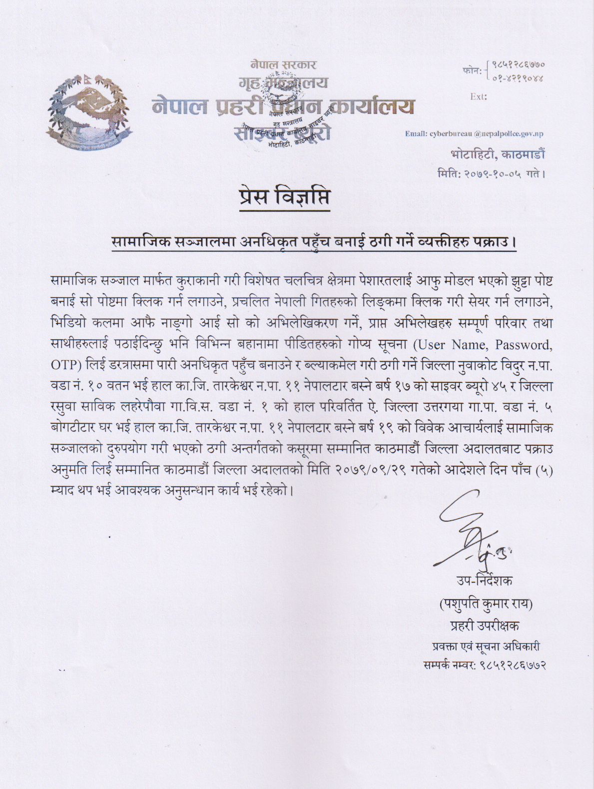 - Fake E-mail तथा फेसबुकमा Fake ID बनाई महिलाहरुलाई अश्लिल सन्देश, तस्वीर पठाउने, यौन उत्पिडन एवं हैरानी गर्ने व्यक्तिहरु पक्राउ (२०७७-०९-०३)