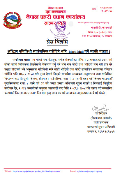 - अश्लिल गतिविधी सार्वजनिक गरिदिने भनि Black Mail गर्ने व्यक्ती पक्राउ । ( २०८१-०१-१०)