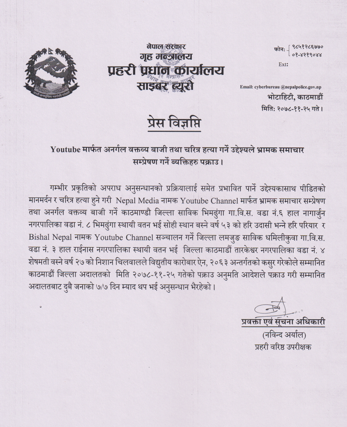 - YouTube Channel मार्फत चरित्र हत्या गर्ने उद्देश्यले भ्रामक तथा अनर्गल वक्तव्य बाजी गर्ने ब्यक्ति पक्राउ । (२०७८-१२-०६)