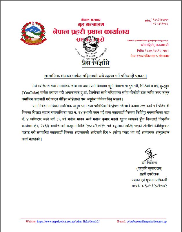 - युट्युब च्यानल मार्फत महिलाको चरित्रहत्या गर्ने भिडियो, अन्तर्वाता तथा फोटोसहितको विवरण प्रसारण गर्ने ब्यक्तिहरु पक्राउ (२०७८-०६-१३)