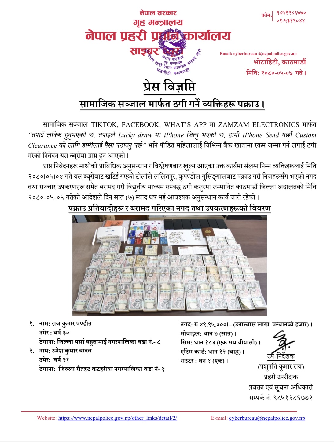 - विद्युतीय माध्यम सम्बद्ध ठगी गर्ने व्यक्तीहरु पक्राउ । (२०७९-०९-२४)