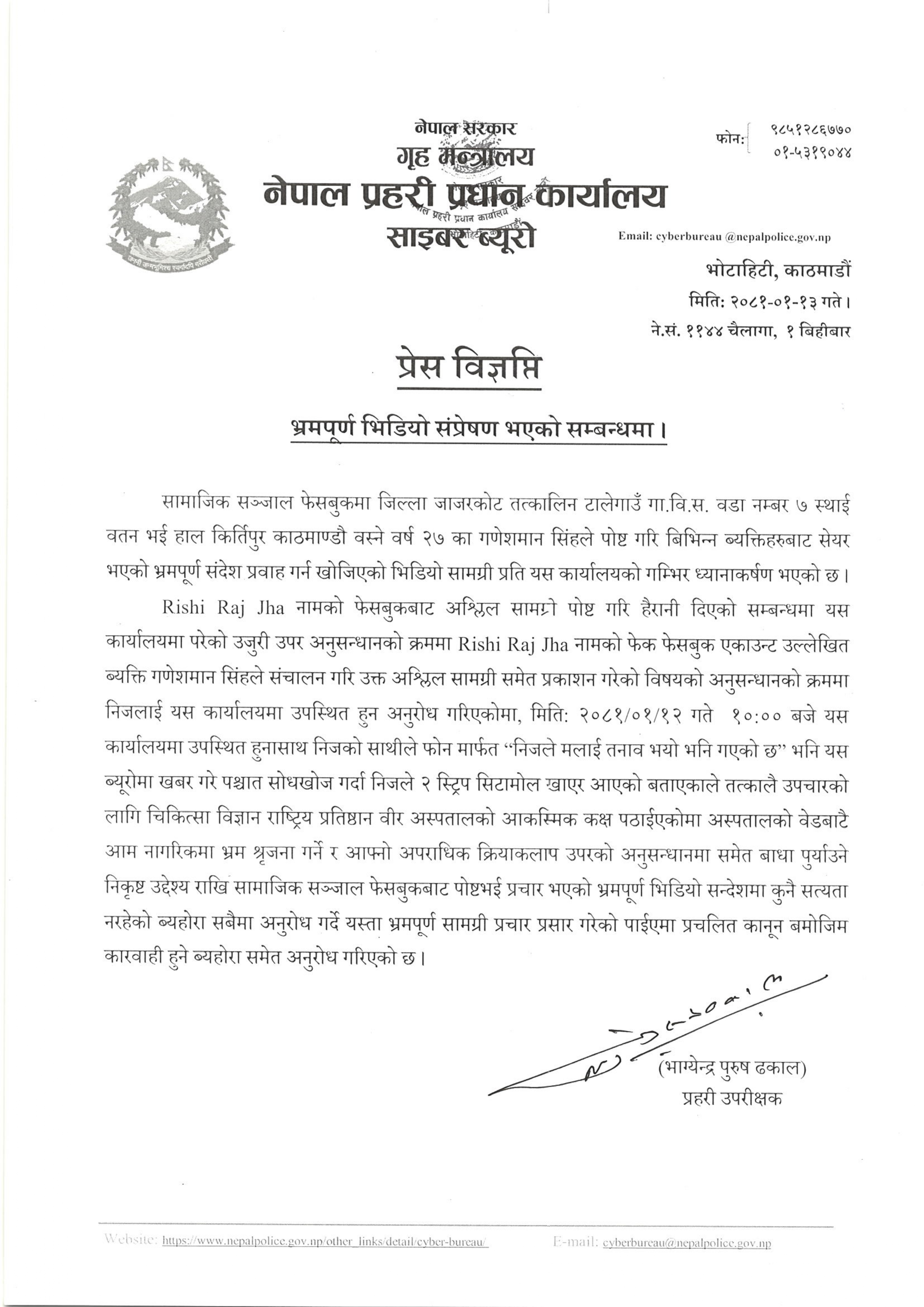 - भ्रमपूर्ण भिडियो संप्रेषण भएको सम्बन्धमा । ( २०८१-०१-१३)