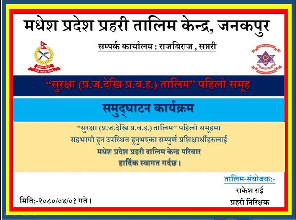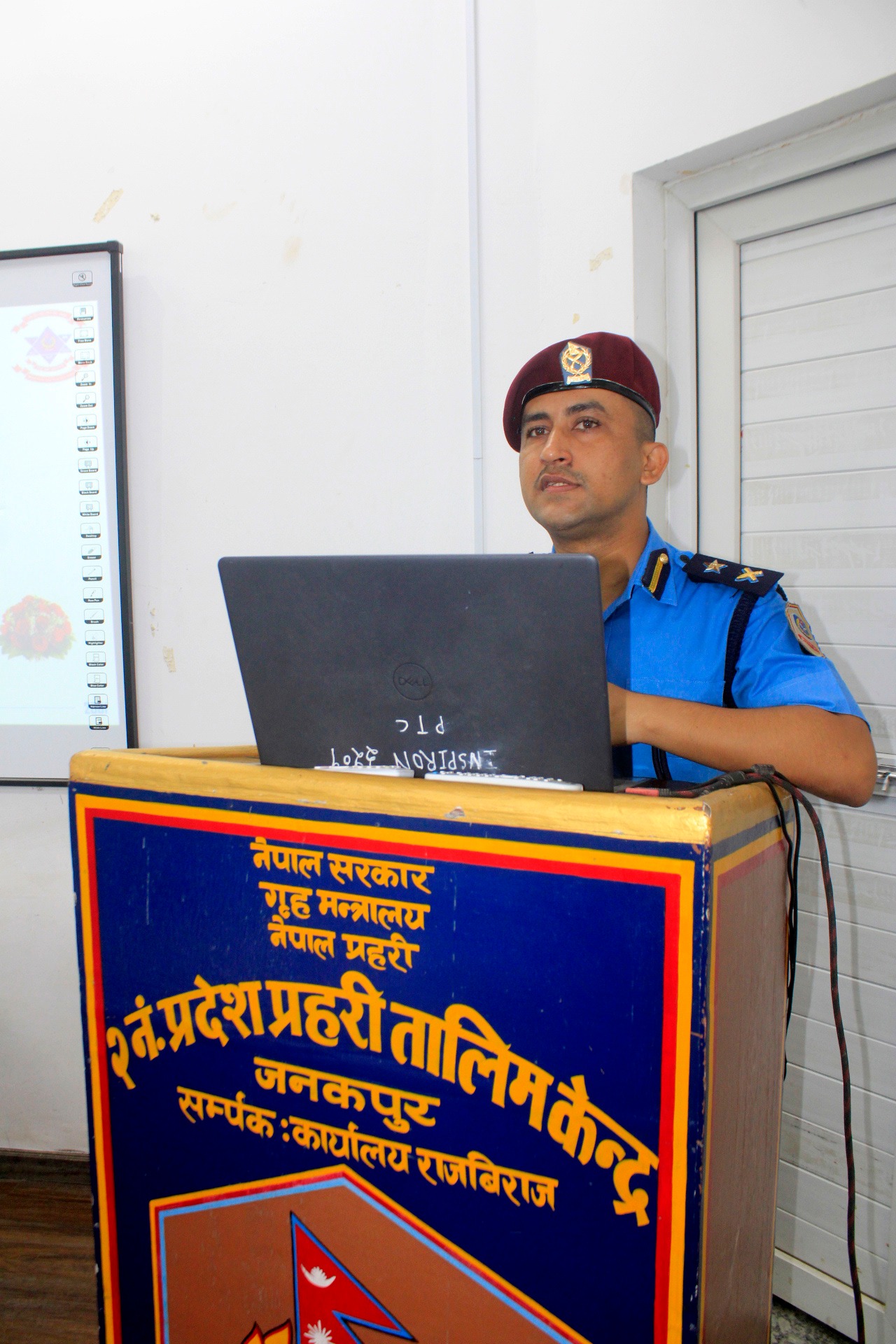 यस केन्द्रको आ.व. २०८१/०८२ को स्वीकृत वार्षिक तालिम क्यालेण्डर अनुसार मिति २०८१/०४/०१ गते तालिम संयोजक प्र.नि. राकेश राईज्यूले "सुरक्षा (प्र.ज.-प्र.व.ह.) तालिम" पहिलो समूहको तालिम उद्घाटन गर्नुका साथै पाठ्यक्रम परिचय समेत गराउनु भएको छ ।