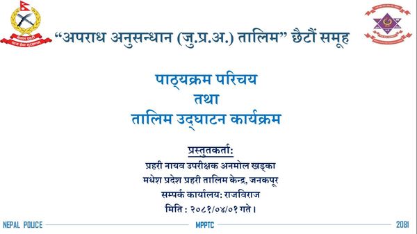 यस केन्द्रको आ.व. २०८१/०८२ को स्वीकृत वार्षिक तालिम क्यालेण्डर अनुसार मिति २०८१/०४/०१ गते तालिम संयोजक प्र.ना.उ. अनमोल खड्काज्यूले "अपराध अनुसन्धान (जु.प्र.अ.) तालिम" छैठौं समूहको तालिम उद्घाटन गर्नुका साथै पाठ्यक्रम परिचय समेत गराउनु भएको छ ।
