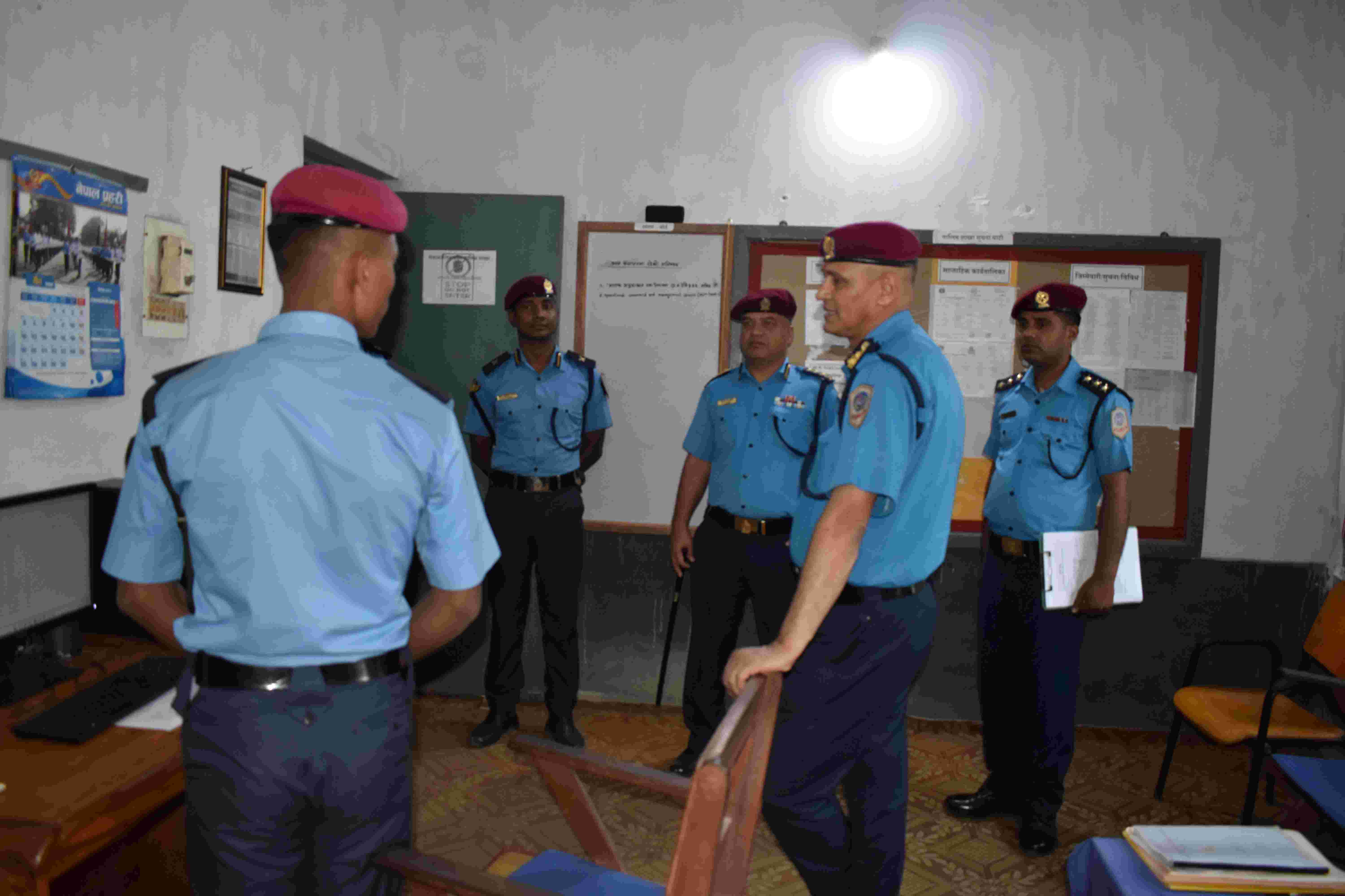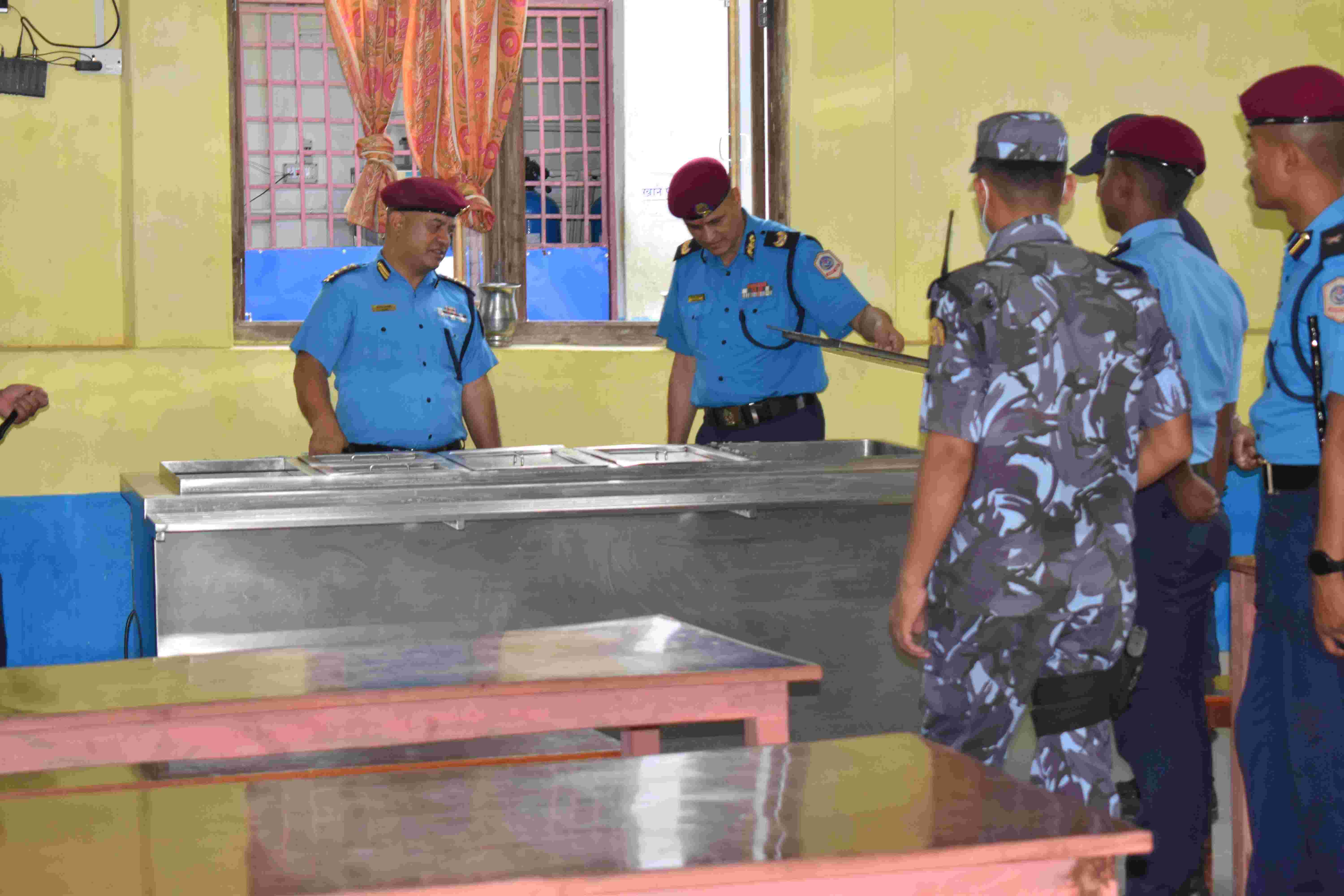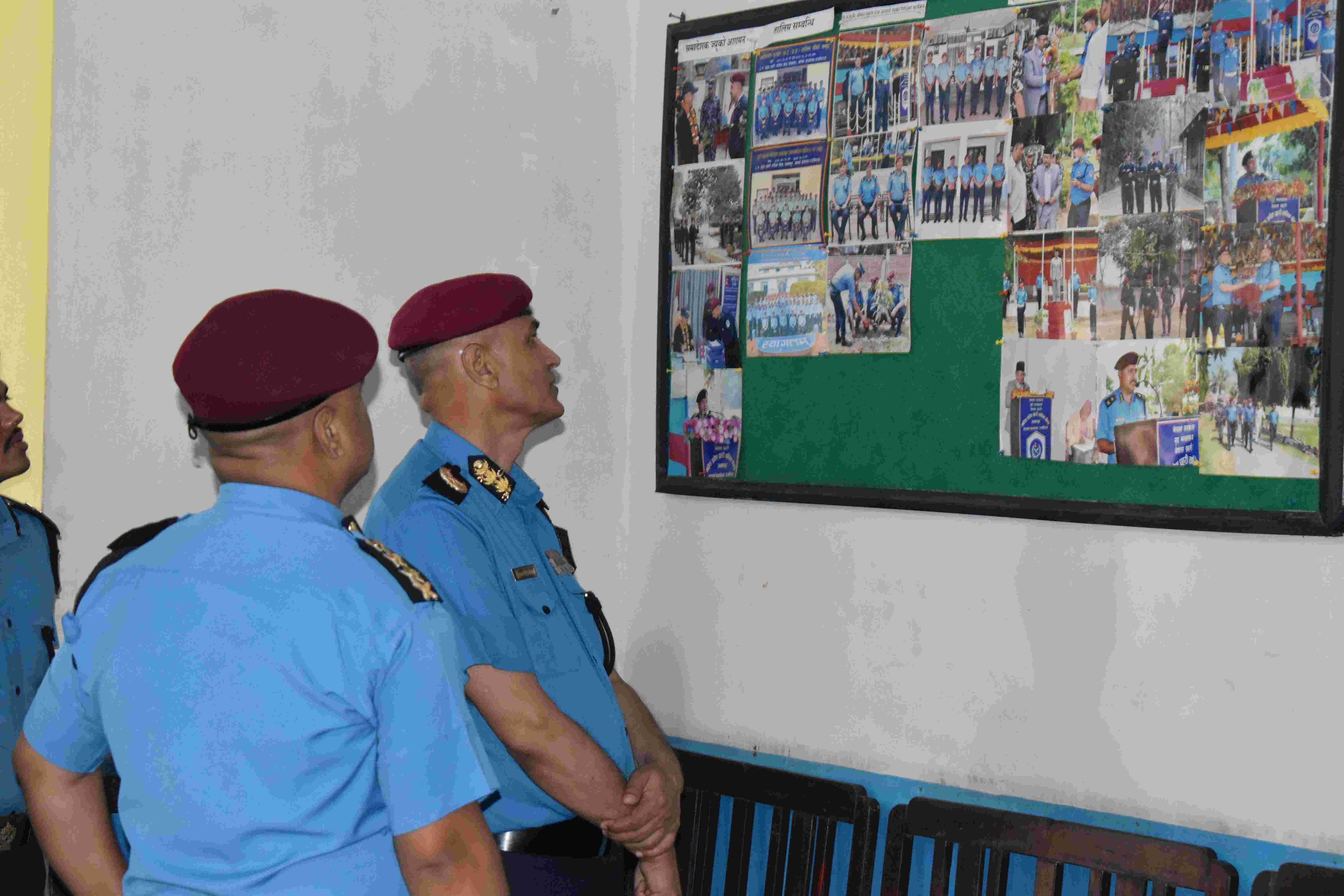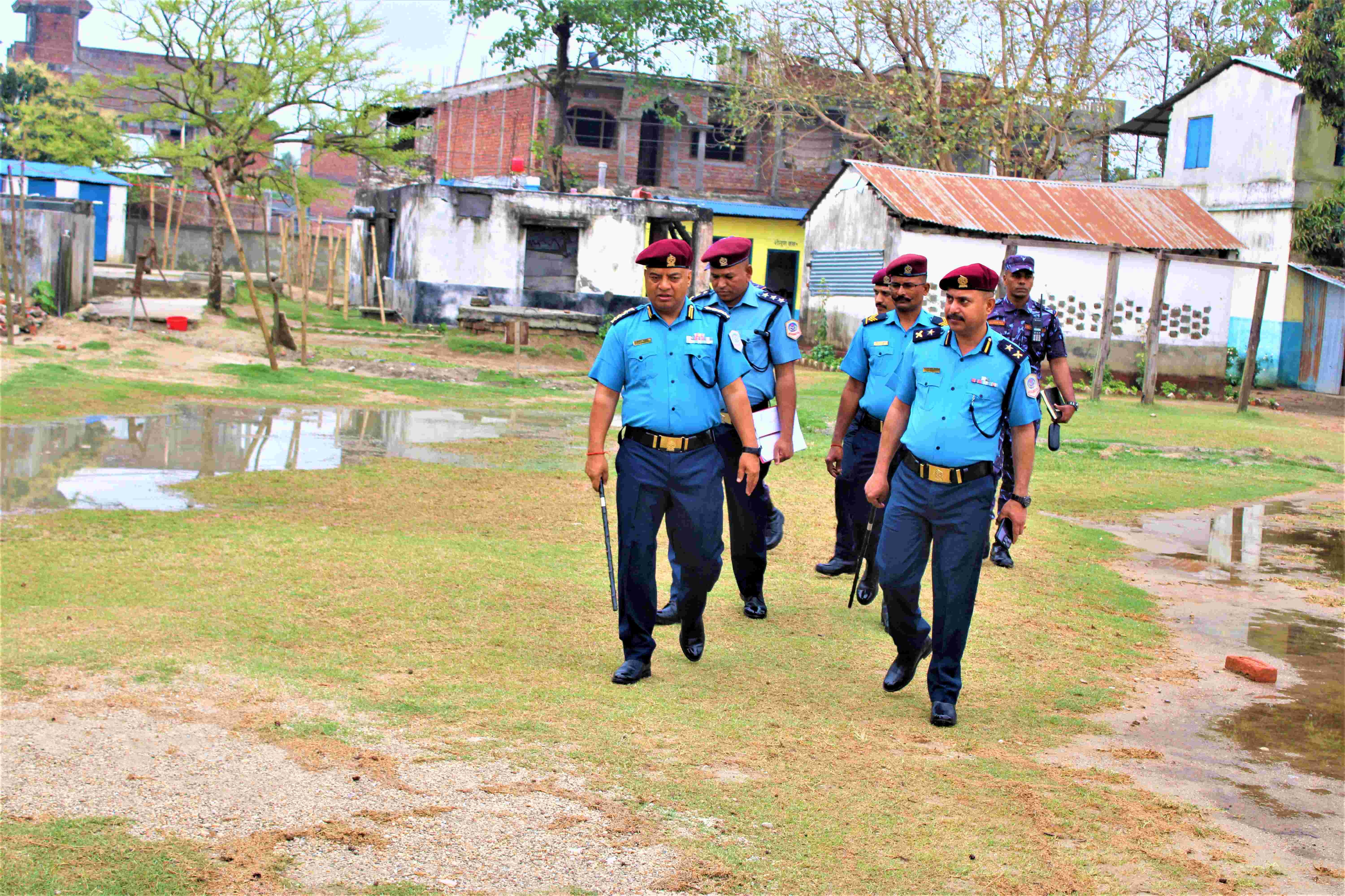 यस मधेश प्रदेश प्रहरी तालिम केन्द्र जनकपुर, हाल राजविराजमा कार्यरत प्रहरी कर्मचारीहरु तथा भौतिक संरचनालाई निरीक्षण गर्नुहुदै यस केन्द्रका समादेशक प्र.ब.उ. ईश्वर कार्की ज्यु ।