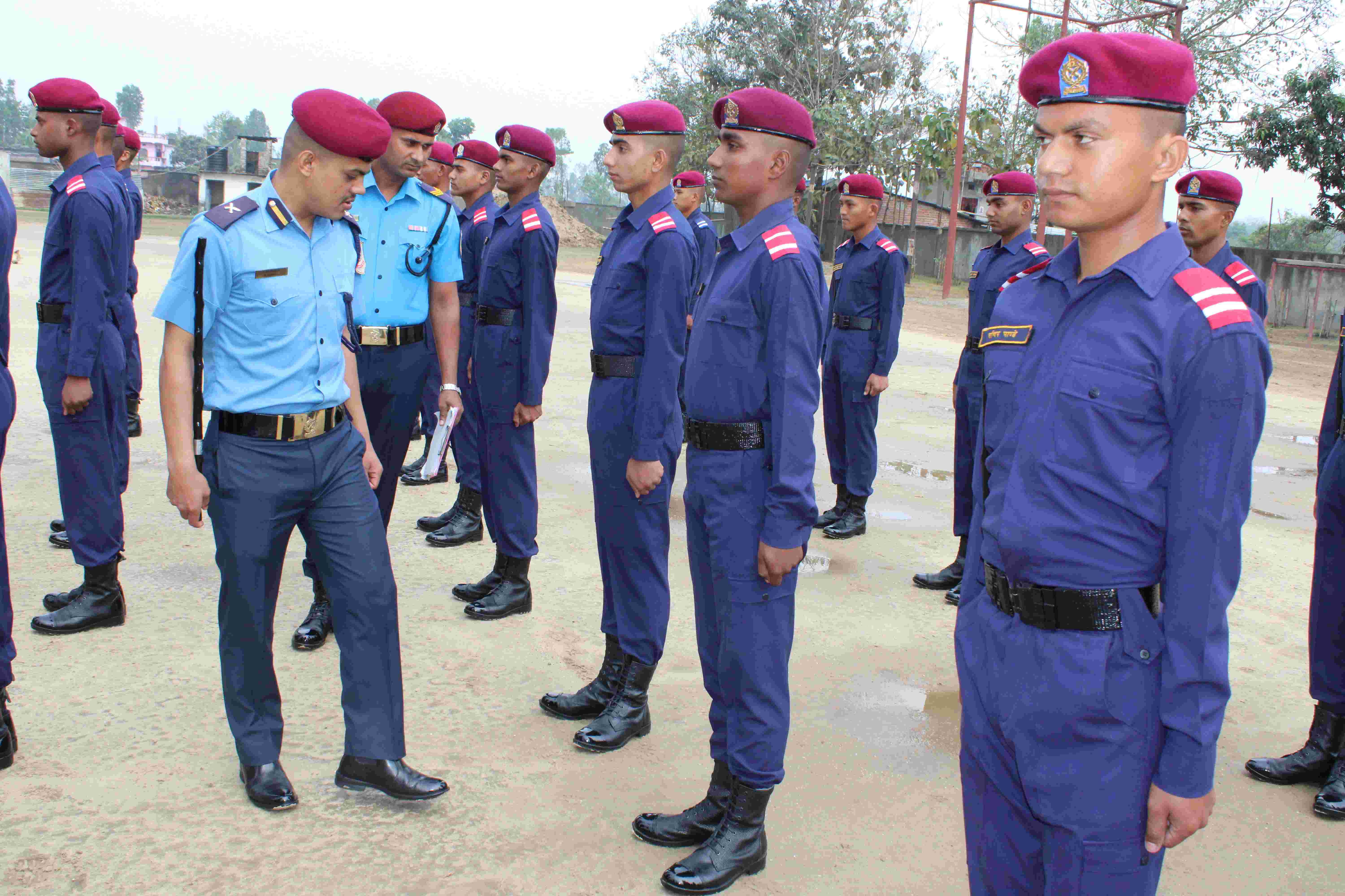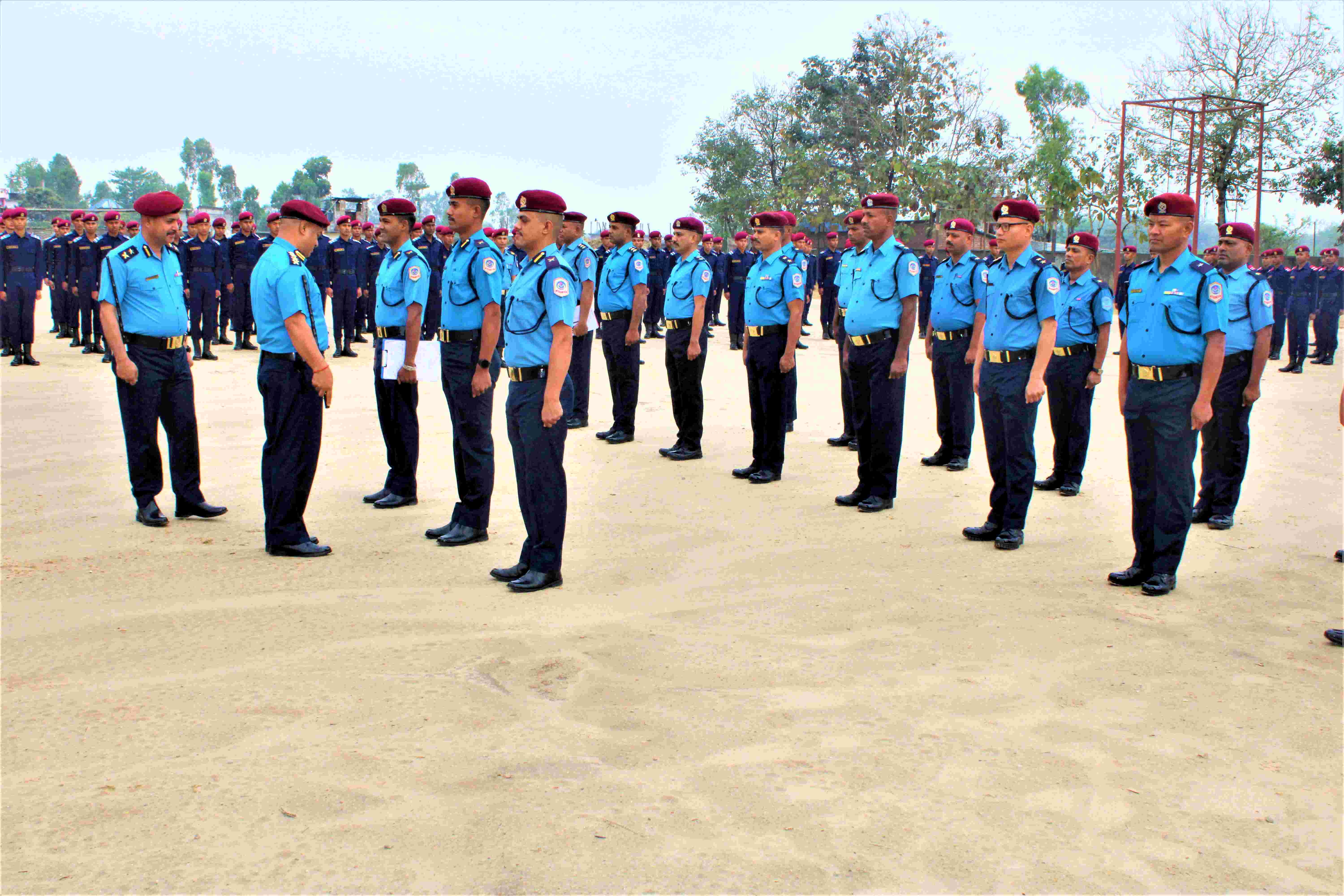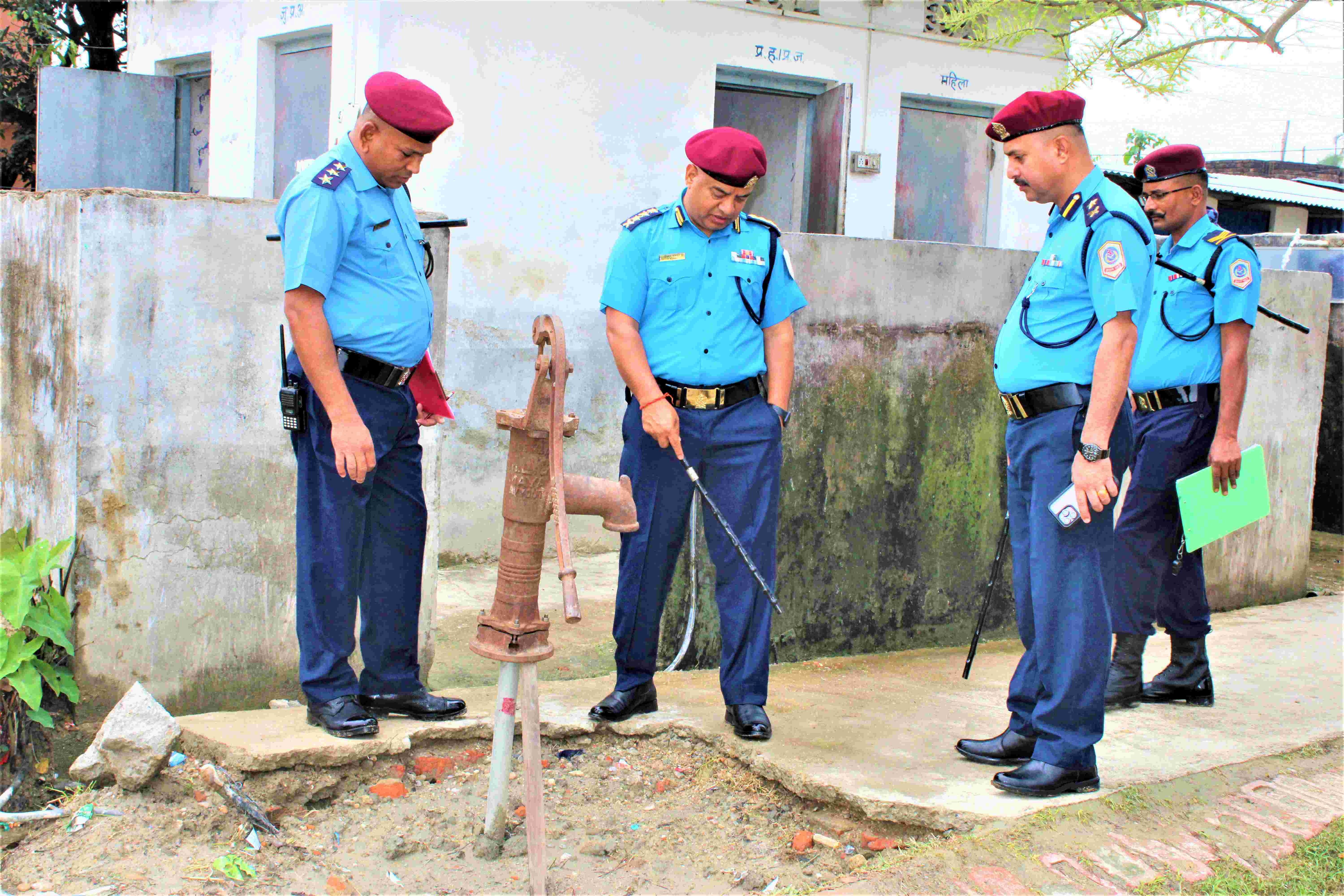 यस मधेश प्रदेश प्रहरी तालिम केन्द्र जनकपुर, हाल राजविराजमा कार्यरत प्रहरी कर्मचारीहरु तथा भौतिक संरचनालाई निरीक्षण गर्नुहुदै यस केन्द्रका समादेशक प्र.ब.उ. ईश्वर कार्की ज्यु ।