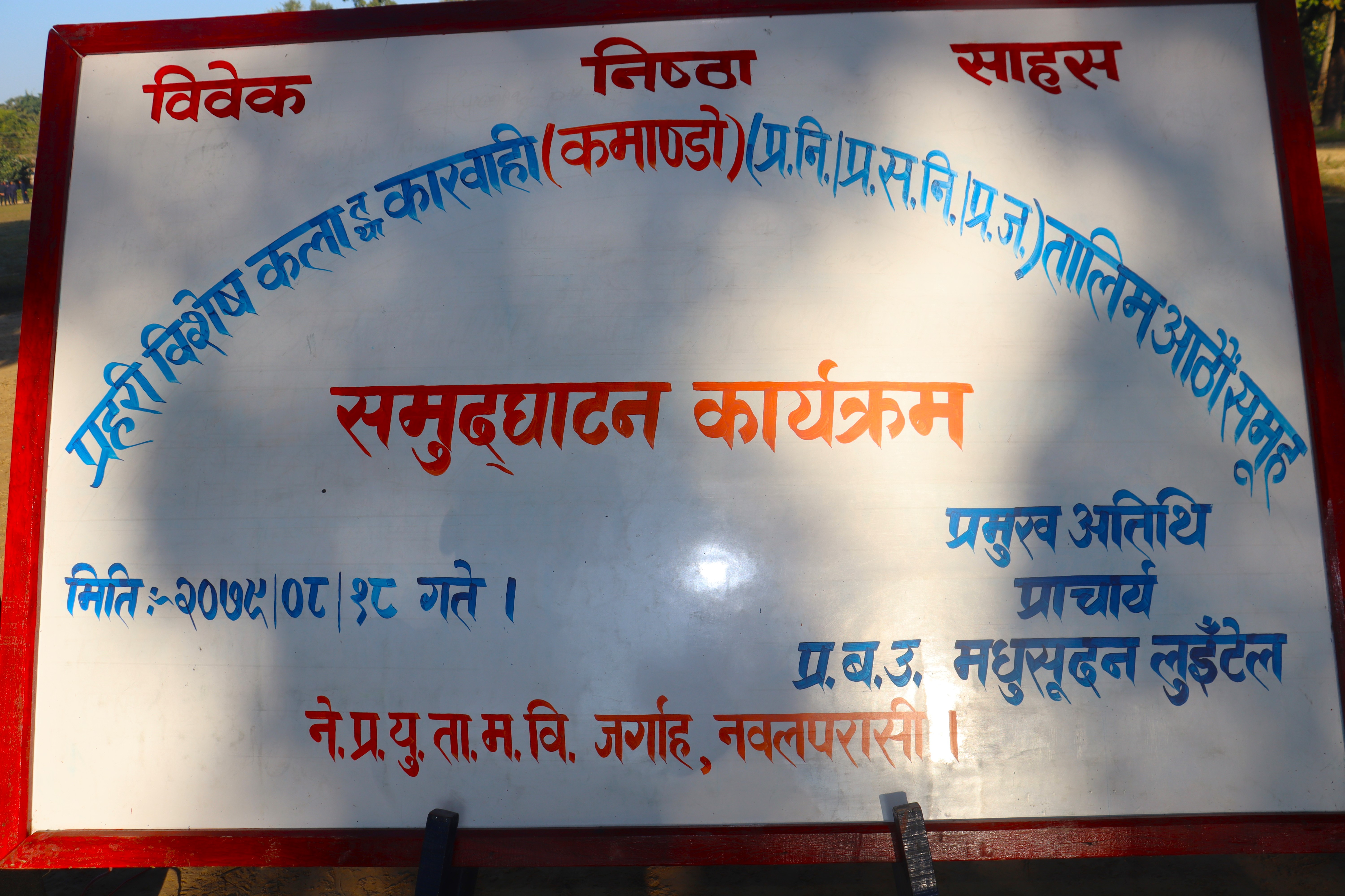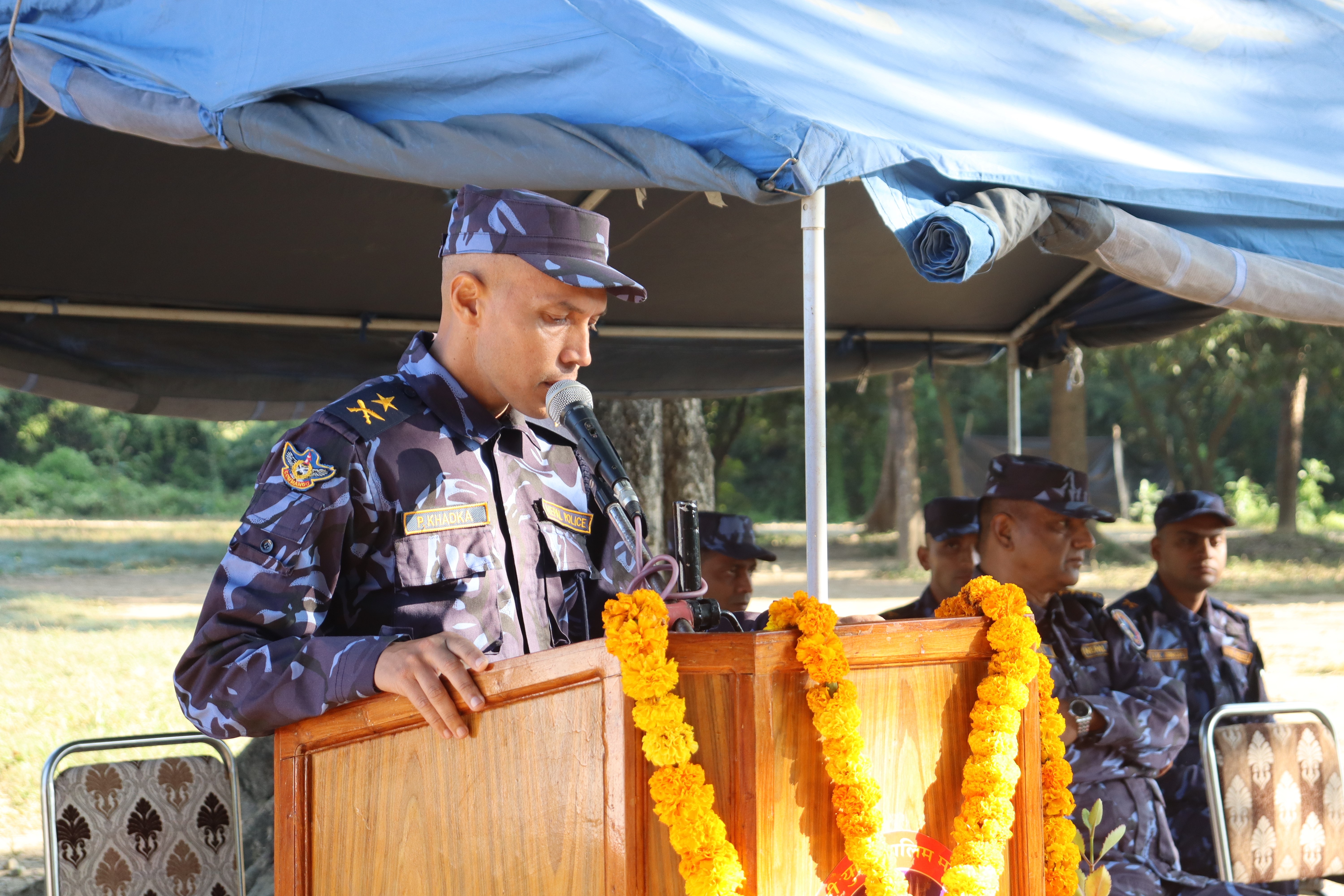 आर्थिक बर्ष २०७९/०८० को नेपाल प्रहरी युक्ति तालिम महाविद्यालयको स्वीकृत बार्षिक तालिम क्यालेण्डर अनुसार आज मिति २०७९/०८/१८ गतेदेखि सञ्चालन भएको ९० कार्यदिन अवधिको आवासीय "प्रहरी विशेष कला तथा कारवाही (कमाण्डो) तालिम" आठौं समूहका प्रशिक्षार्थीहरूलाई निर्देशन सम्बोधन गर्नु हुँदै समुद्घाटन कार्यक्रमका प्रमुख अतिथि यस महाविद्यालयका प्राचार्य प्रहरी बरिष्ठ उपरीक्षक मधुसूदन लुइँटेल ज्यू......