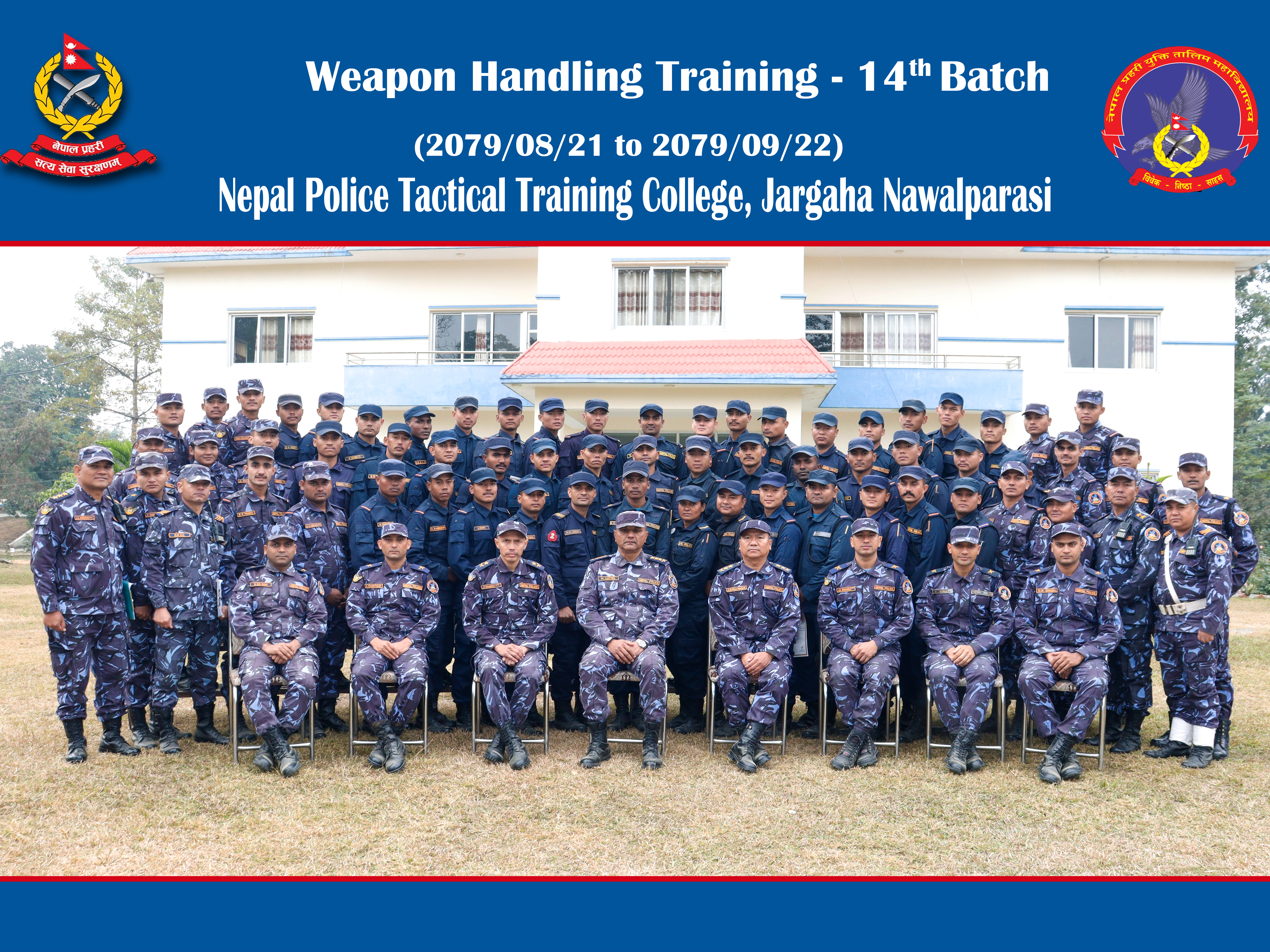 आज मिति २०७९।०९।२२ गतेका दिन यस महाविद्यालयमा संचालन भएको २४ कार्यदिन अवधि भएको " हतियार ह्याण्डलिङ्ग ( जु.प्र.अ./ प्र.ह / प्र.ज ) तालिम " १४ औं समूहको अन्तरक्रिया तथा समापन कार्यक्रम यस महाविद्यालयका प्राचार्य प्र.ब.उ. मधुसूदन लुइँटेलज्यूको प्रमुख आतिथ्यतामा सम्पन्न भयो ।