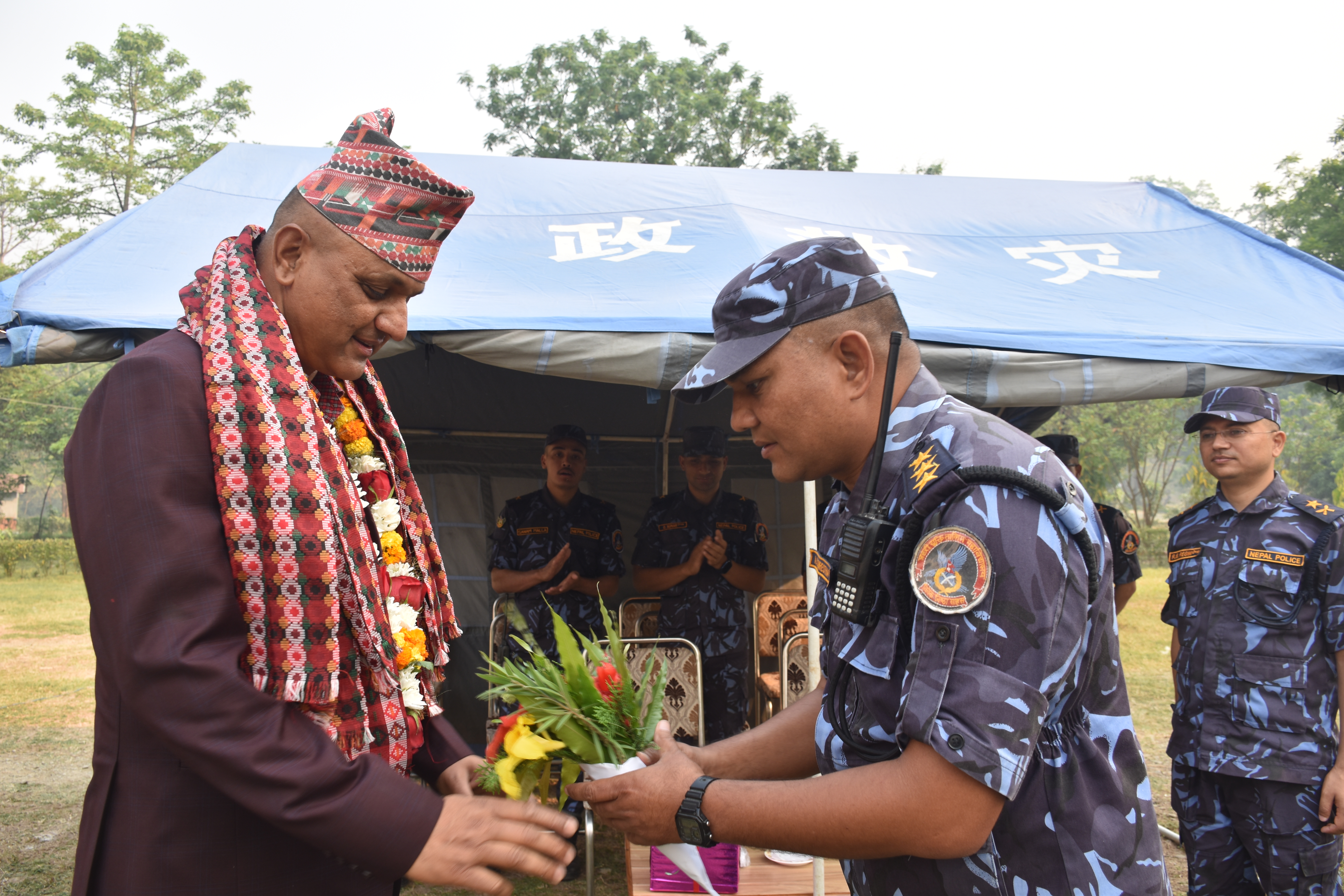 प्रहरी नायव उपरीक्षक रविन बाबु रेग्मी ज्यू यस महाविद्यालयका प्राचार्य प्रहरी बरीष्ठ उपरीक्षक मधुसूदन लुइँटेल ज्यूमा नेपाली ढाँका टोपी लगाई विदाई गर्नु हुदै ।