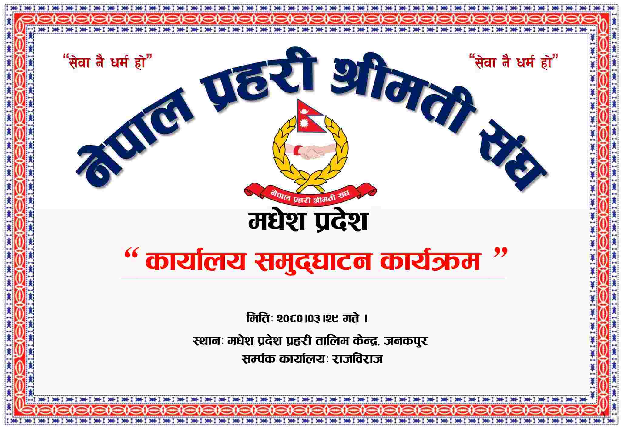 यस केन्द्रमा मिति २०८० असार २९ गते "नेपाल प्रहरी श्रीमती संघ, मधेश प्रदेश" कार्यालयको समुद्घाटन कार्यक्रमका केही झलकहरु ।