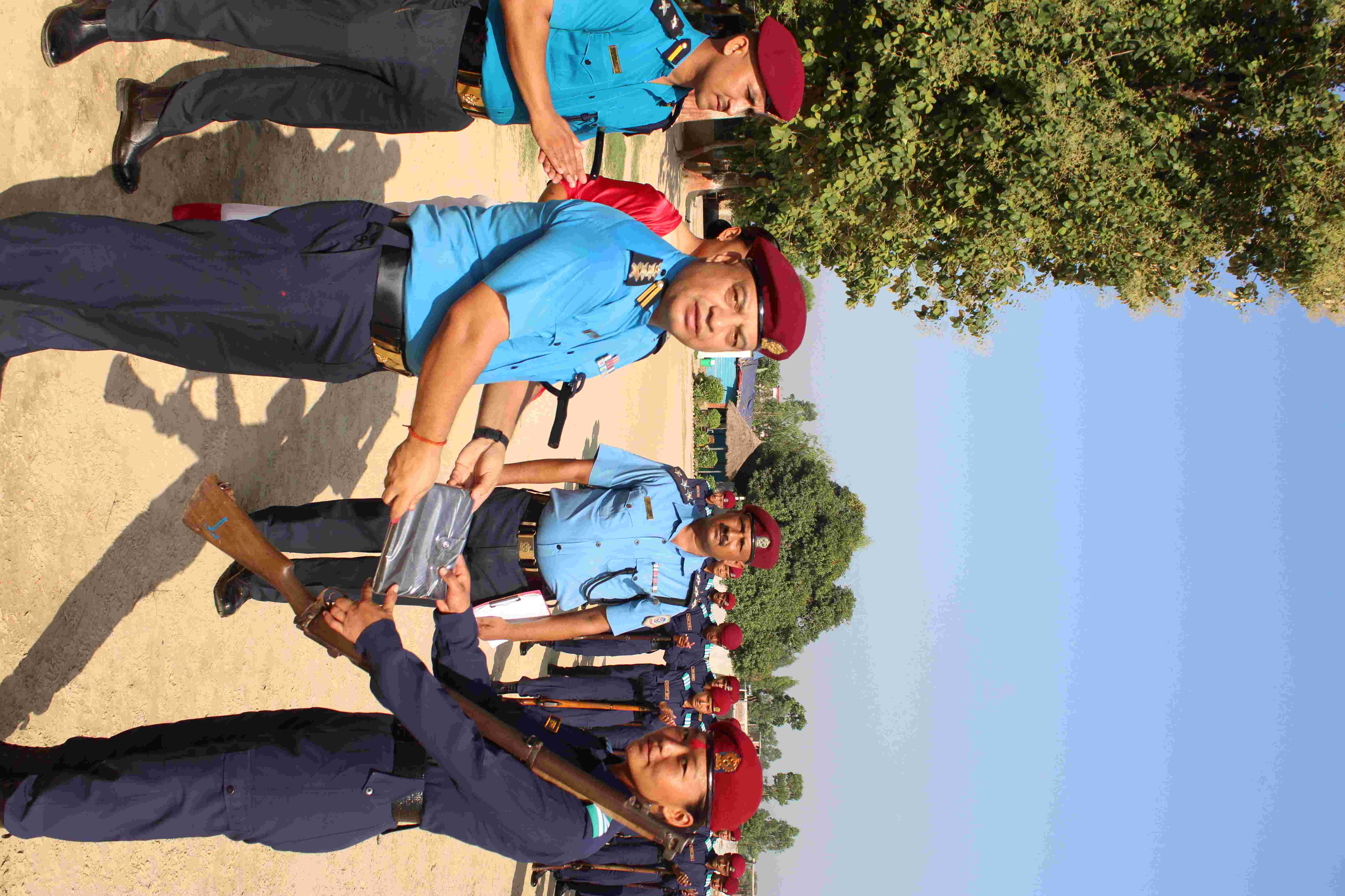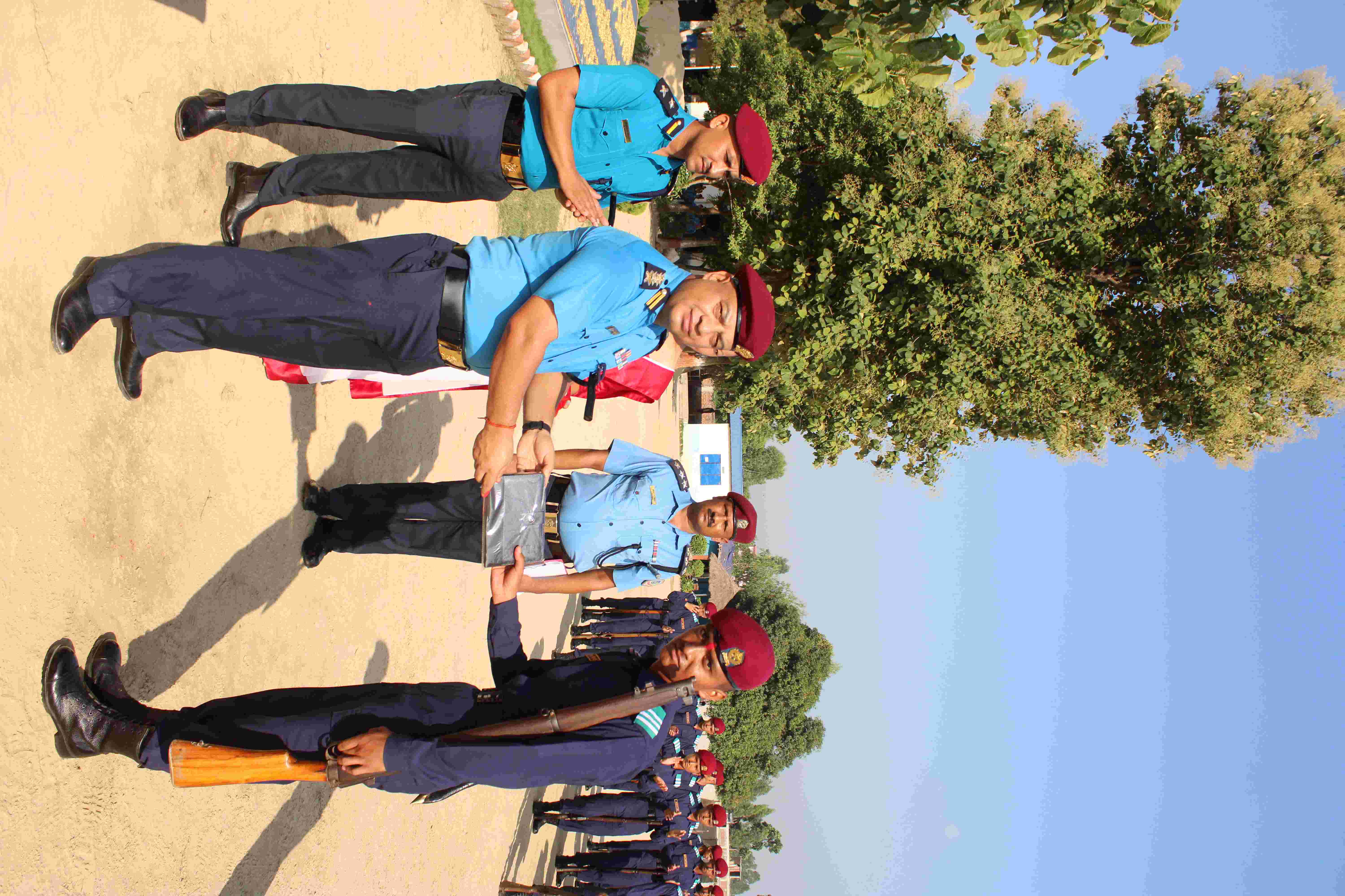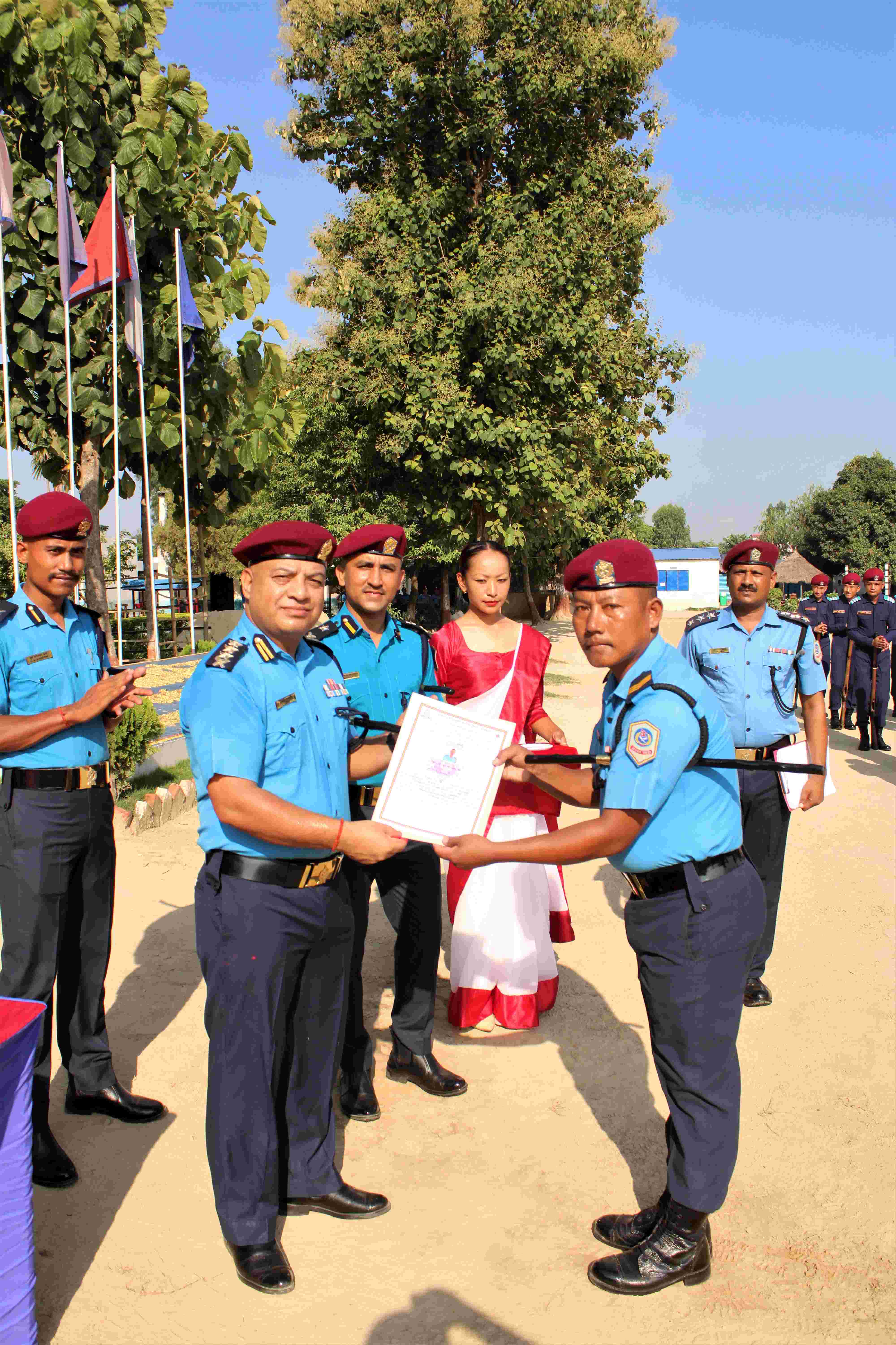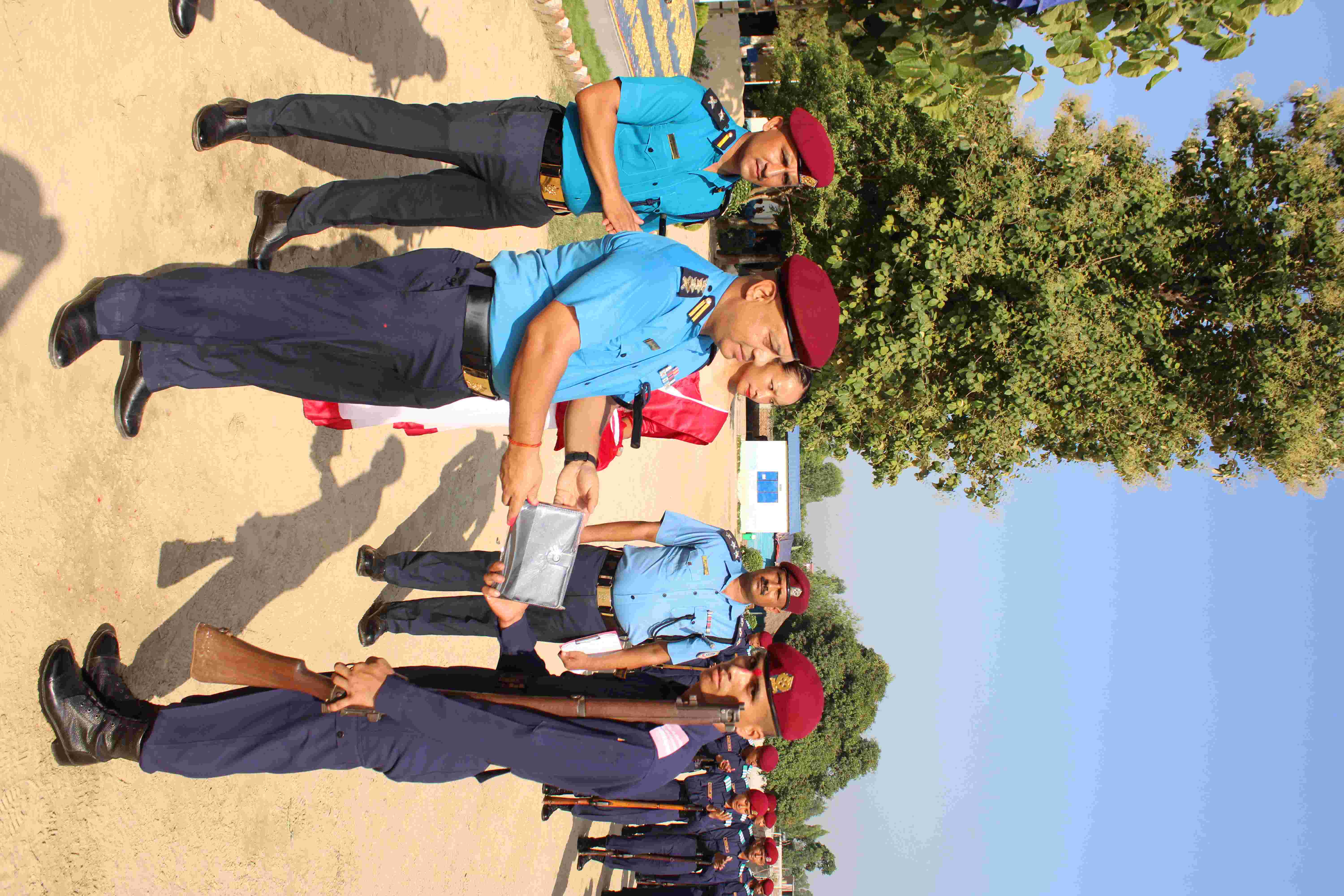 प्रहरी जवान आधारभुत (५-०४) औँ तालिम समुहमा प्रशिक्षणरत प्रशिक्षार्थीहरु पाठ्यक्रम बमोजिम दोश्रो र तेस्रो चरणमा विभिन्न विधामा उत्कृष्ट प्रशिक्षार्थीहरुलाई पुरस्कार वितरण गर्नुहुँदै यस केन्द्रका समादेशक प्र.ब.उ.ईश्वर कार्कीज्यू ।