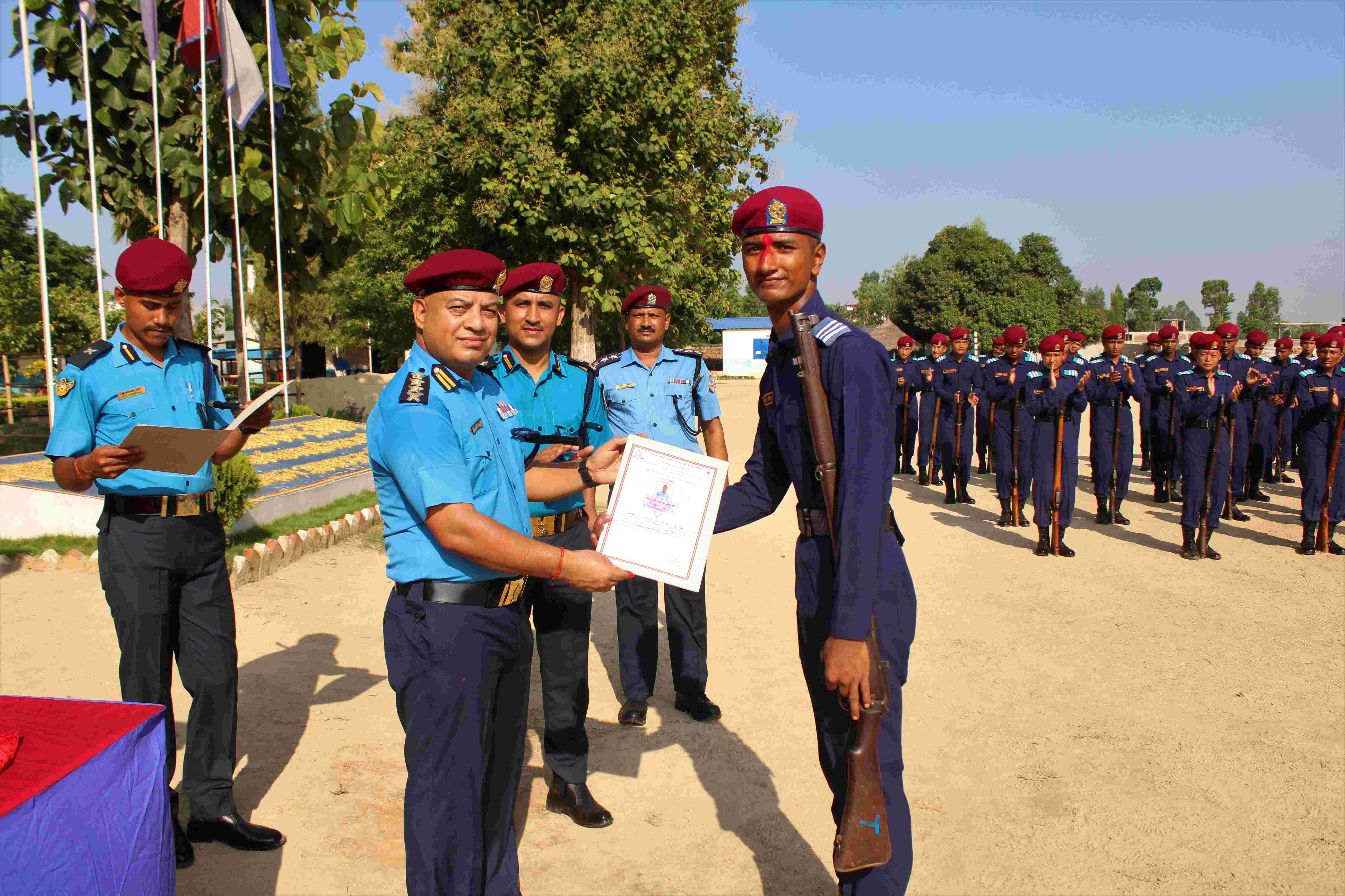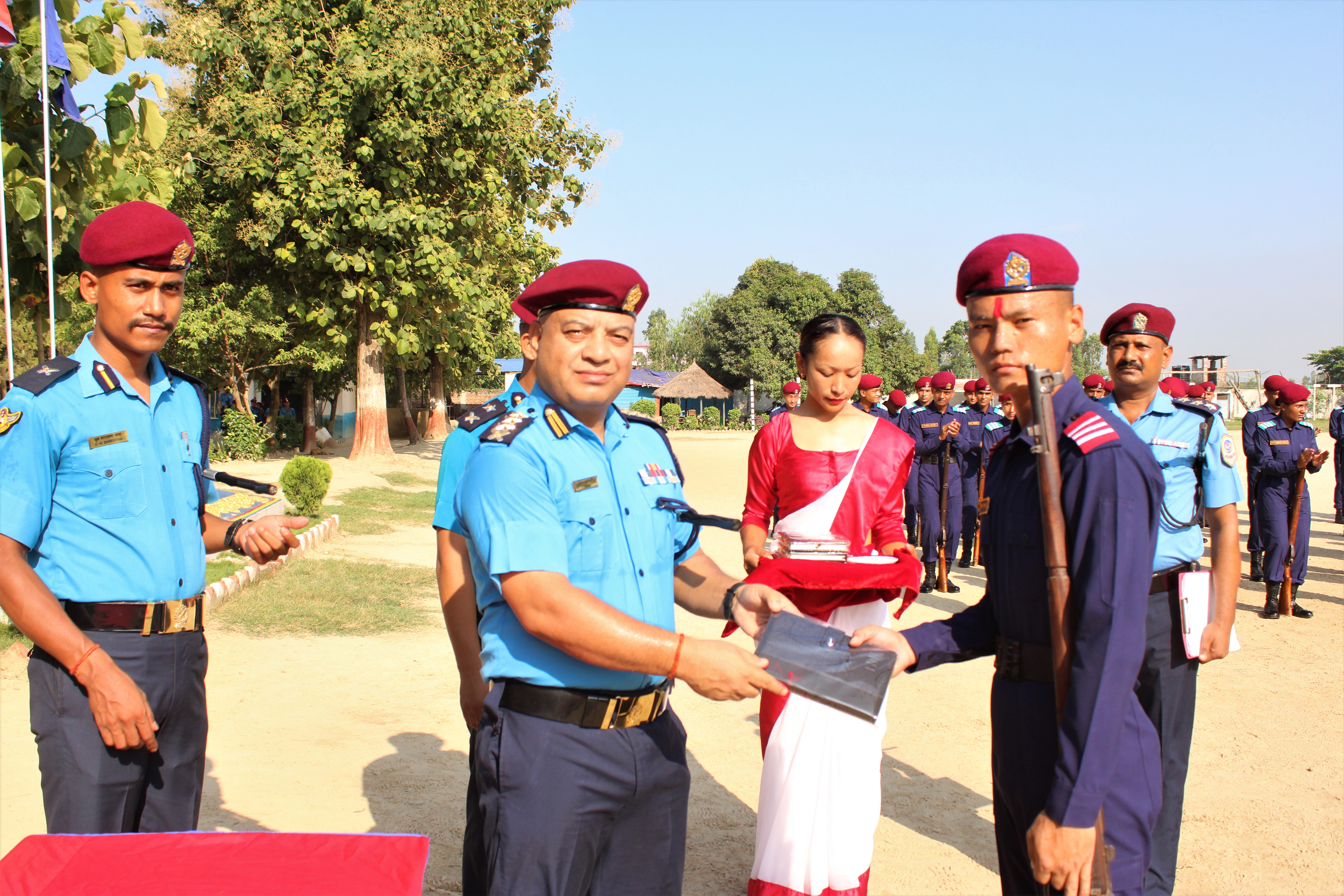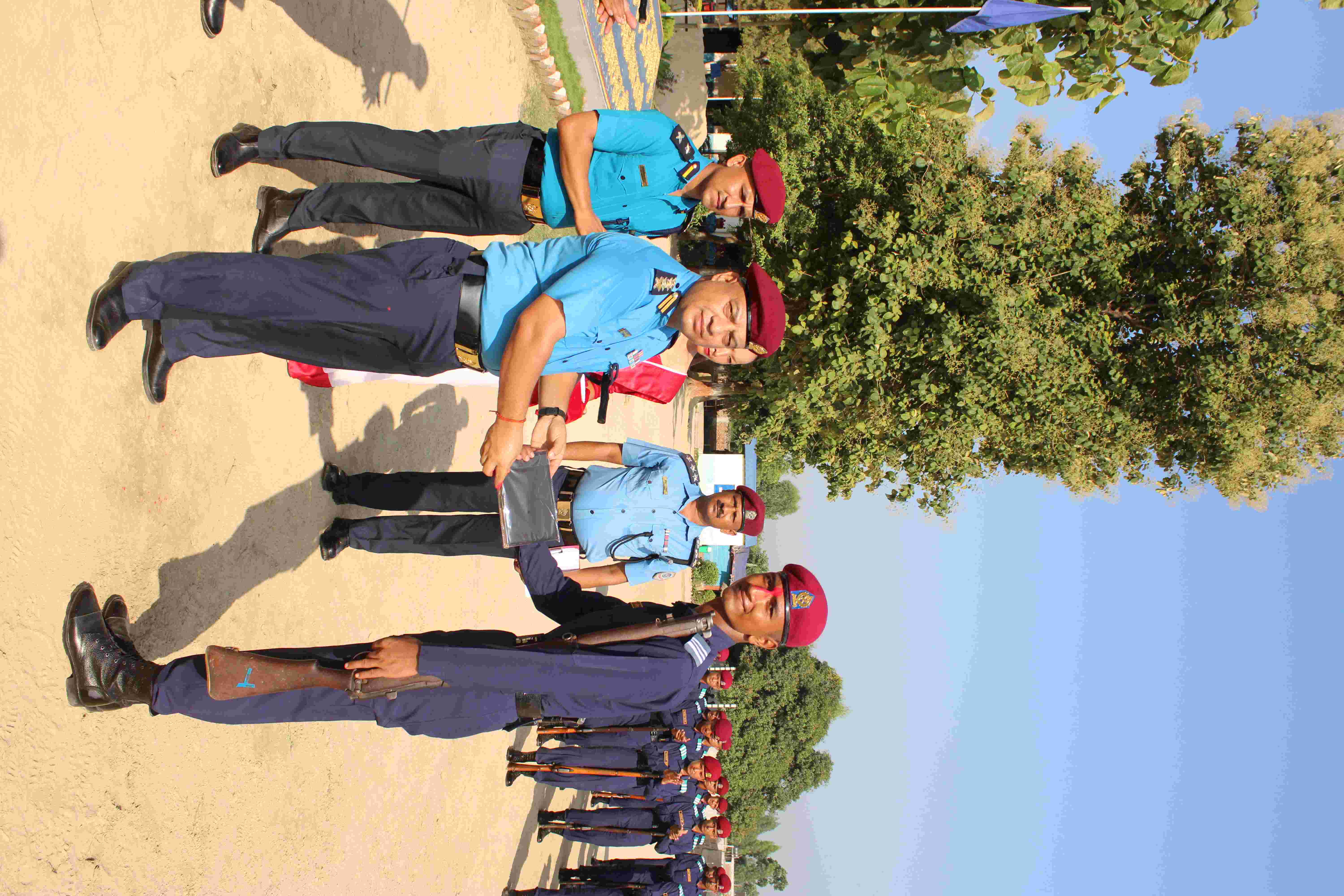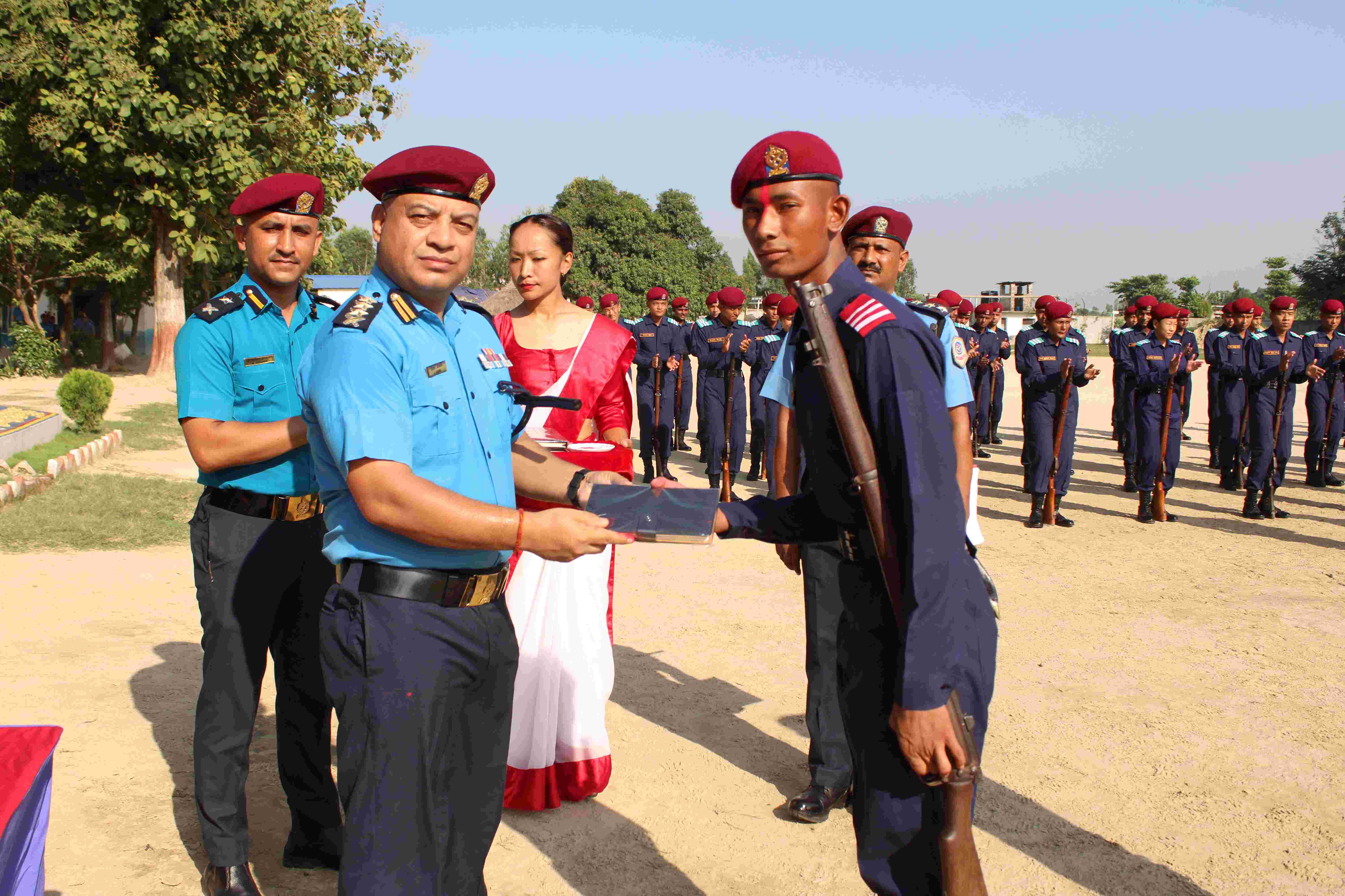 प्रहरी जवान आधारभुत (५-०४) औँ तालिम समुहमा प्रशिक्षणरत प्रशिक्षार्थीहरु पाठ्यक्रम बमोजिम दोश्रो र तेस्रो चरणमा विभिन्न विधामा उत्कृष्ट प्रशिक्षार्थीहरुलाई पुरस्कार वितरण गर्नुहुँदै यस केन्द्रका समादेशक प्र.ब.उ.ईश्वर कार्कीज्यू ।