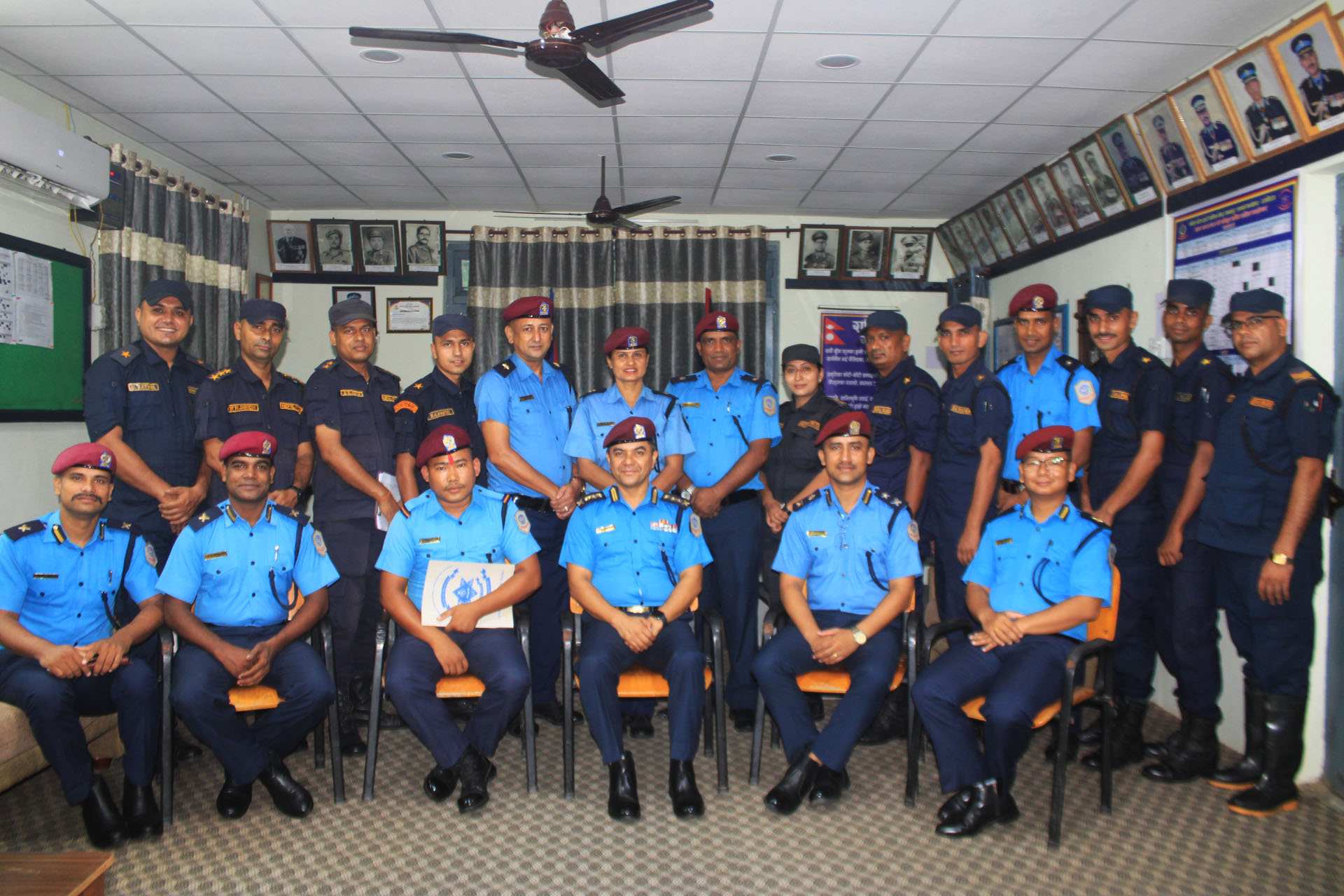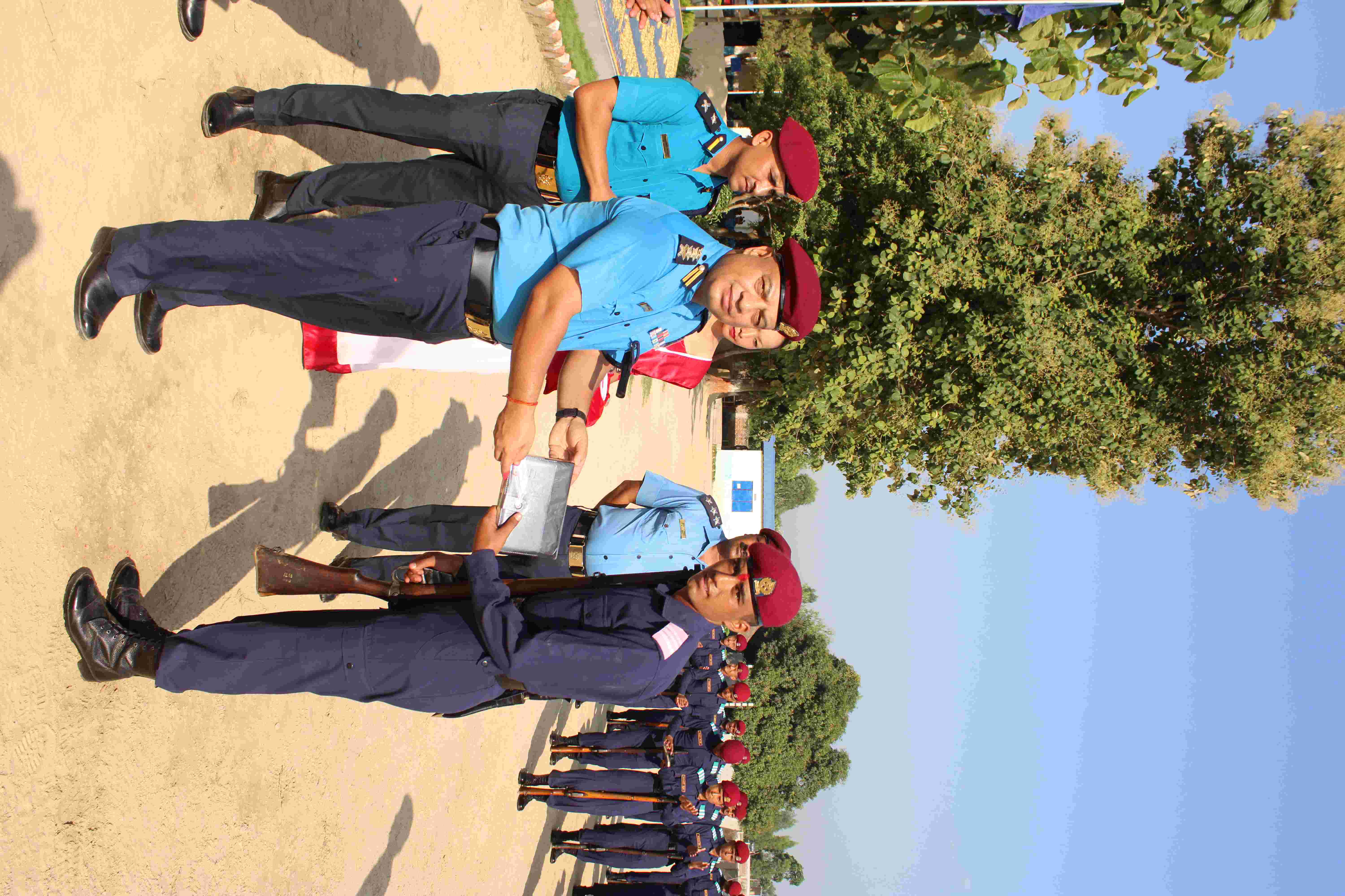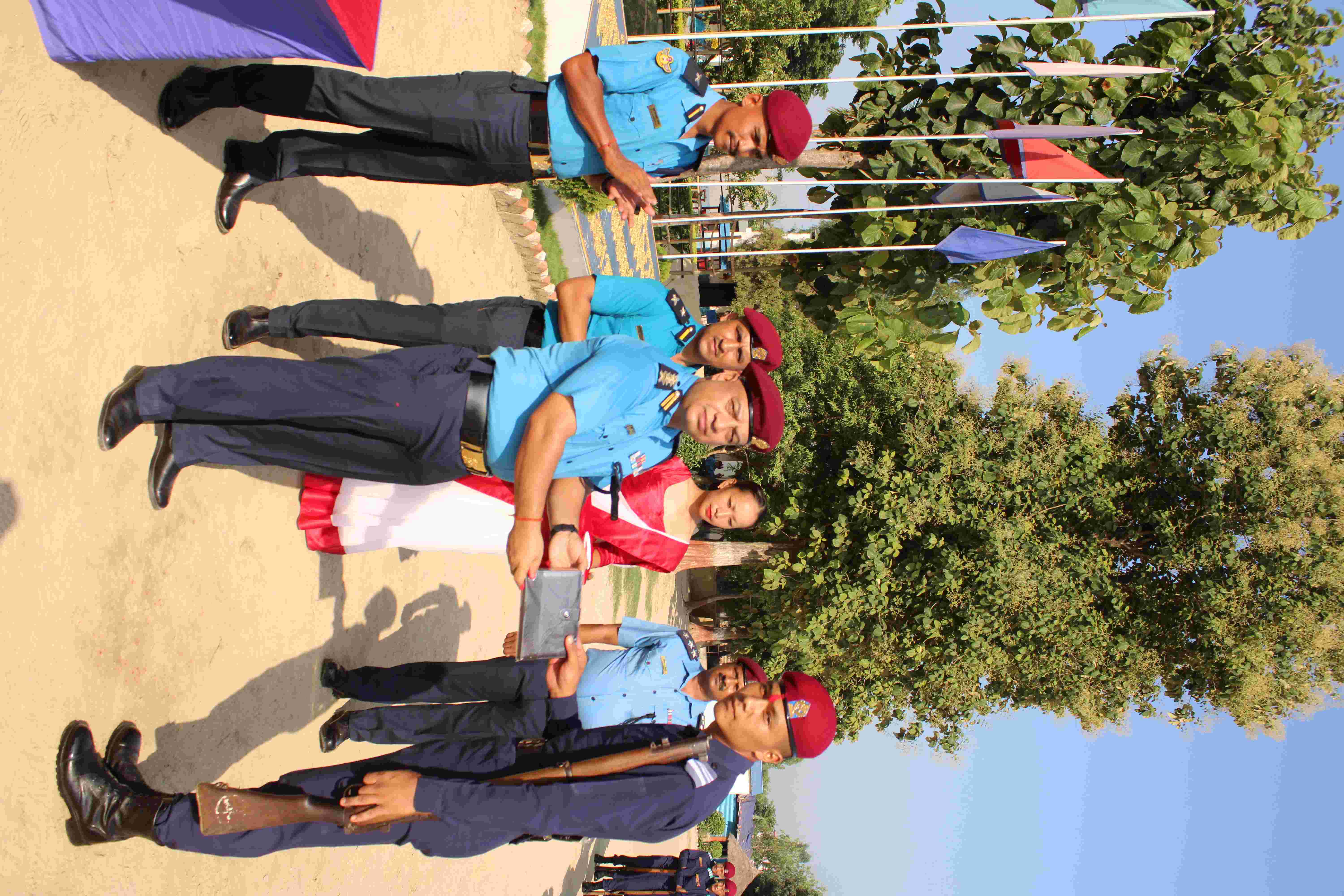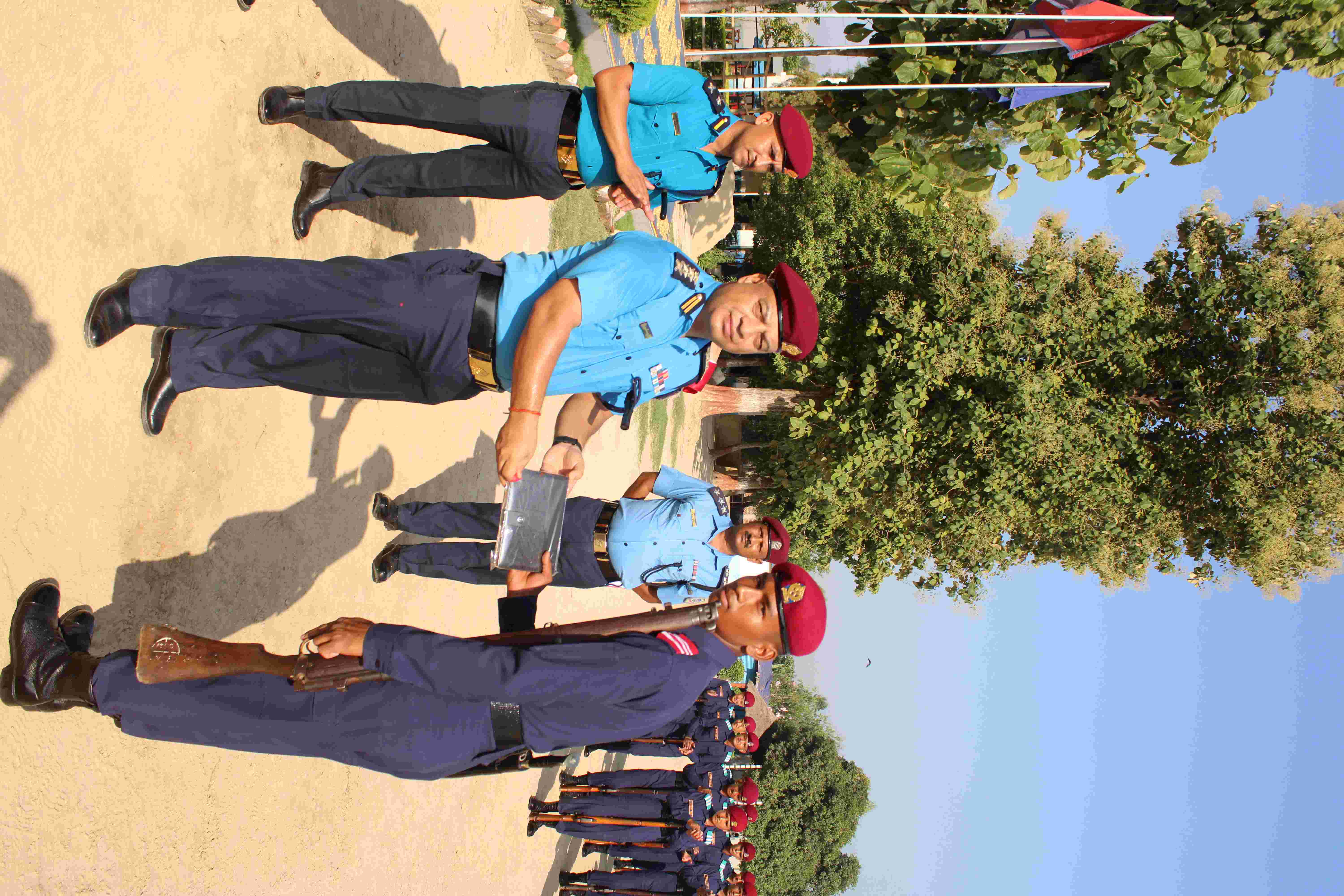 प्रहरी जवान आधारभुत (५-०४) औँ तालिम समुहमा प्रशिक्षणरत प्रशिक्षार्थीहरु पाठ्यक्रम बमोजिम दोश्रो र तेस्रो चरणमा विभिन्न विधामा उत्कृष्ट प्रशिक्षार्थीहरुलाई पुरस्कार वितरण गर्नुहुँदै यस केन्द्रका समादेशक प्र.ब.उ.ईश्वर कार्कीज्यू ।