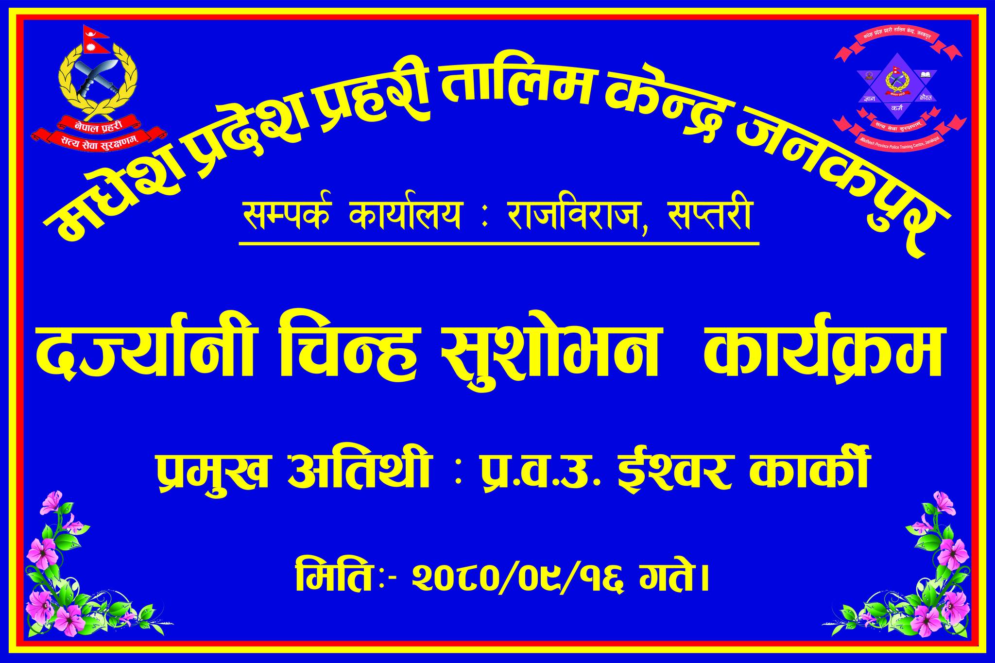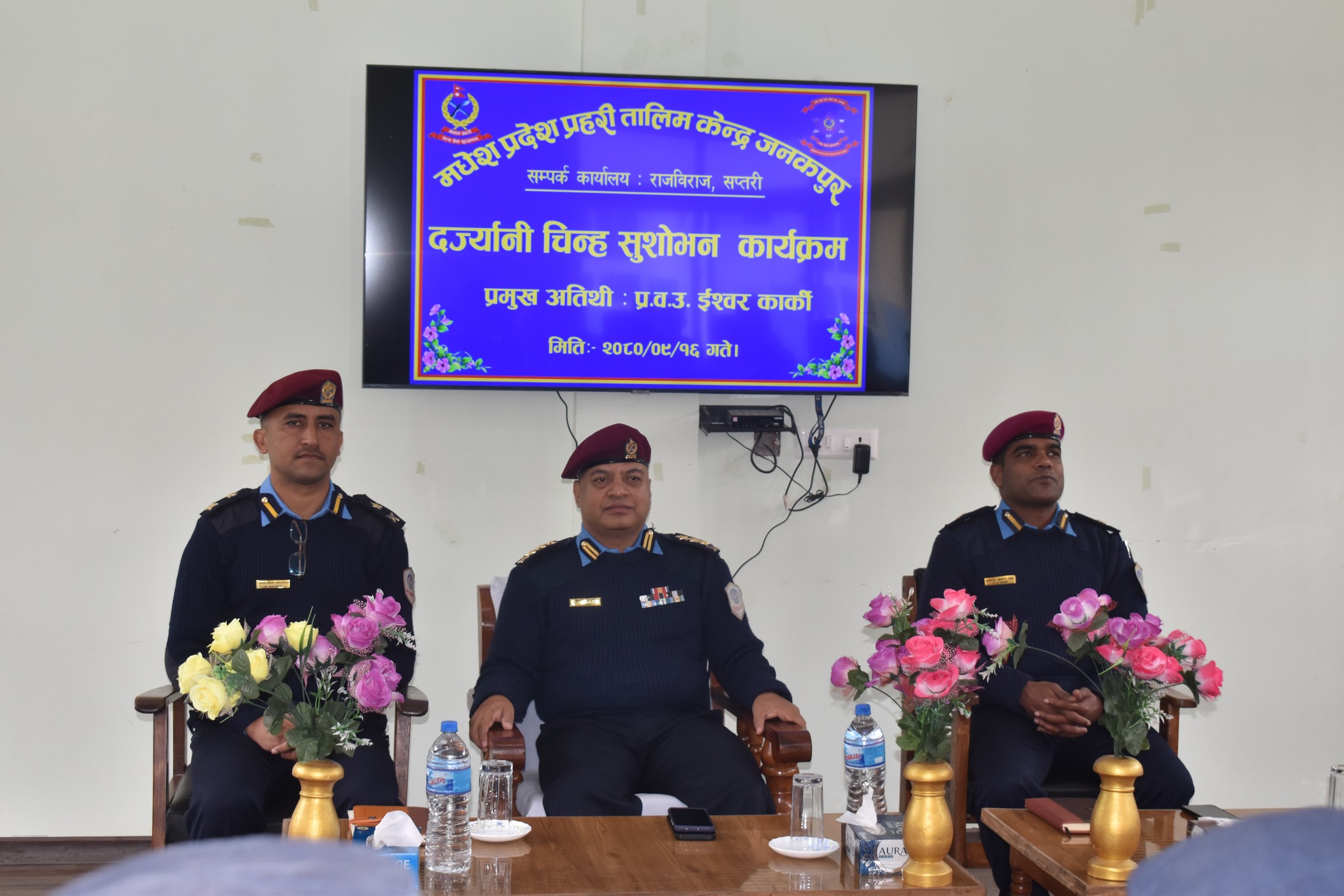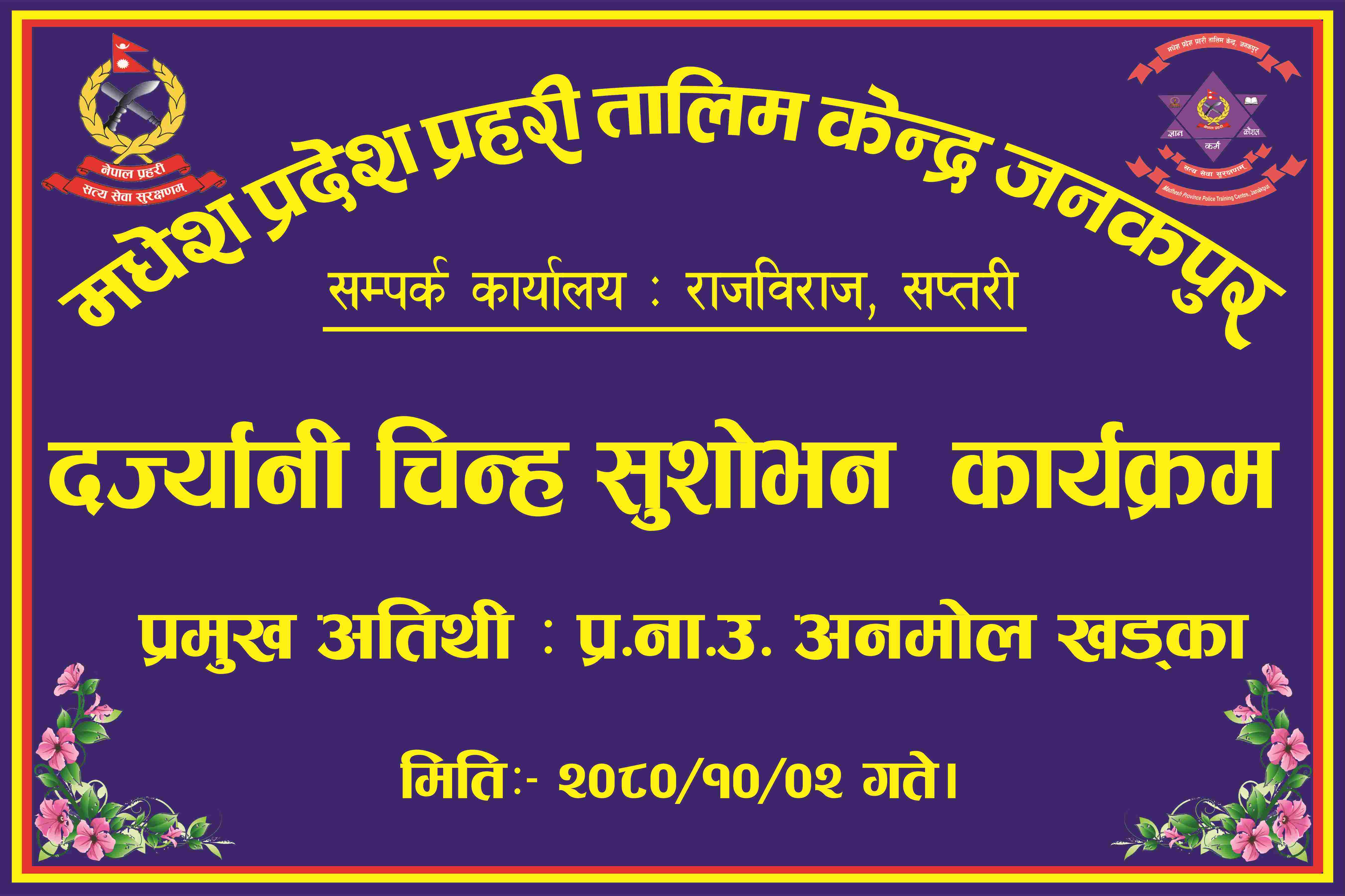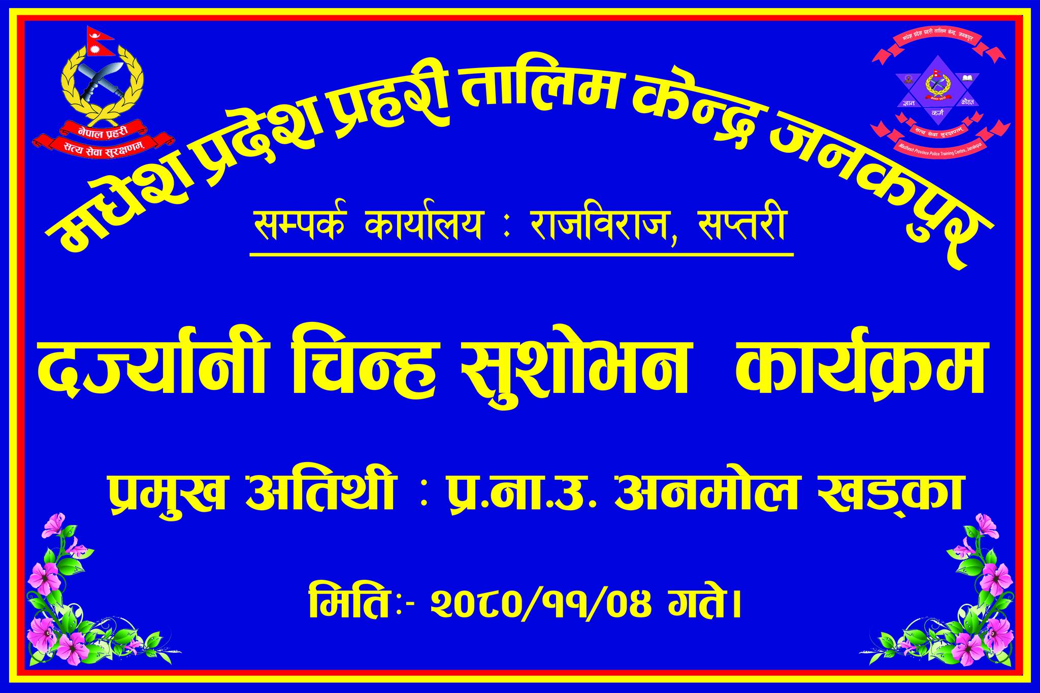 तालुक नेपाल प्रहरी प्रधान कार्यालय मानव श्रोत विकास विभाग कर्मचारी प्रशासन शाखाको च.नं.३७५५ मिति २०८०।०९।२९ गते पत्र आदेश अनुसार प्रहरी नियमवाली, २०७१ (संशोधन सहित) को नियम १२७ को उपनियम १ को (घ) बमोजिम प्रहरी नायव निरीक्षक पदमा एक तह पदोन्नती गरिएका प्रहरी नायव निरीक्षक जगत बहादुर तामाङलाई आज मिति २०८०।१०।०२ गते यस मधेश प्रदेश प्रहरी तालिम केन्द्र, जनकपुर सम्पर्क कार्यालय: राजविराजका निमित्त समादेशक प्रहरी नायव उपरीक्षक अनमोल खड्काज्यूको प्रमुख आतिथ्यतामा दर्ज्यानी चिन्हबाट सुशोभन कार्यक्रम ।