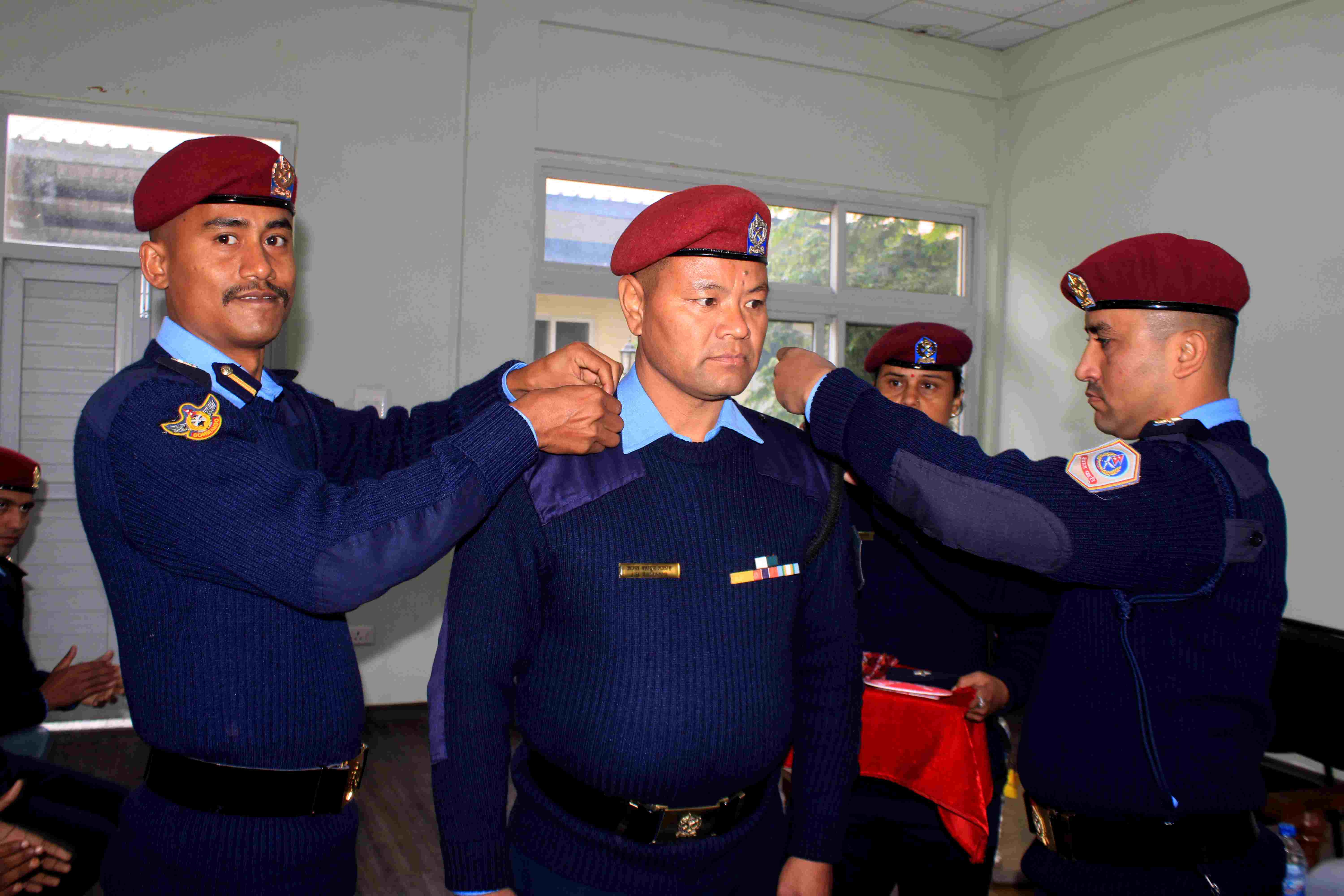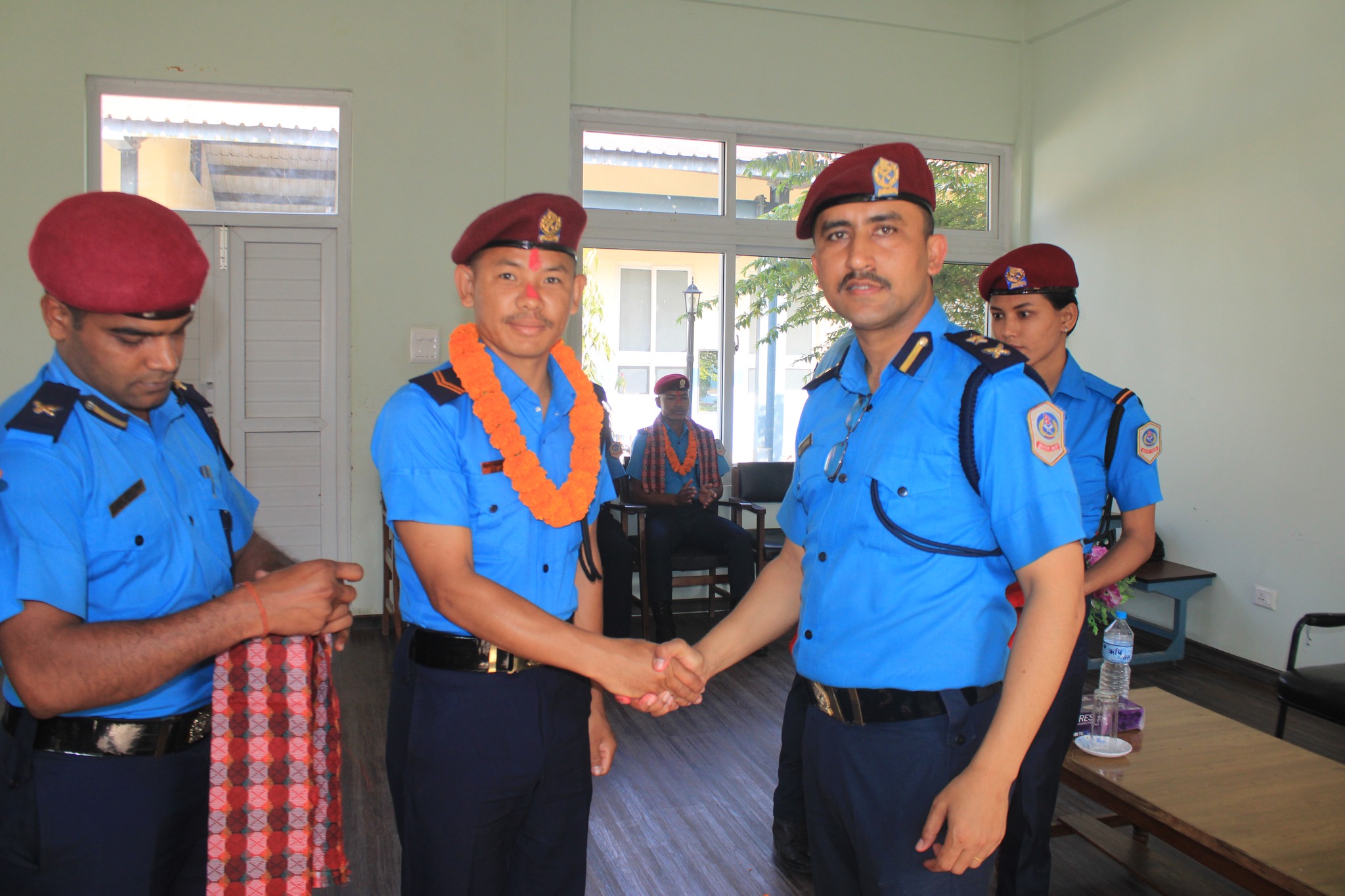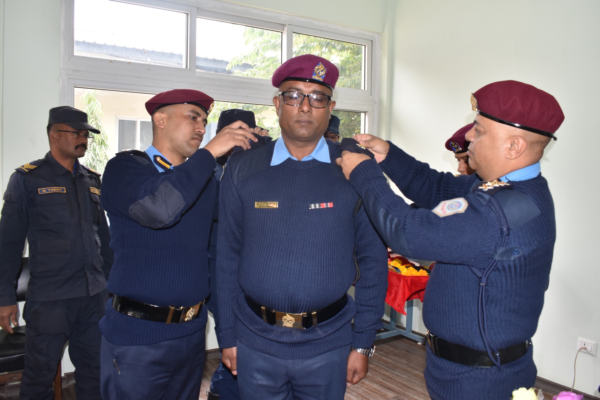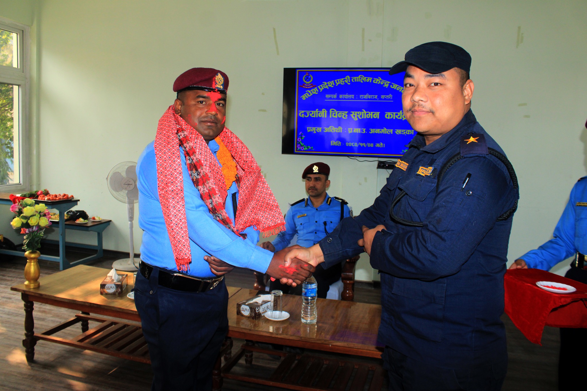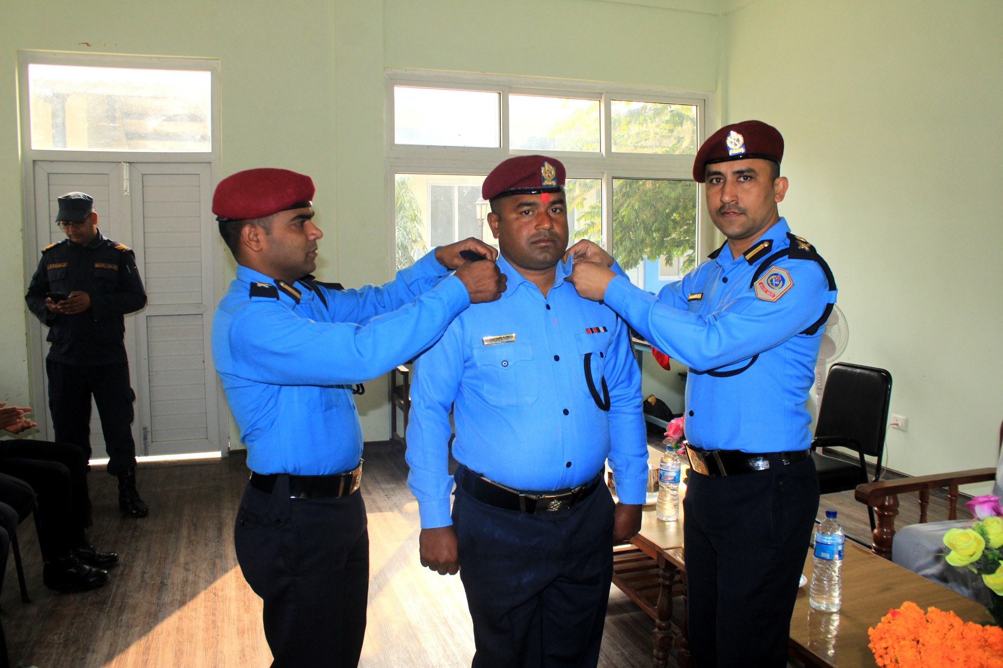 जनपद समूह तर्फको प्रहरी सहायक हवल्दार पदबाट बढुवा हुनु भएका प्रहरी हवल्दार अशोक कुमार यादवलाई आज एक कार्यक्रमका बीच यस केन्द्रका सह-समादेशक प्रहरी नायव उपरीक्षक श्री अनमोल खड्काज्यूले दर्ज्यानी चिन्हद्वारा सुशोभन गरी शुभकामना दिई निर्देशन सम्बोधन समेत गर्नुभयो ।
