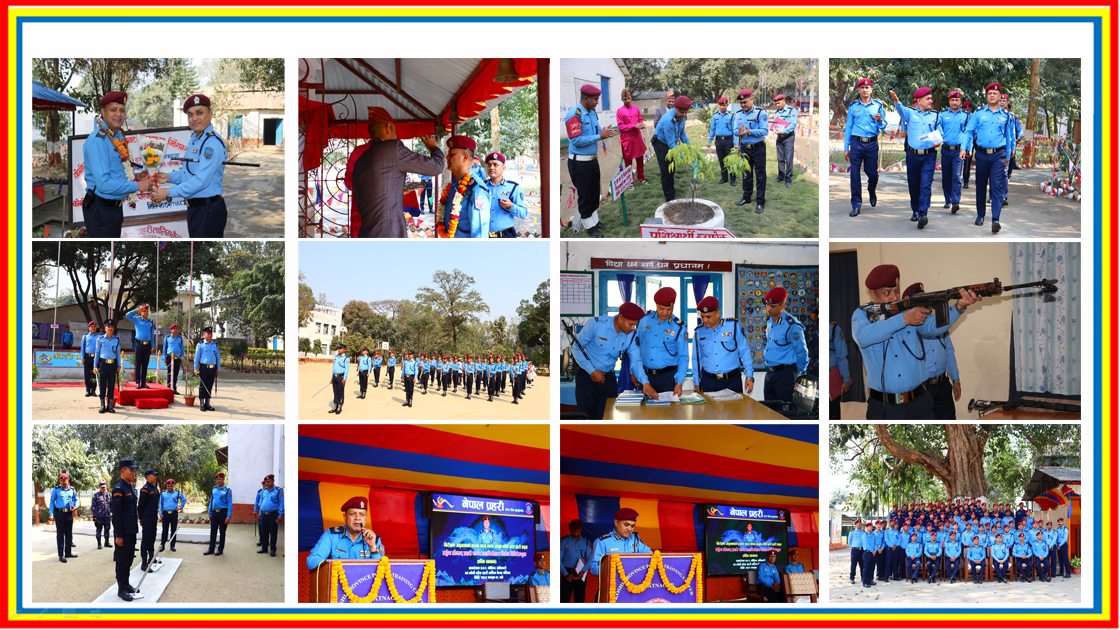 - प्र.स.नि. आधारभूत (अल्पकालिन) तालिम ४-१९० औं समूहको अन्तरक्रिया तथा समापन कार्यक्रम सम्पन्न:(२०८२ फागुन ०१ गते): मिति २०८२ का पुस १६ गतेबाट यस तालिम केन्द्रमा संचालित ३५ कार्यदिन अवधिको प्र.स.नि. आधारभूत (अल्पकालिन) तालिम ४-१९० औं समूहको आज मिति २०८२ फागुन ०१ गते यस केन्द्रका समादेशक प्रहरी वरिष्ठ उपरीक्षक गोविन्द अधिकारीज्यूको प्रमुख आतिथ्यमा अन्तरक्रिया तथा समापन कार्यक्रम सु-सम्पन्न भयो । साथै दीक्षित भई जाने प्रहरी जवानहरुलाई प्रमुख अतिथिज्यूले शुभ-कामना एवं बधाई दिंदै प्रशिक्षणका दौरानमा सिकेका सैद्धान्तिक तथा व्यवहारीक कुराहरु समाज र संगठनले अपेक्षा गरे अनुरुप अनुशासित, इमान्दारी पूर्वक कर्तव्यनिष्ठ भई कार्यक्षेत्रमा कार्यन्वयन गर्नुहुन समेत निर्देशन दिनु भयो । उक्त कार्यक्रममा यस केन्द्रका सह-समादेशक तथा तालिम संयोजक गुरू प्रसाद तिम्सिनाज्यू, प्रहरी निरीक्षकज्यूहरु, जुनियर प्रहरी अधिकृतहरु, प्रशिक्षक वर्गहरु, लगायत प्रशिक्षार्थीहरु समेतको उपस्थिति रहेको थियो ।